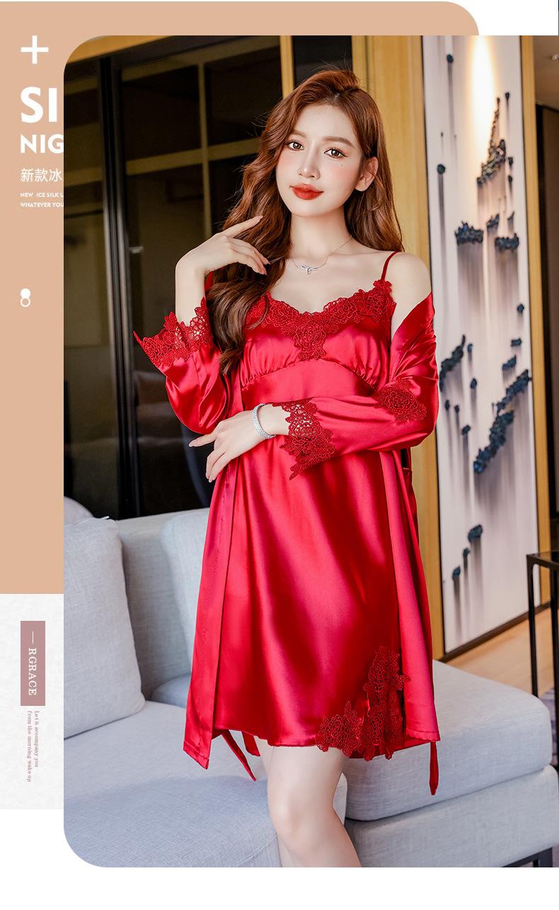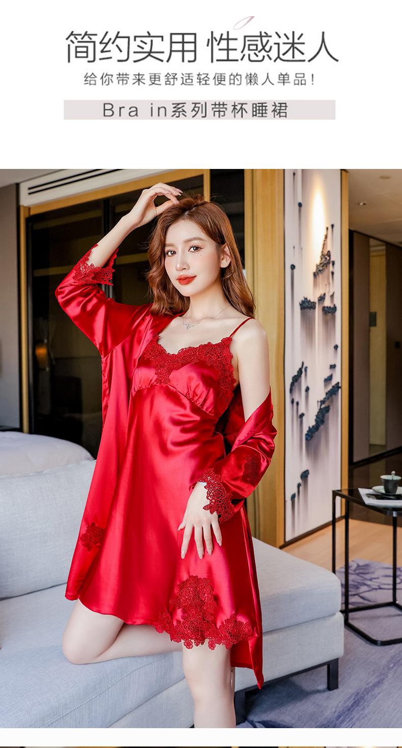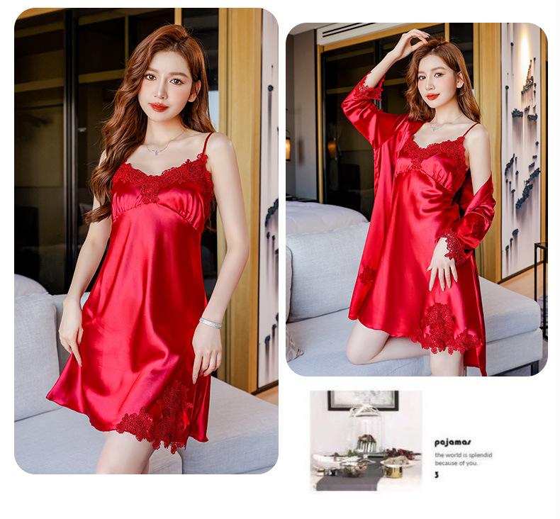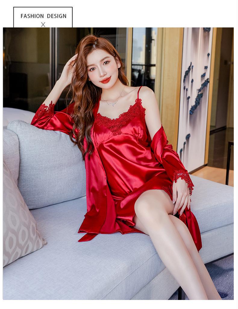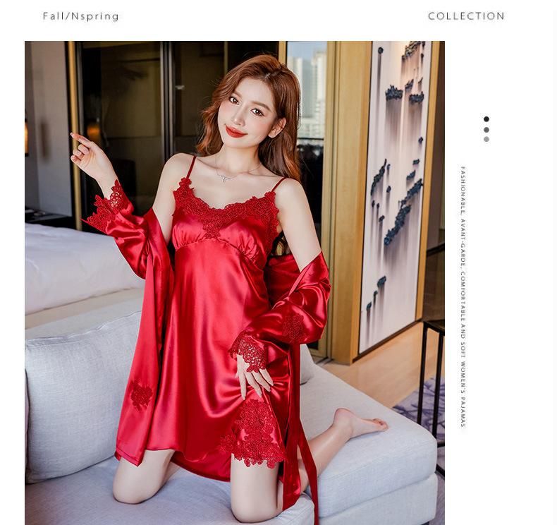 Pijama de seda sintética para mujer, camisón de seda de manga larga con almohadilla para el pecho, sexy, de encaje, conjunto de dos piezas, primavera y verano