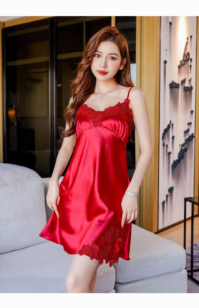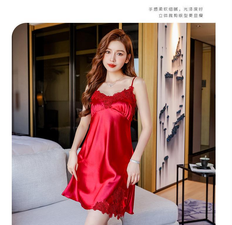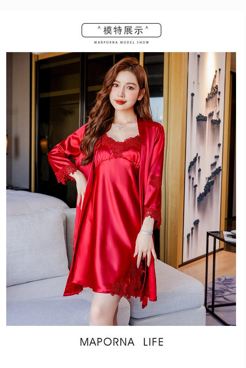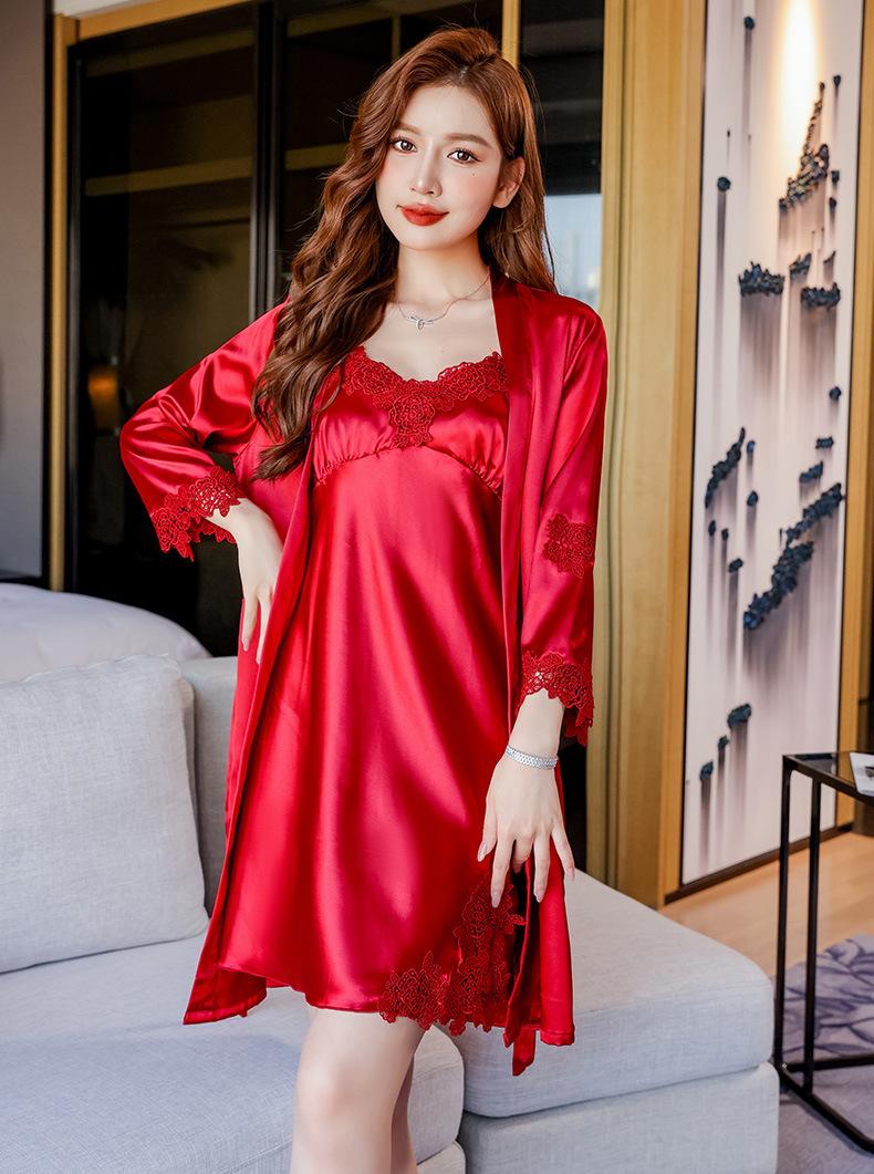 Pijama de seda sintética para mujer, camisón de seda de manga larga con almohadilla para el pecho, sexy, de encaje, conjunto de dos piezas, primavera y verano