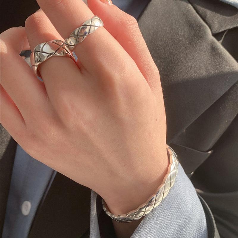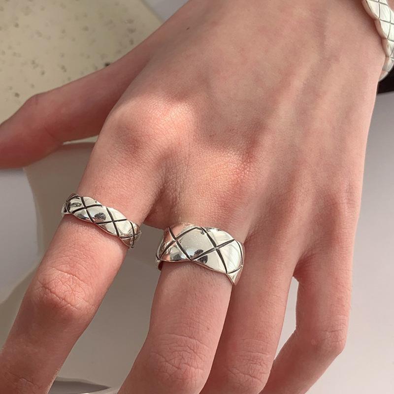 Anillo de Rejilla Geométrica de Plata S925 Estilo Coreano para Mujer Anillo Abierto de Onda Simple de Moda Retro Anillo de Dedo Hip Hop Moda