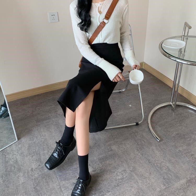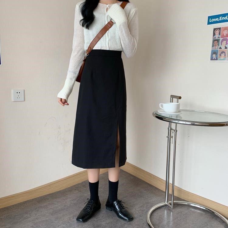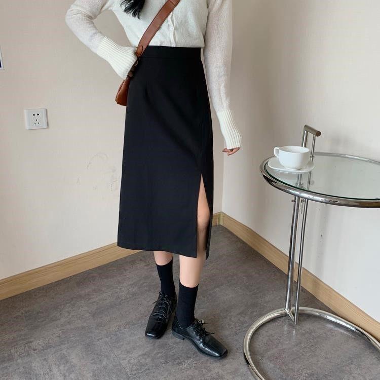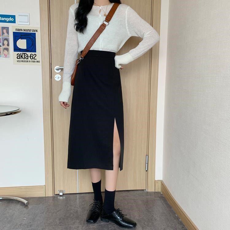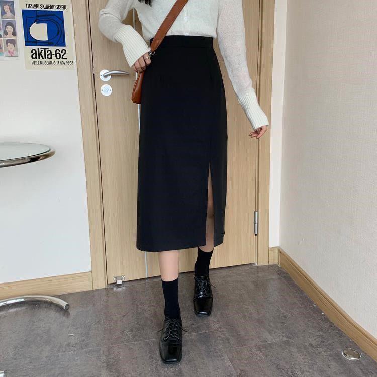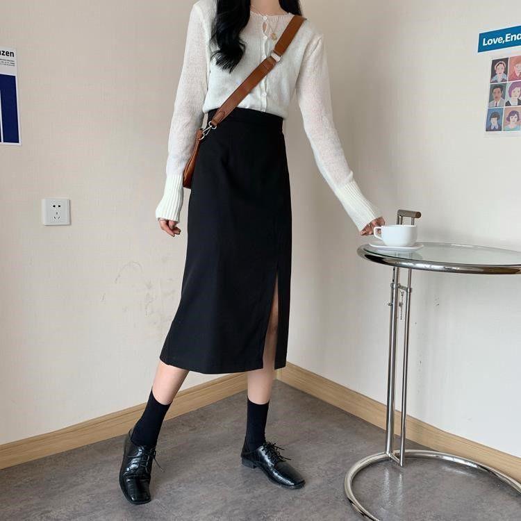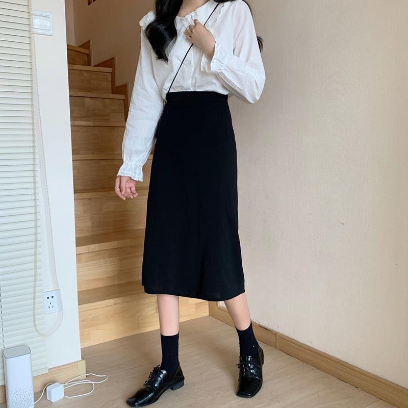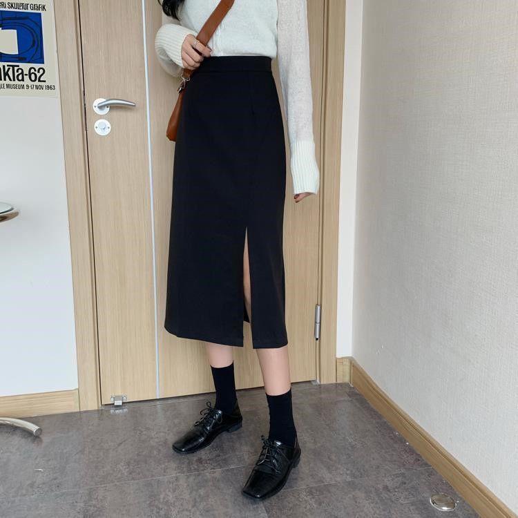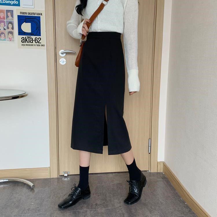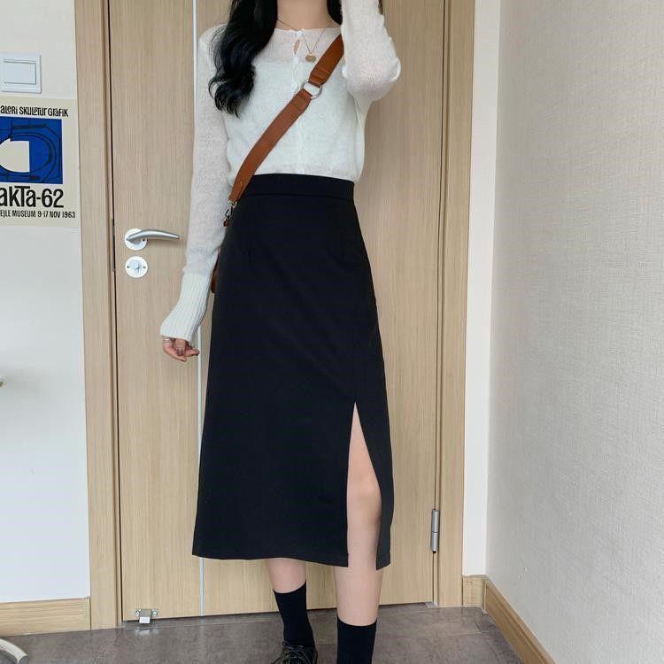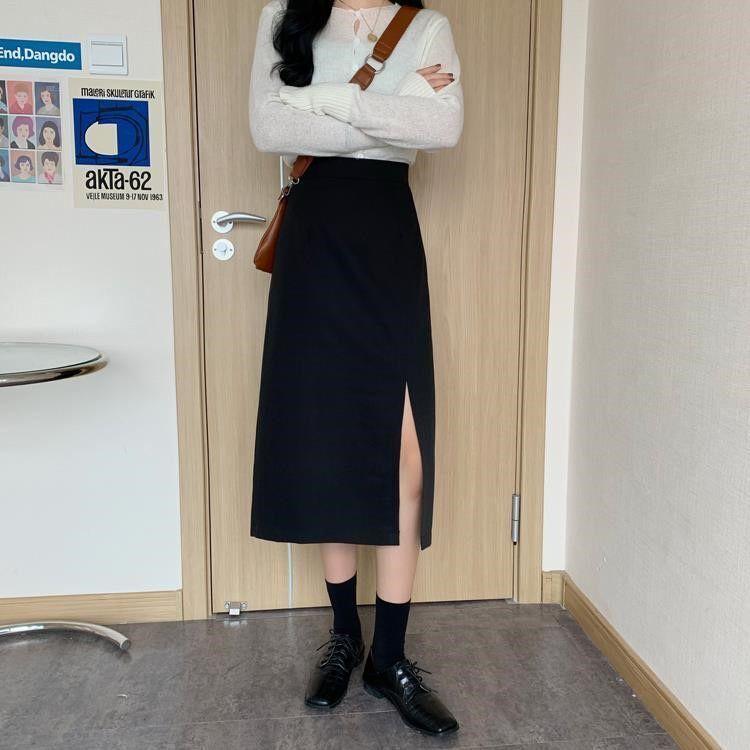 Falda negra mujer otoño 2021 estudiante cintura alta talla grande adelgazante abertura lateral media longitud falda línea A falda de cadera
