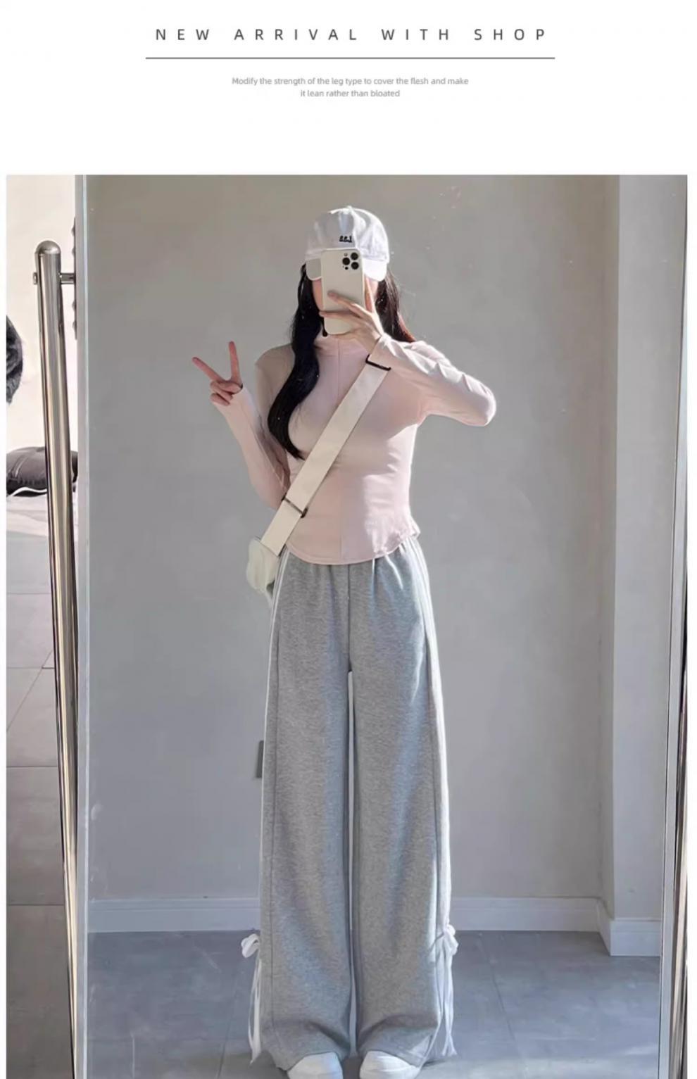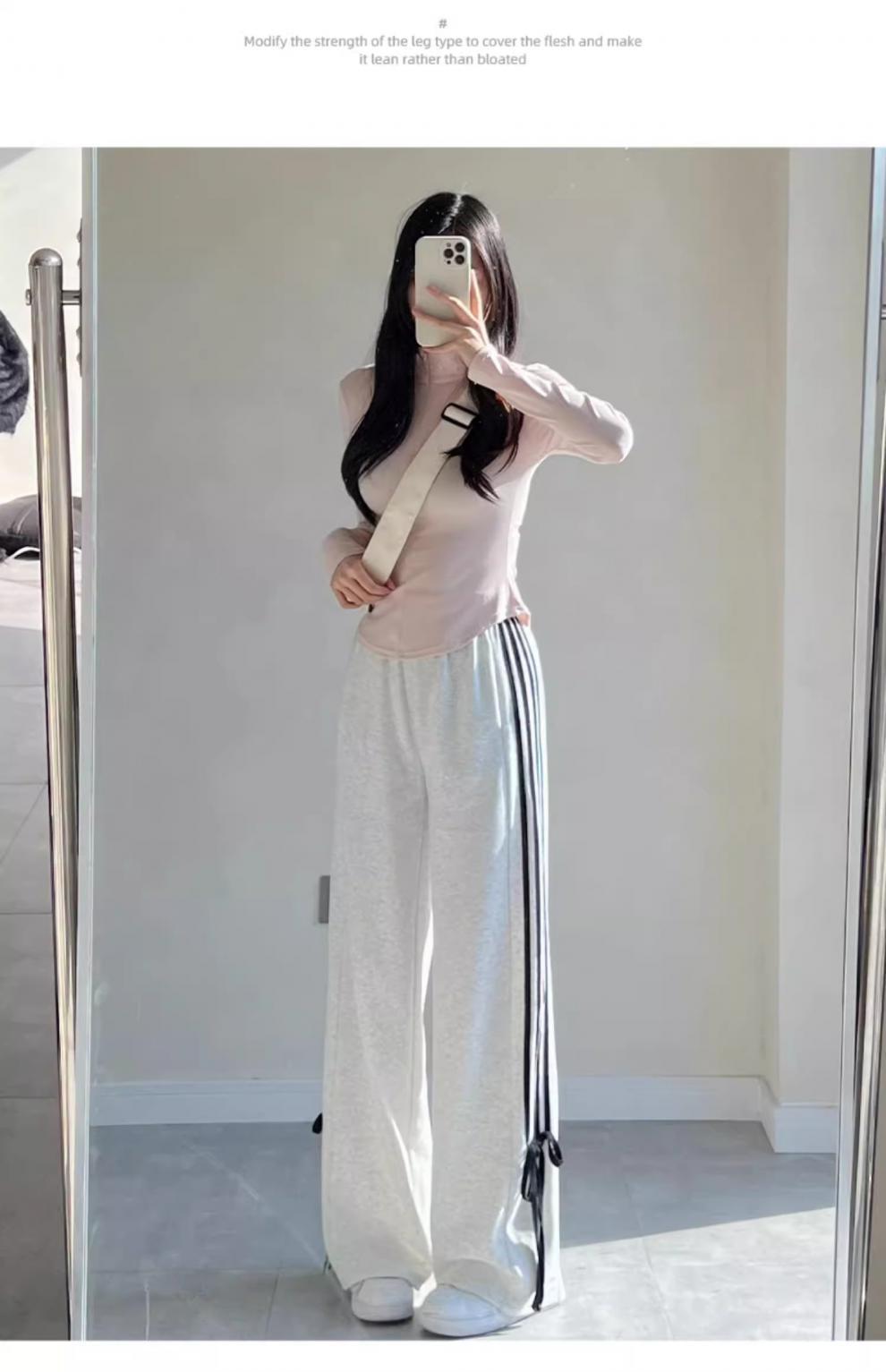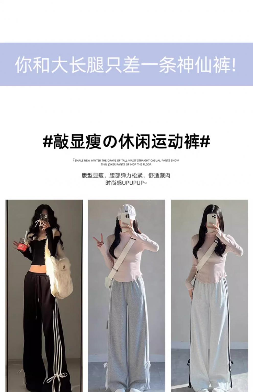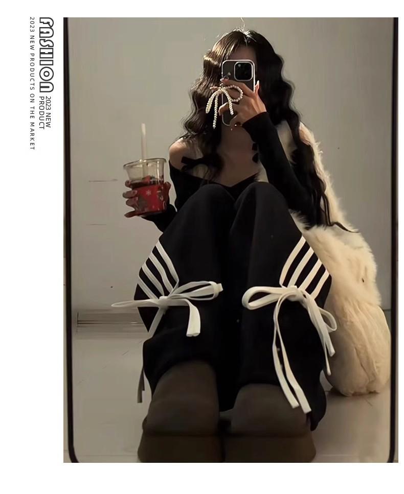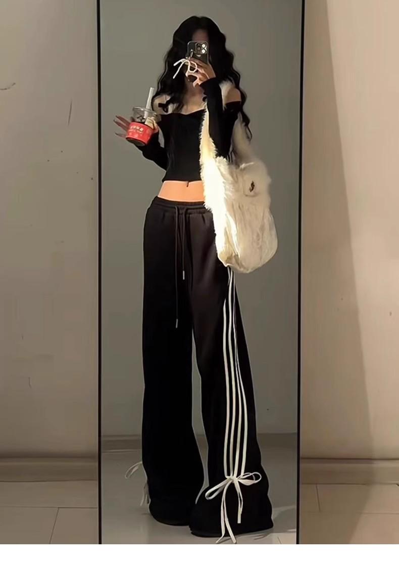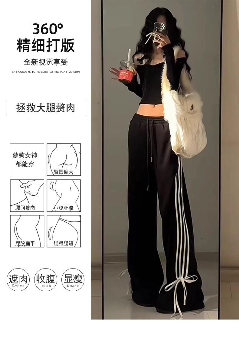 Pantalones negros con lazo para mujer, primavera y verano 2024, nuevos pantalones casuales rectos de pierna ancha, pantalones deportivos pequeños