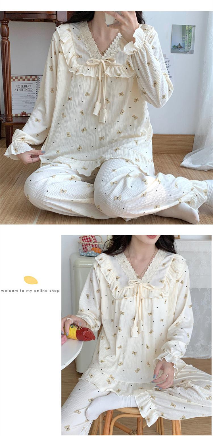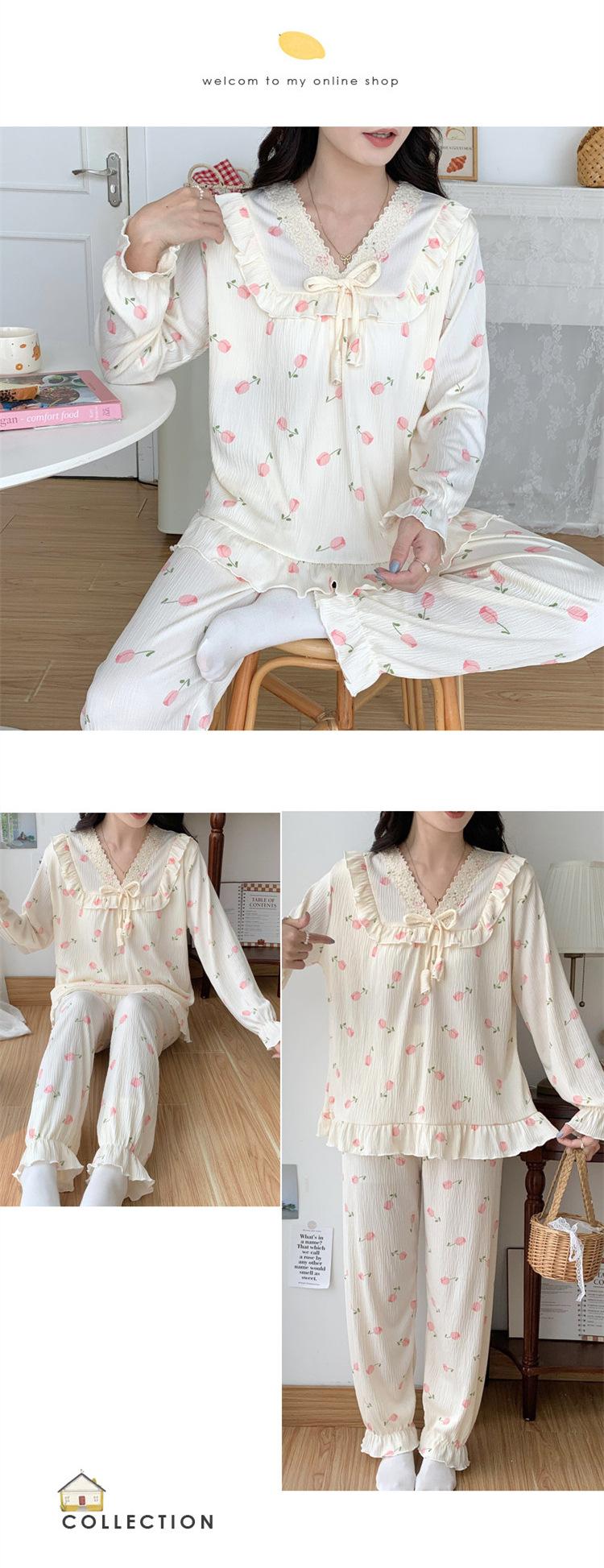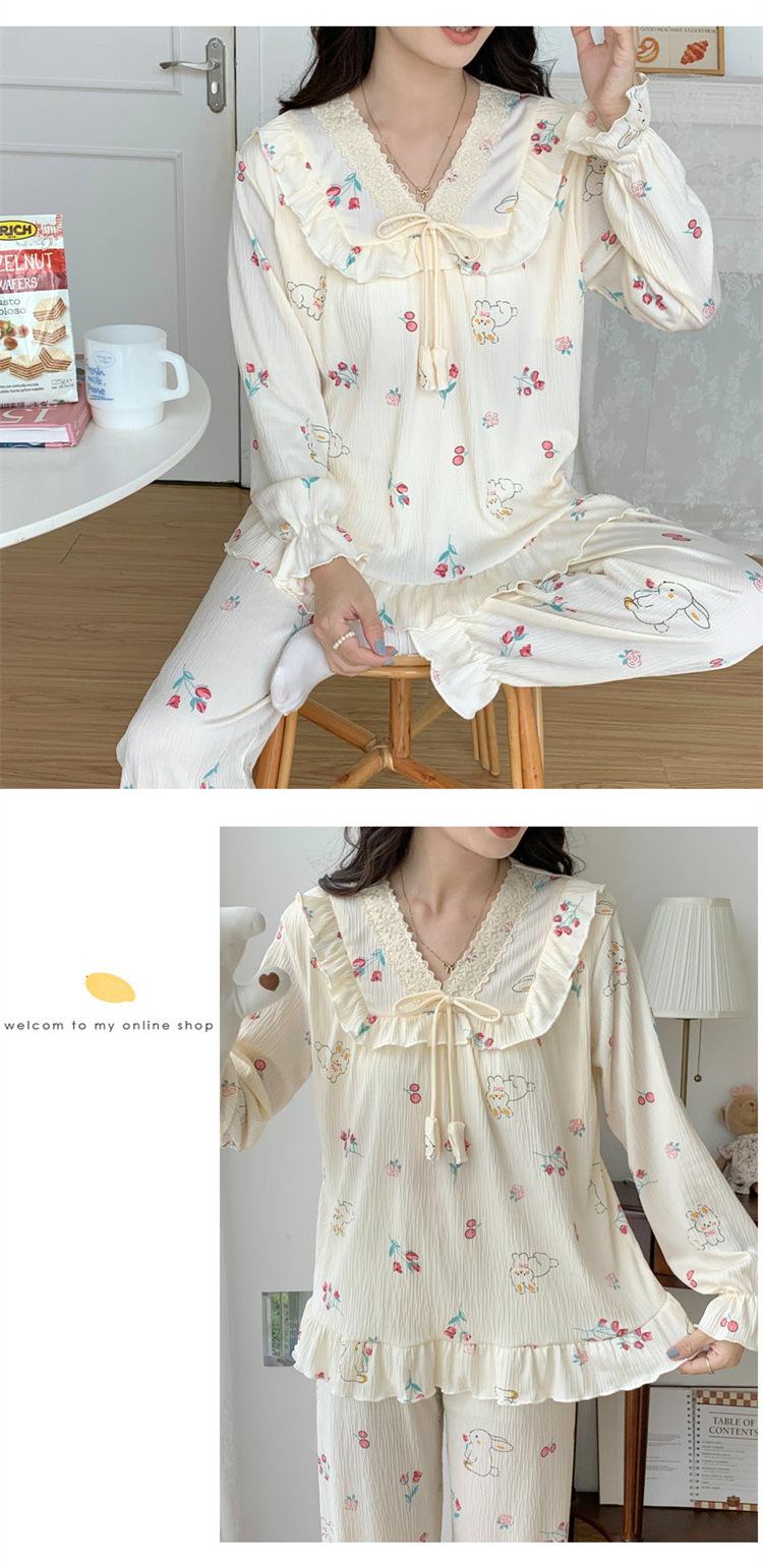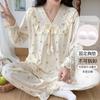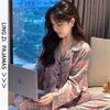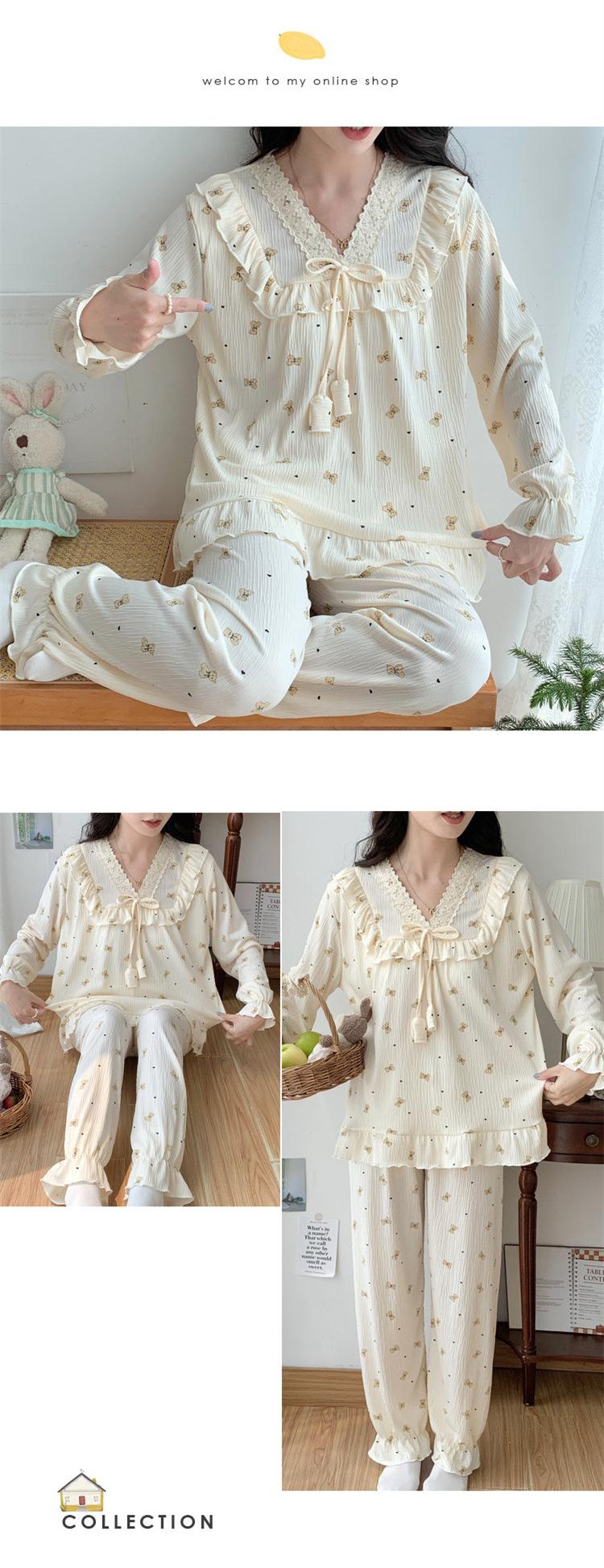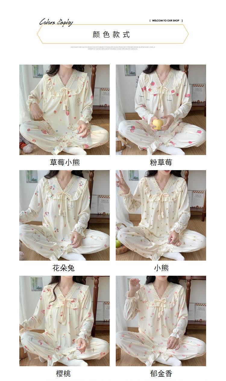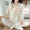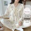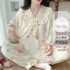 Pijamas de mujer de primavera y otoño con almohadilla para el pecho, pantalones de crepé de algodón de manga larga, ropa de casa de estilo princesa dulce y linda para usar en el exterior.