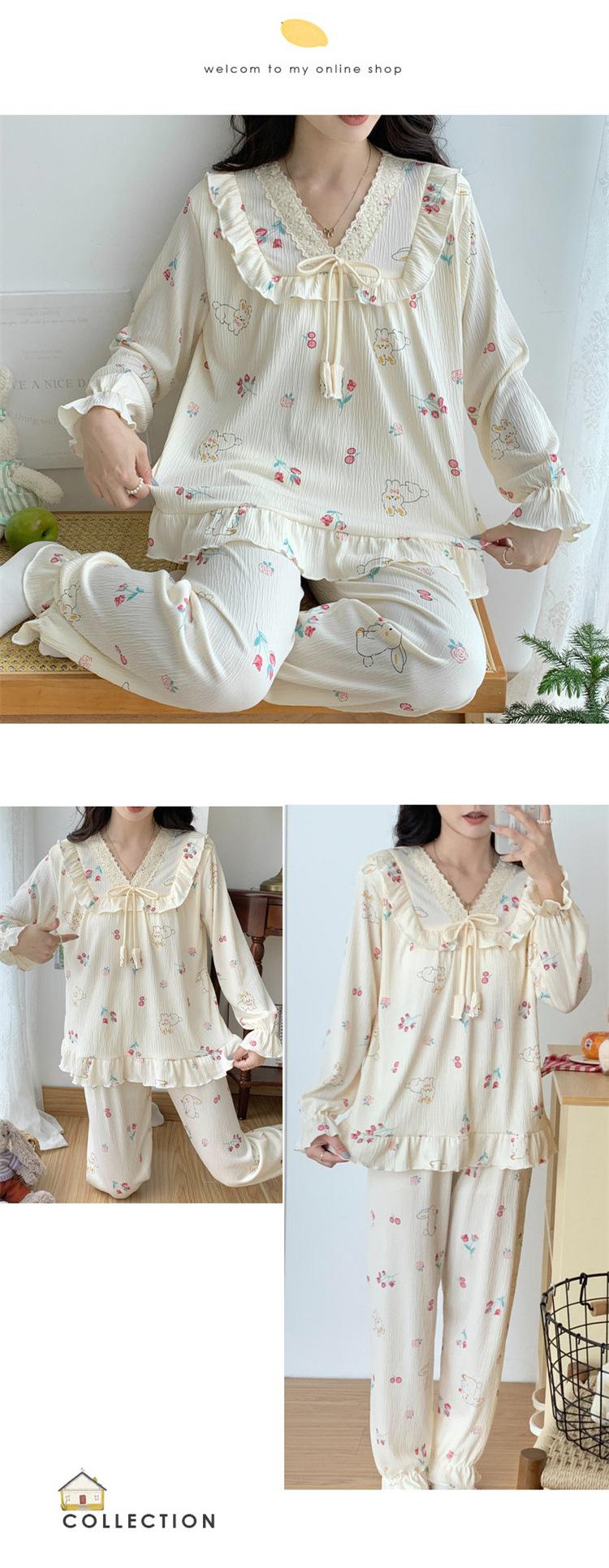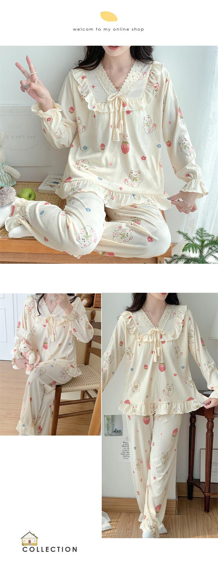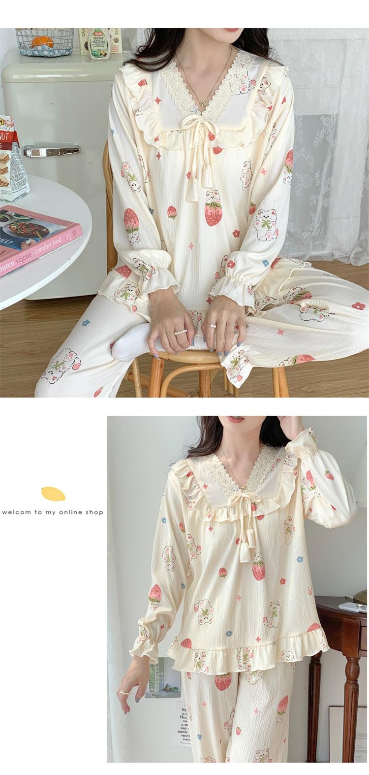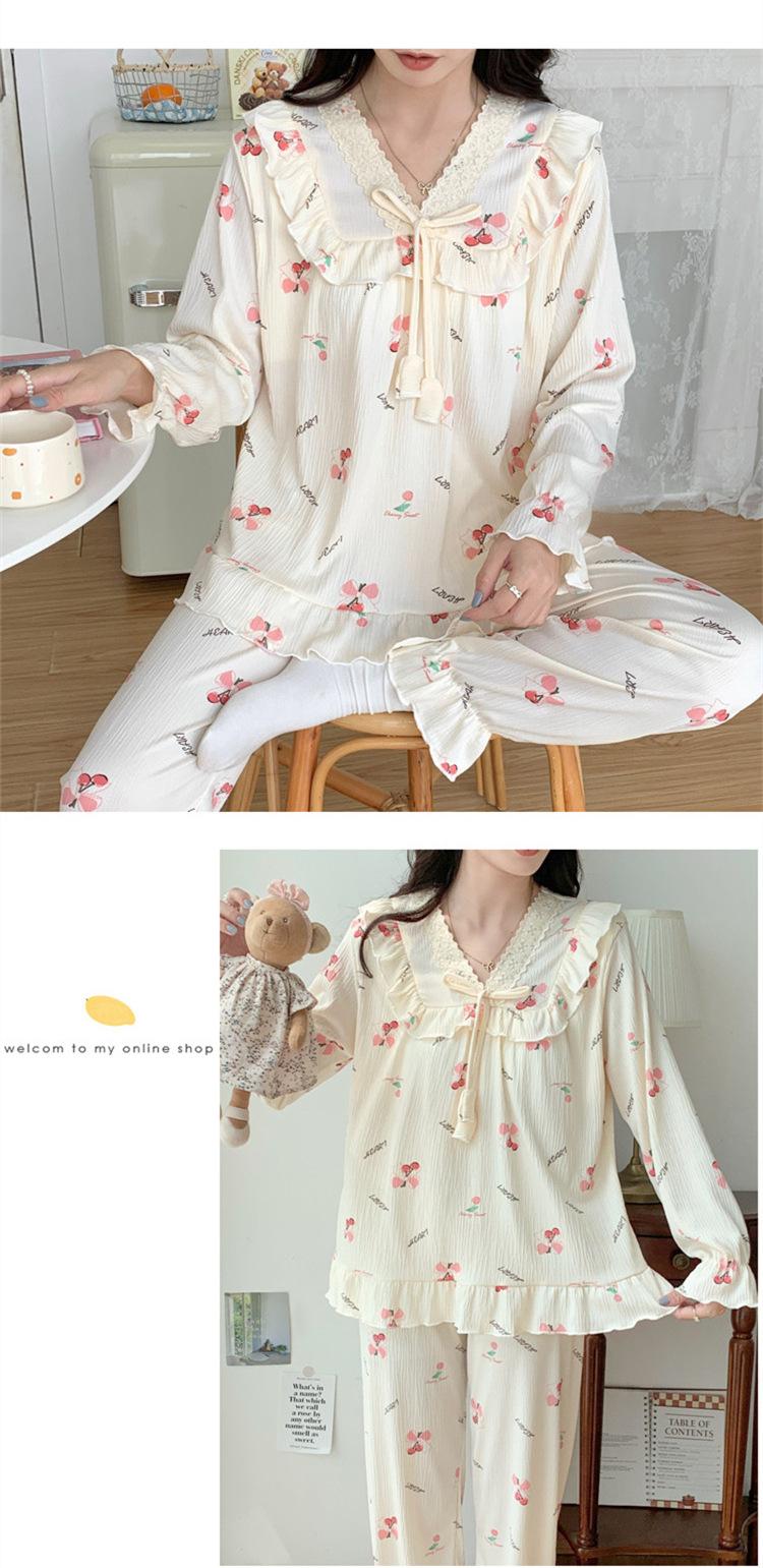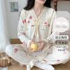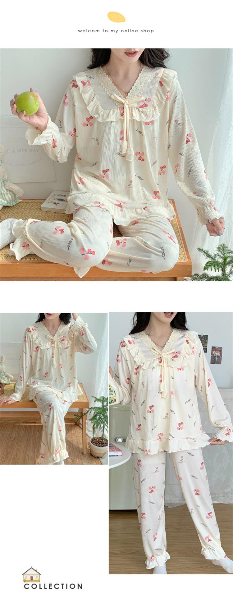 Pijamas de mujer de primavera y otoño con almohadilla para el pecho, pantalones de crepé de algodón de manga larga, ropa de casa de estilo princesa dulce y linda para usar en el exterior.