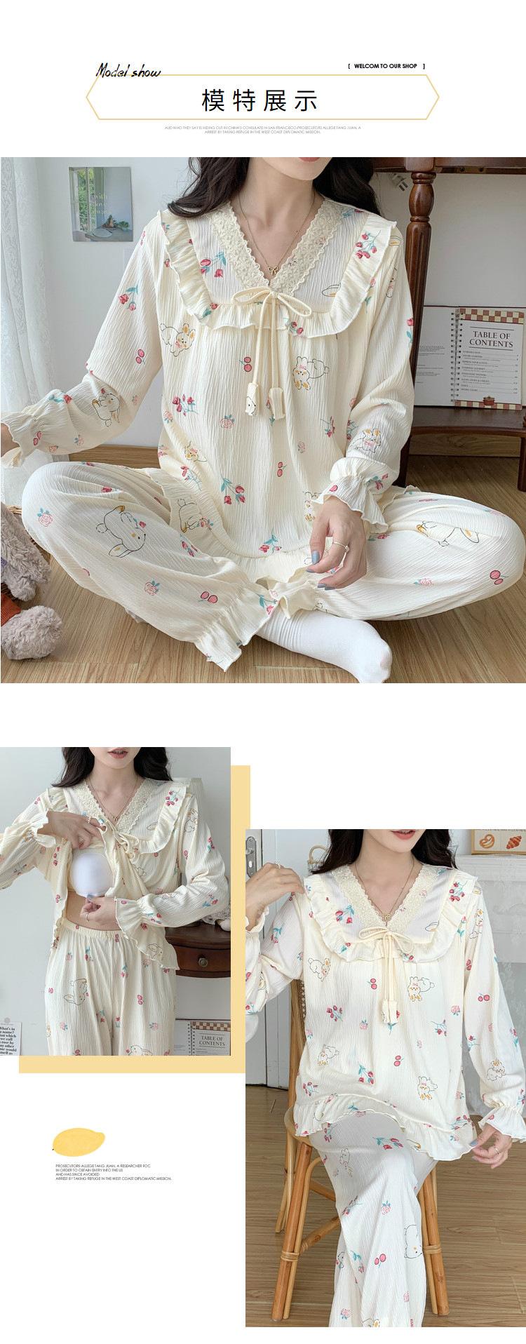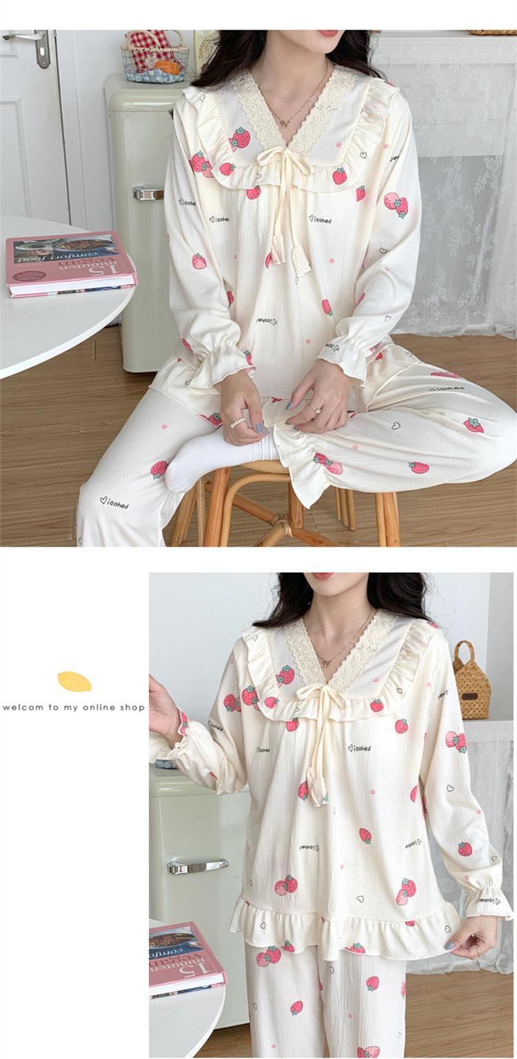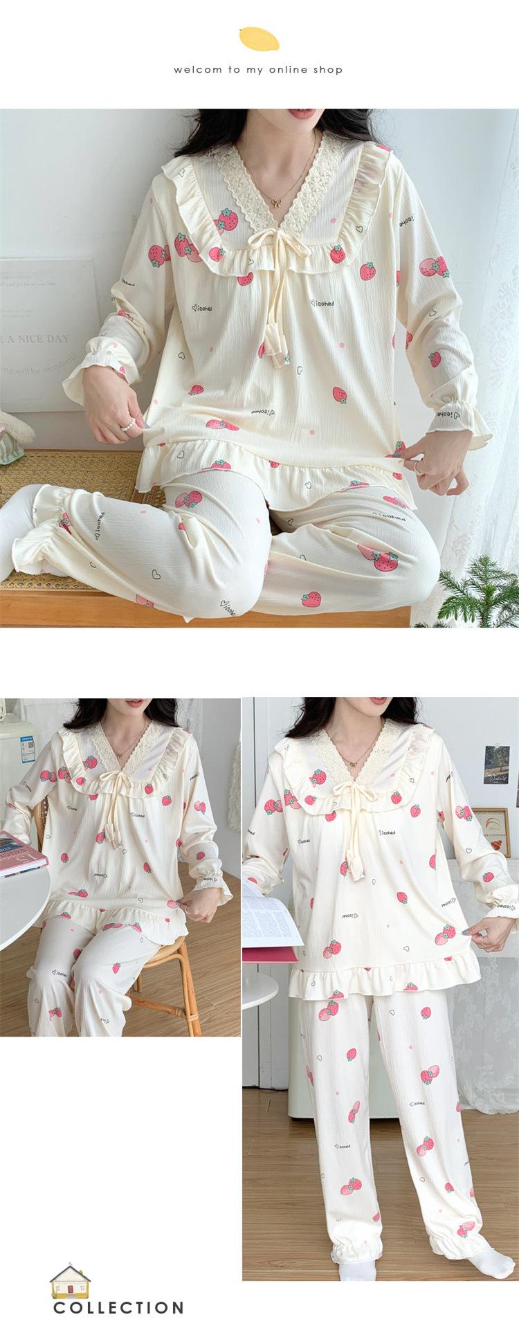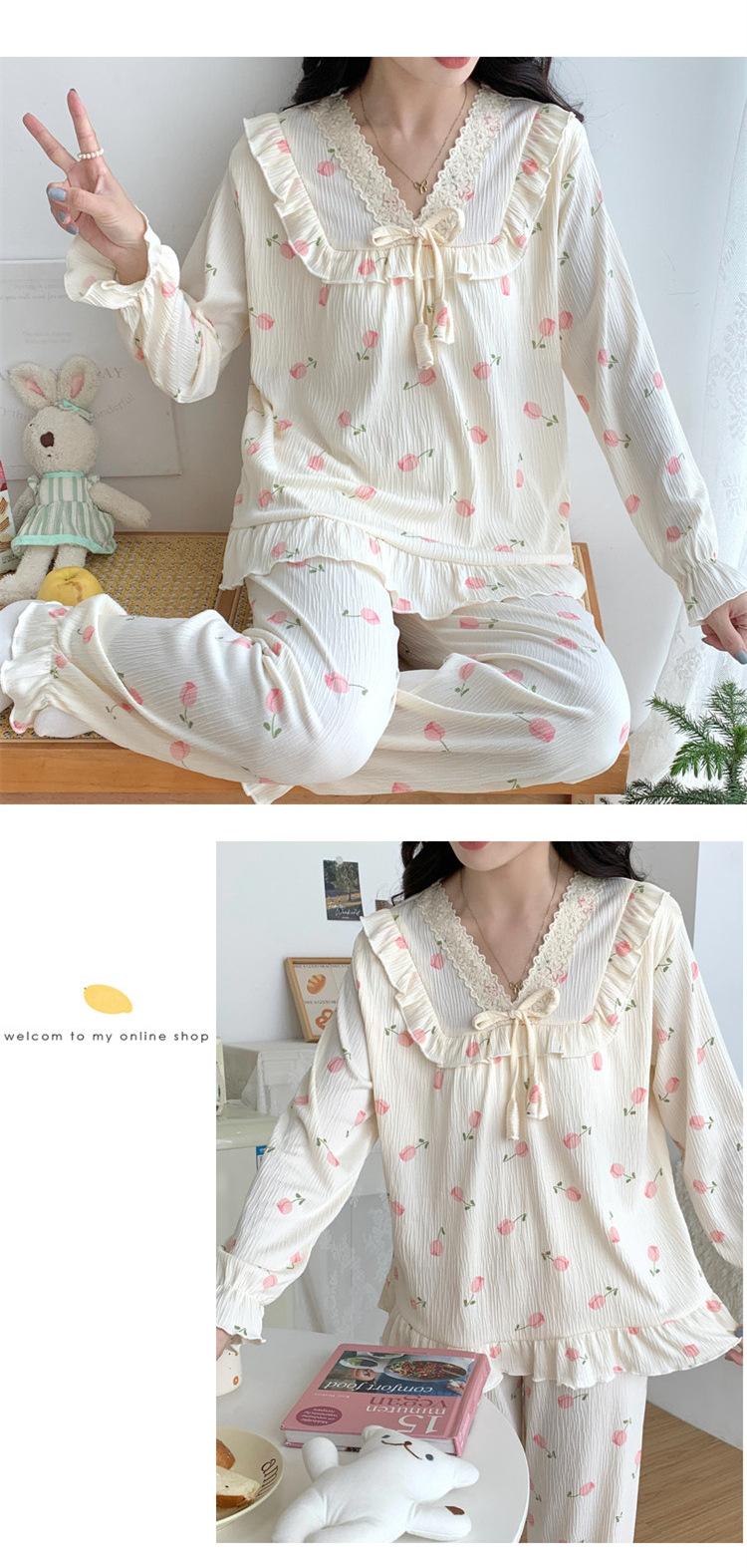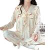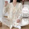 Pijamas de mujer de primavera y otoño con almohadilla para el pecho, pantalones de crepé de algodón de manga larga, ropa de casa de estilo princesa dulce y linda para usar en el exterior.