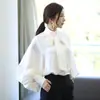 Camisa de gasa de color liso con mangas abullonadas y cordones para mujer, nueva moda de otoño, camisa holgada de manga larga