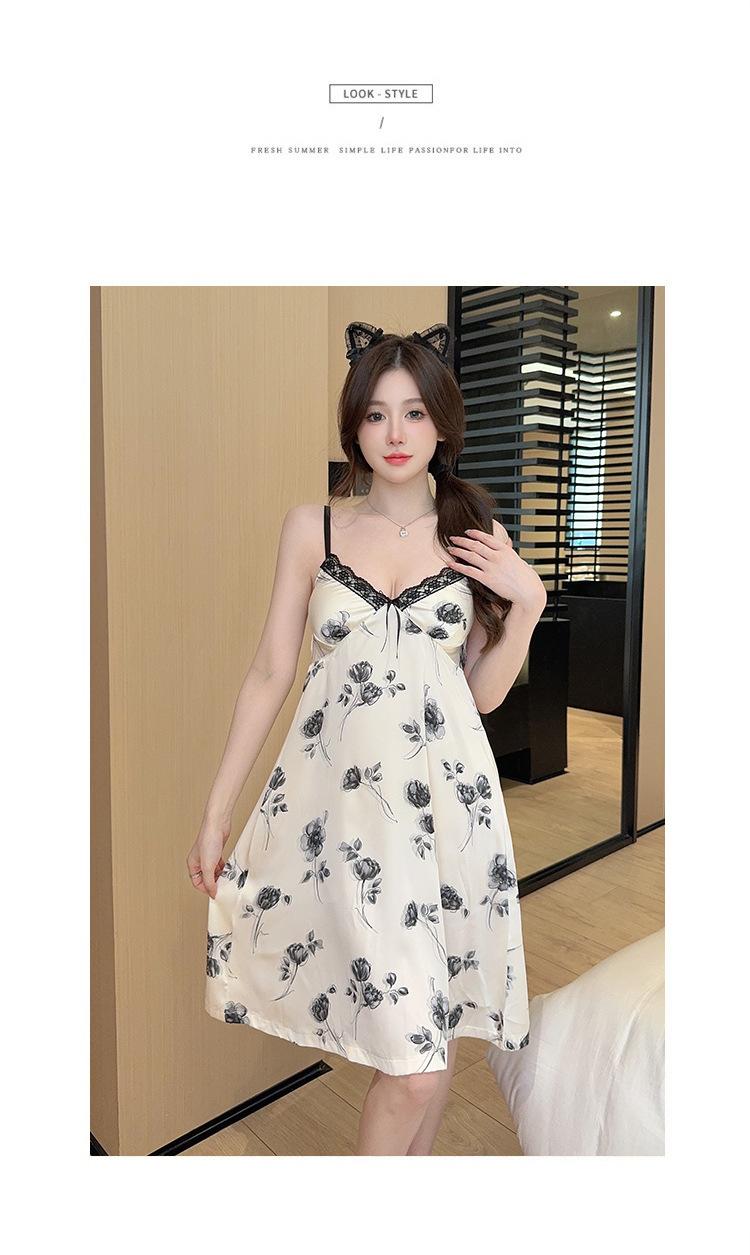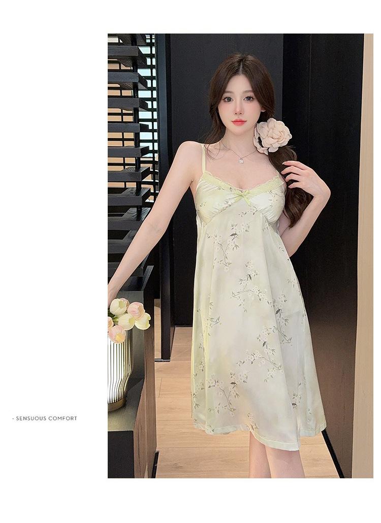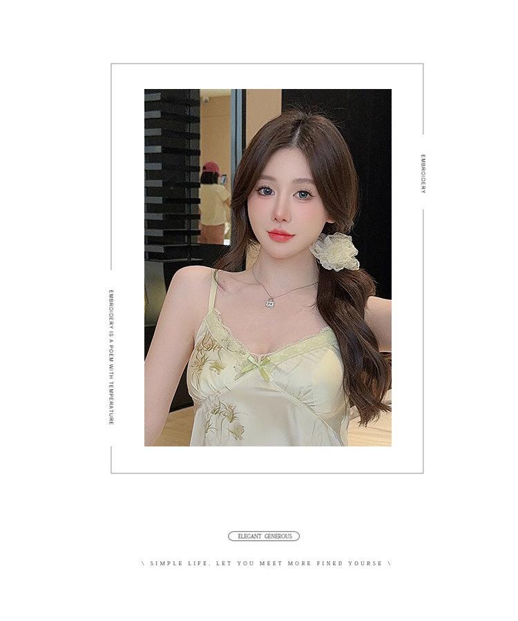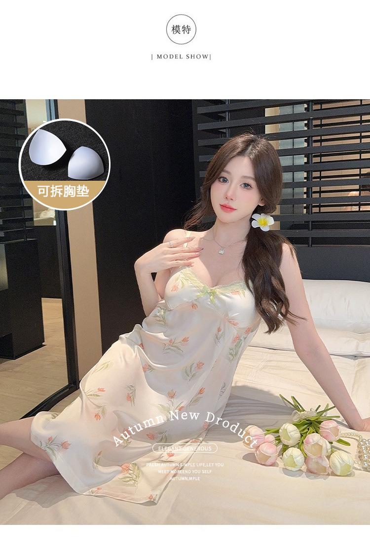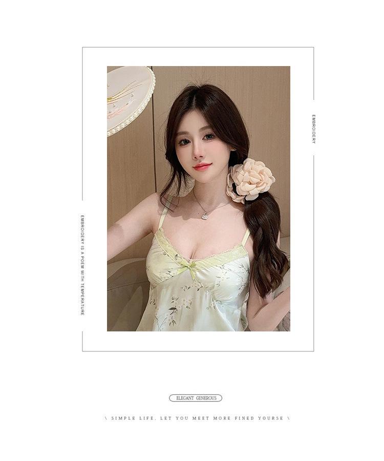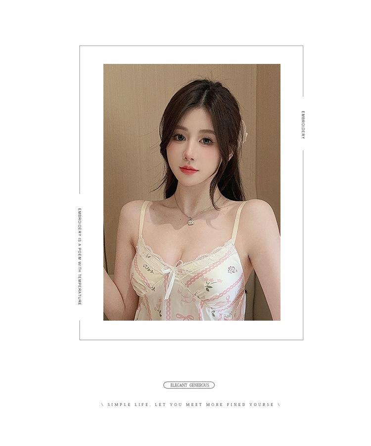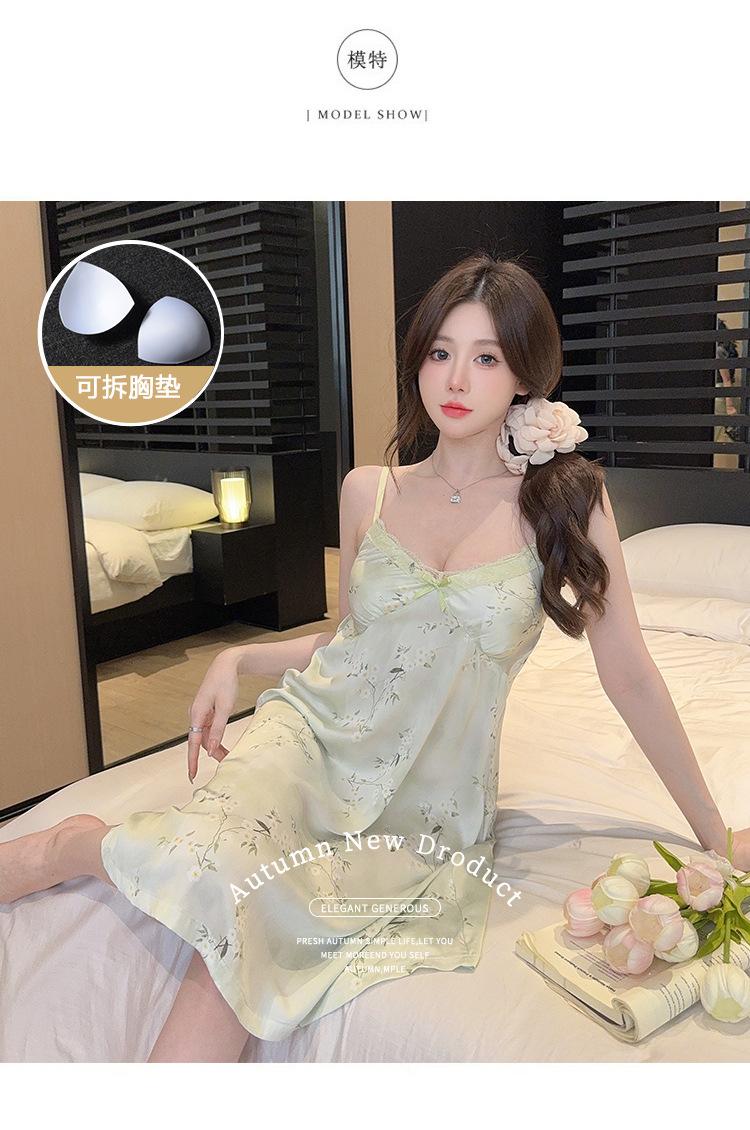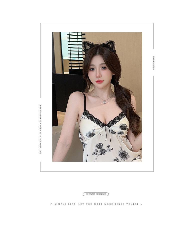 Camisón de Verano con Tirantes Cinta de Hielo Almohadilla de Pecho Removible Encaje Fino Estilo Puro Sexy Ropa de Casa Traje