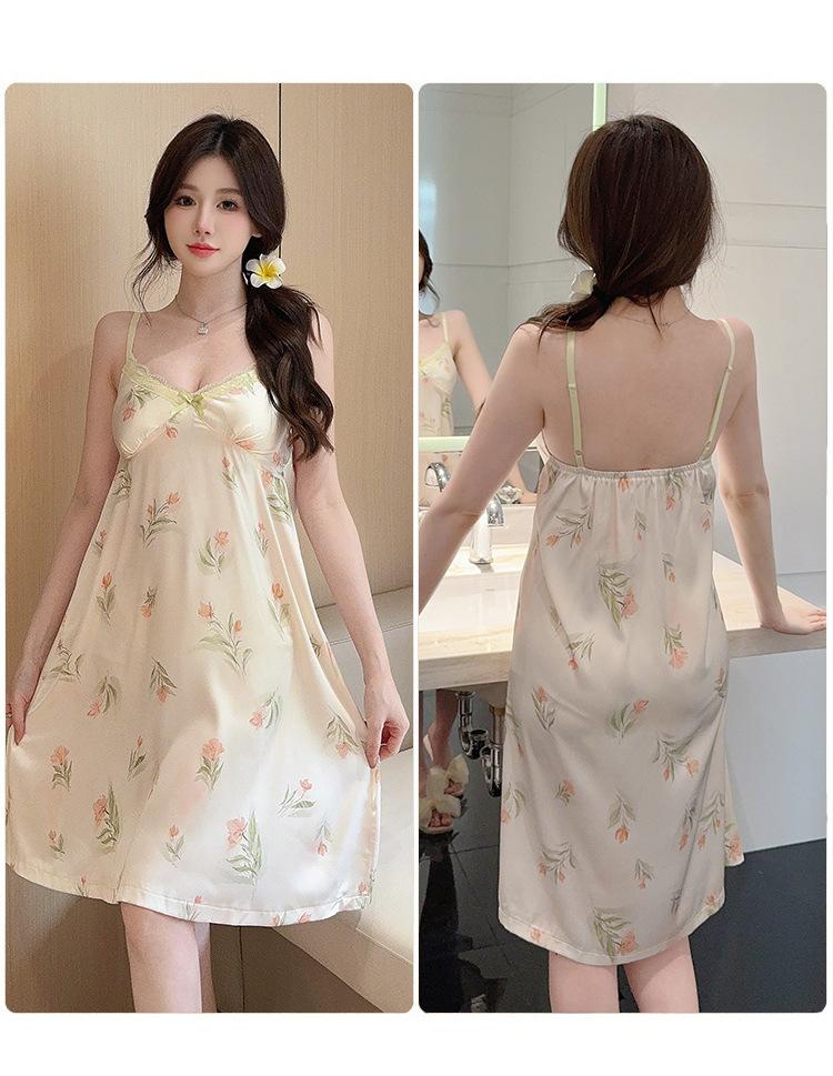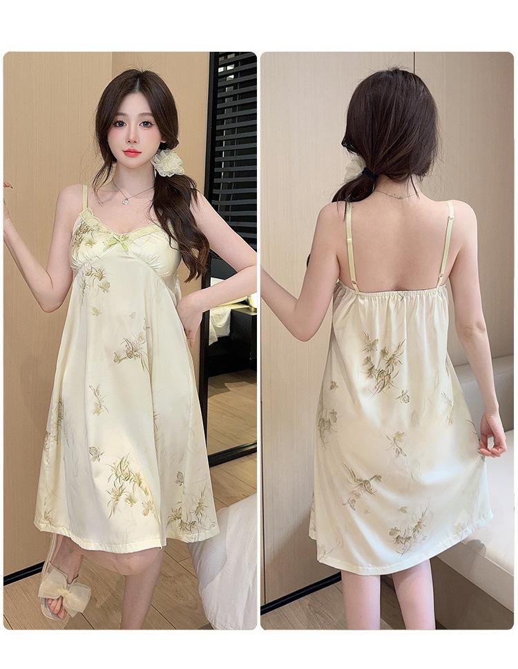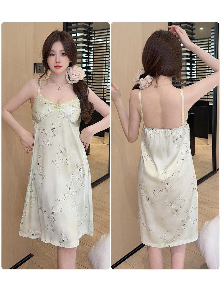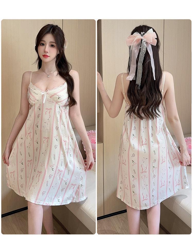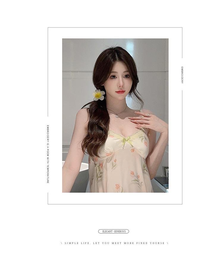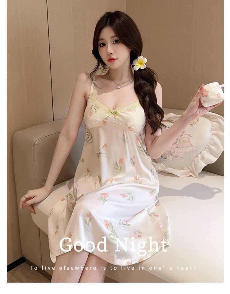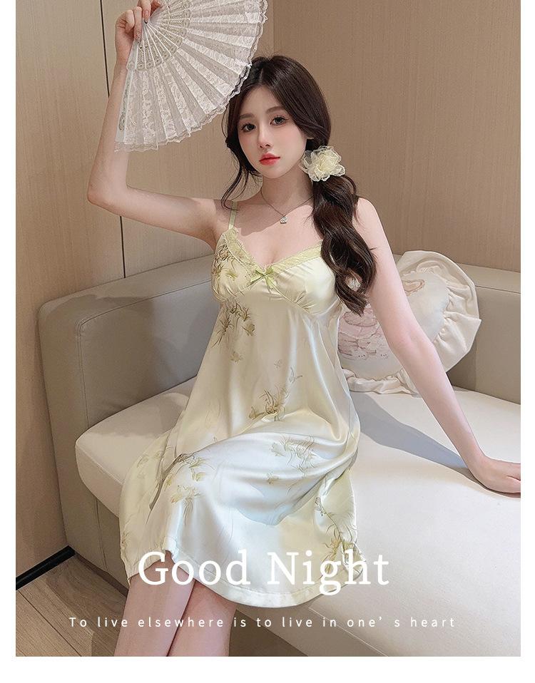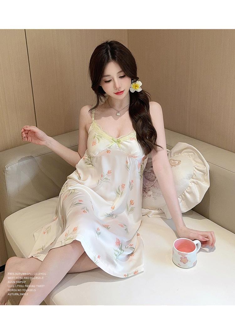 Camisón de Verano con Tirantes Cinta de Hielo Almohadilla de Pecho Removible Encaje Fino Estilo Puro Sexy Ropa de Casa Traje