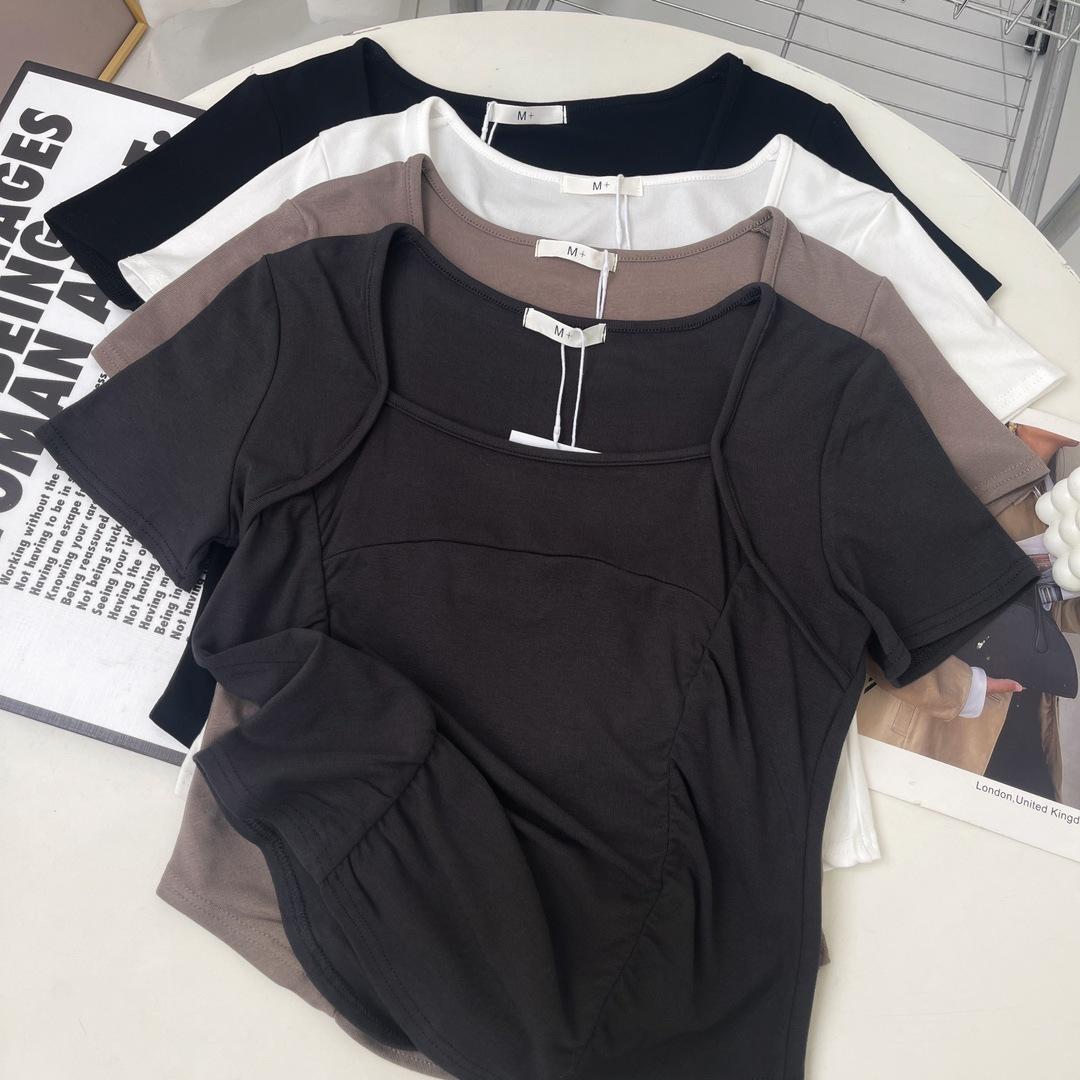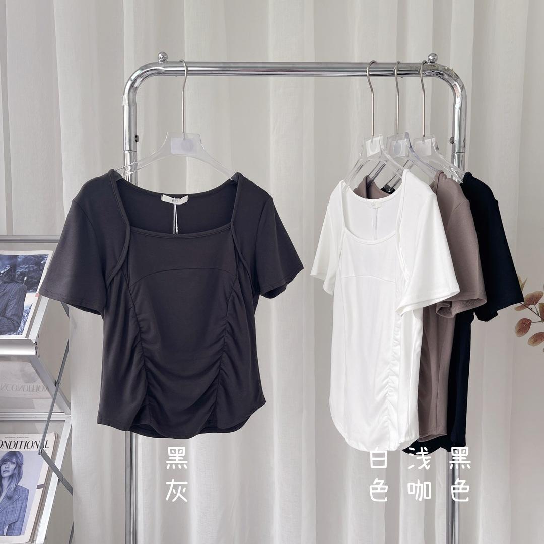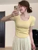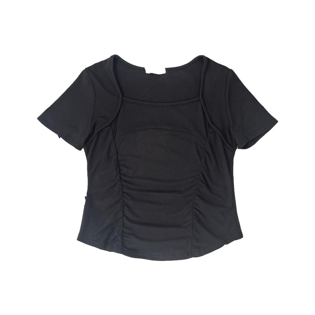 W00520 deseo puro cuello cuadrado hombro manga corta camiseta diseño de verano nicho chica hot corto cintura alta top de espina de pescado