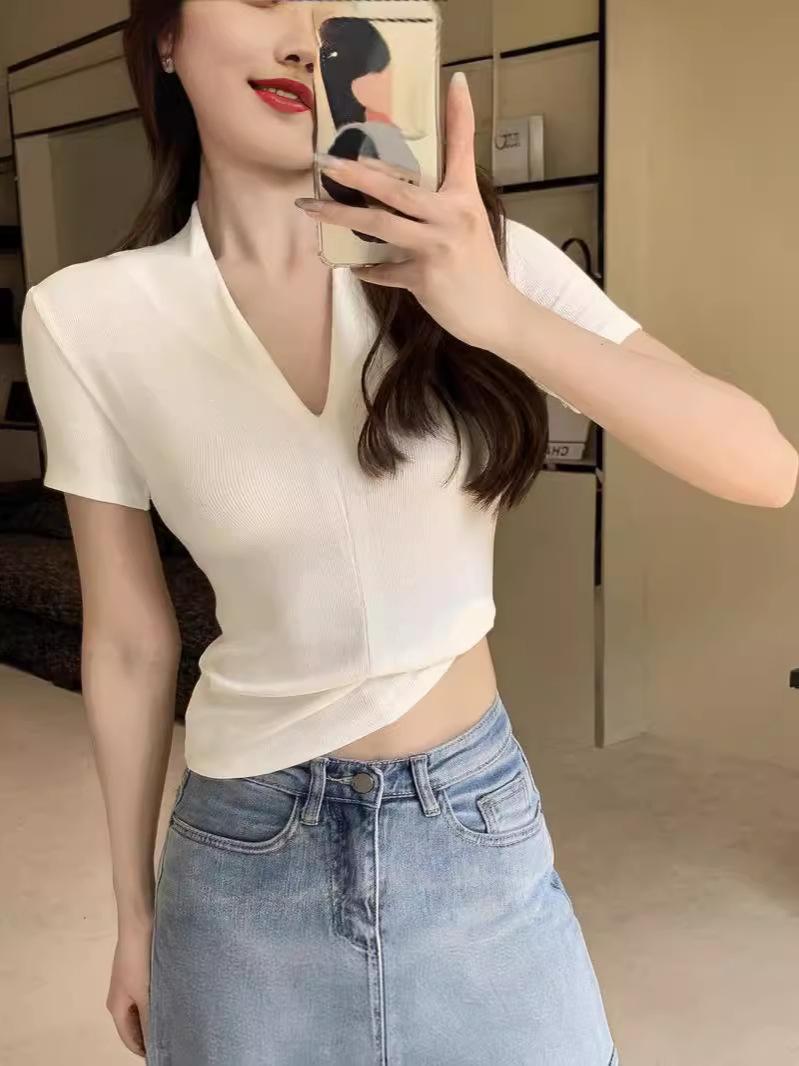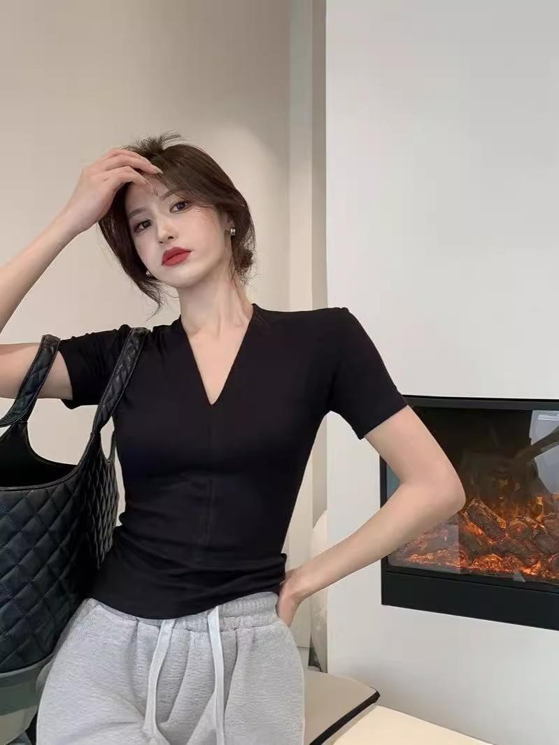 Camiseta de manga corta con cuello en V para mujer, estilo retro de Hong Kong, adelgazante, combinable, de verano, venta al por mayor transfronteriza