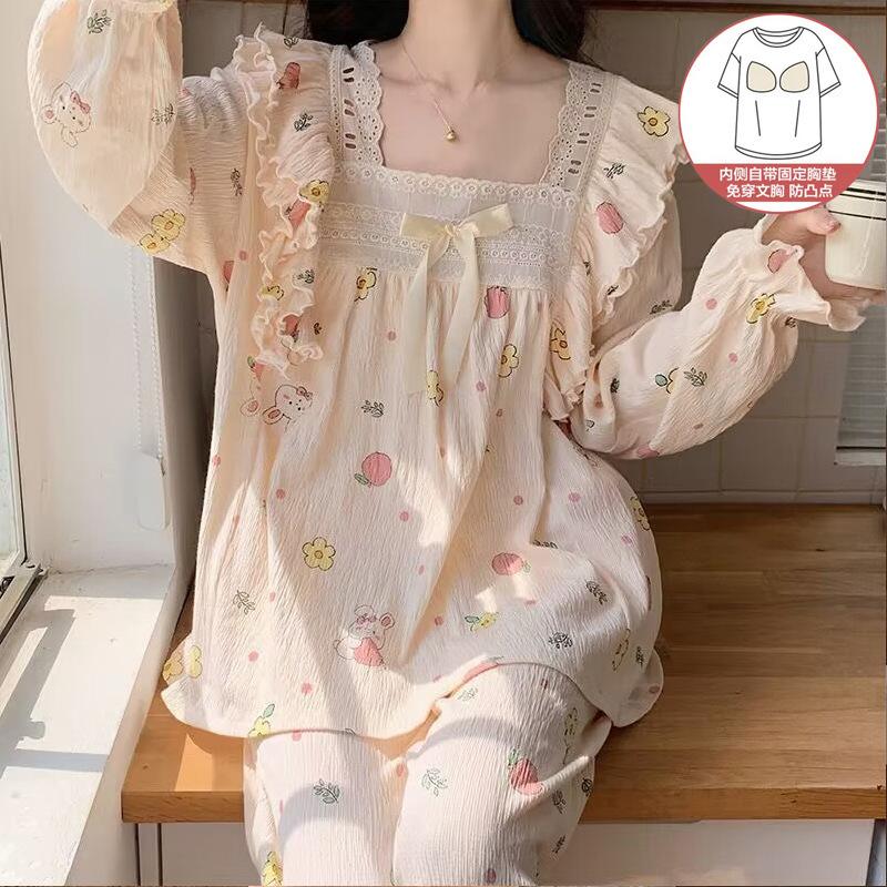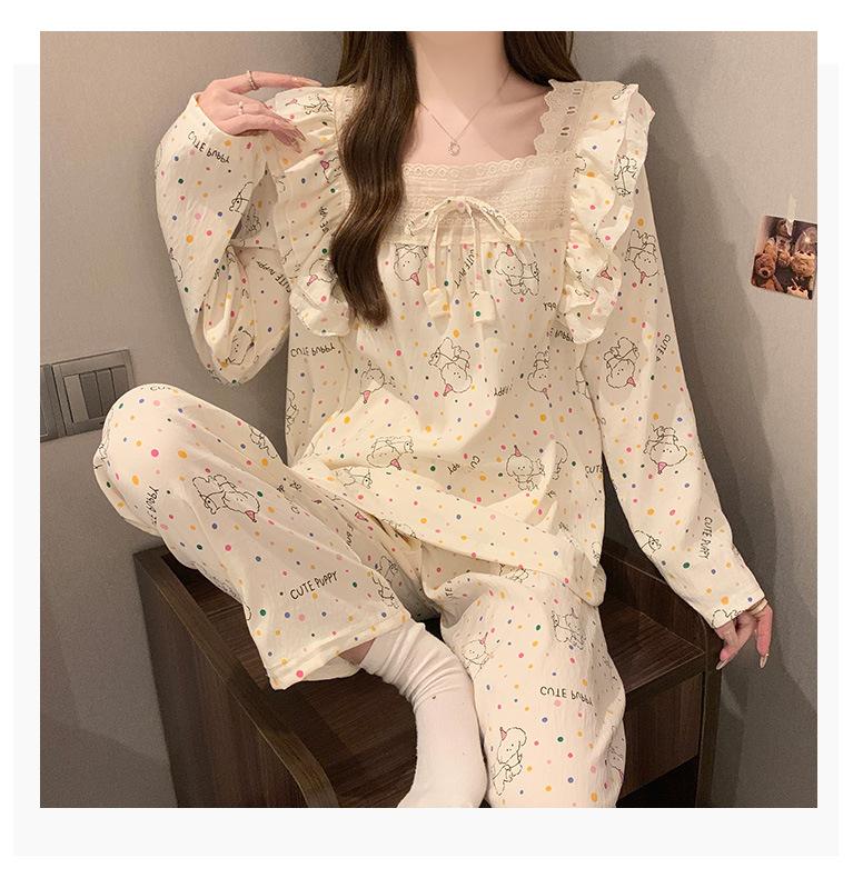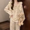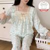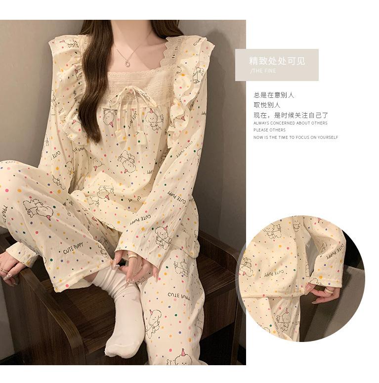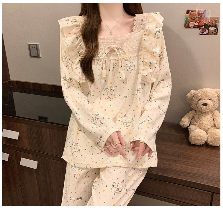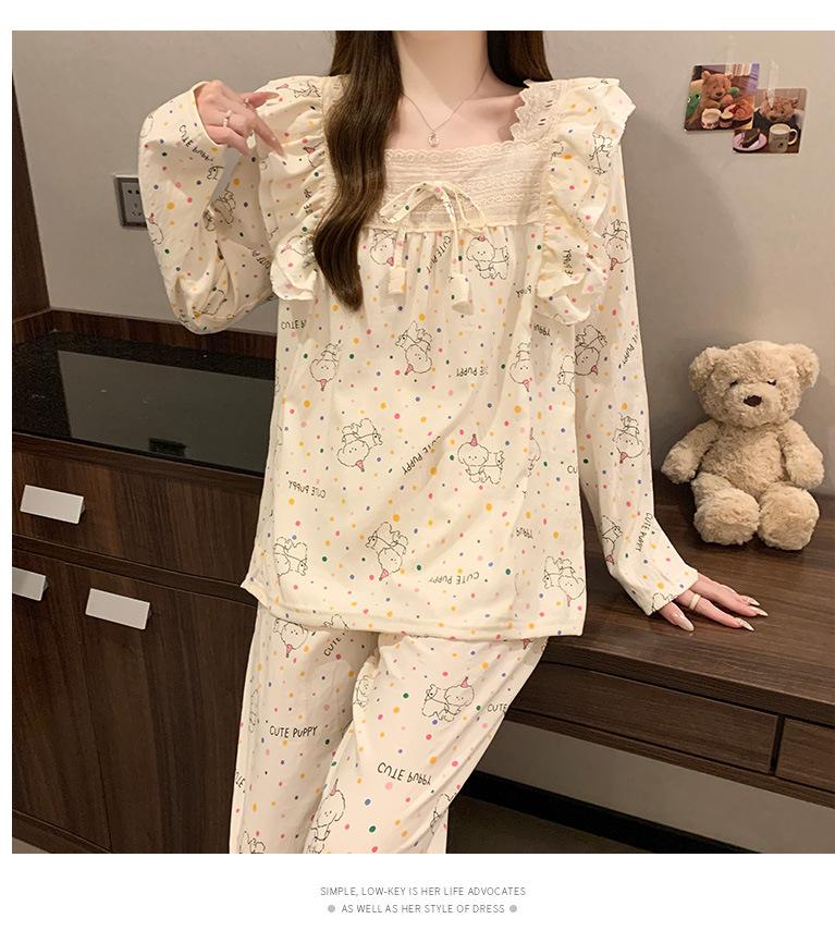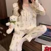 2024 Otoño Nuevo Pijama de Mujer Algodón Tejido Nube Manga Larga Estilo Princesa Dulce Traje Ropa de Casa Pijama Cuello Cuadrado