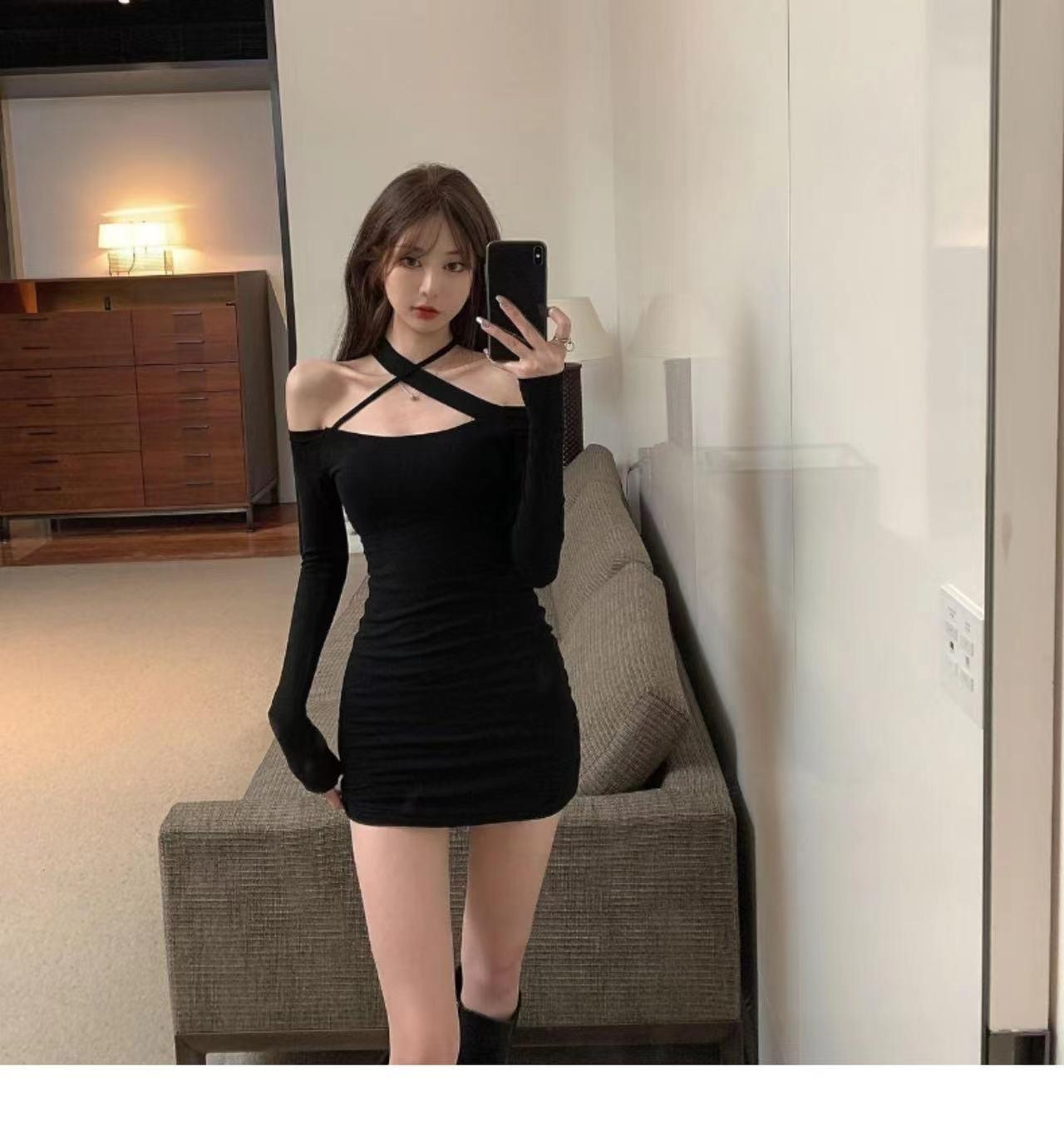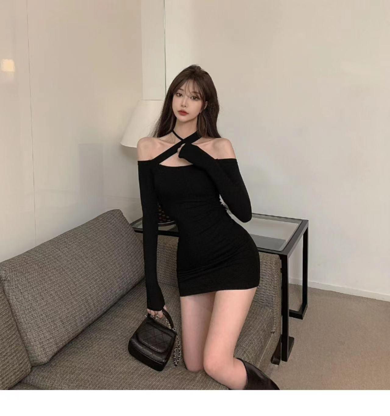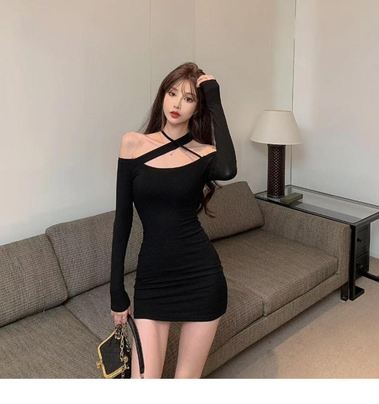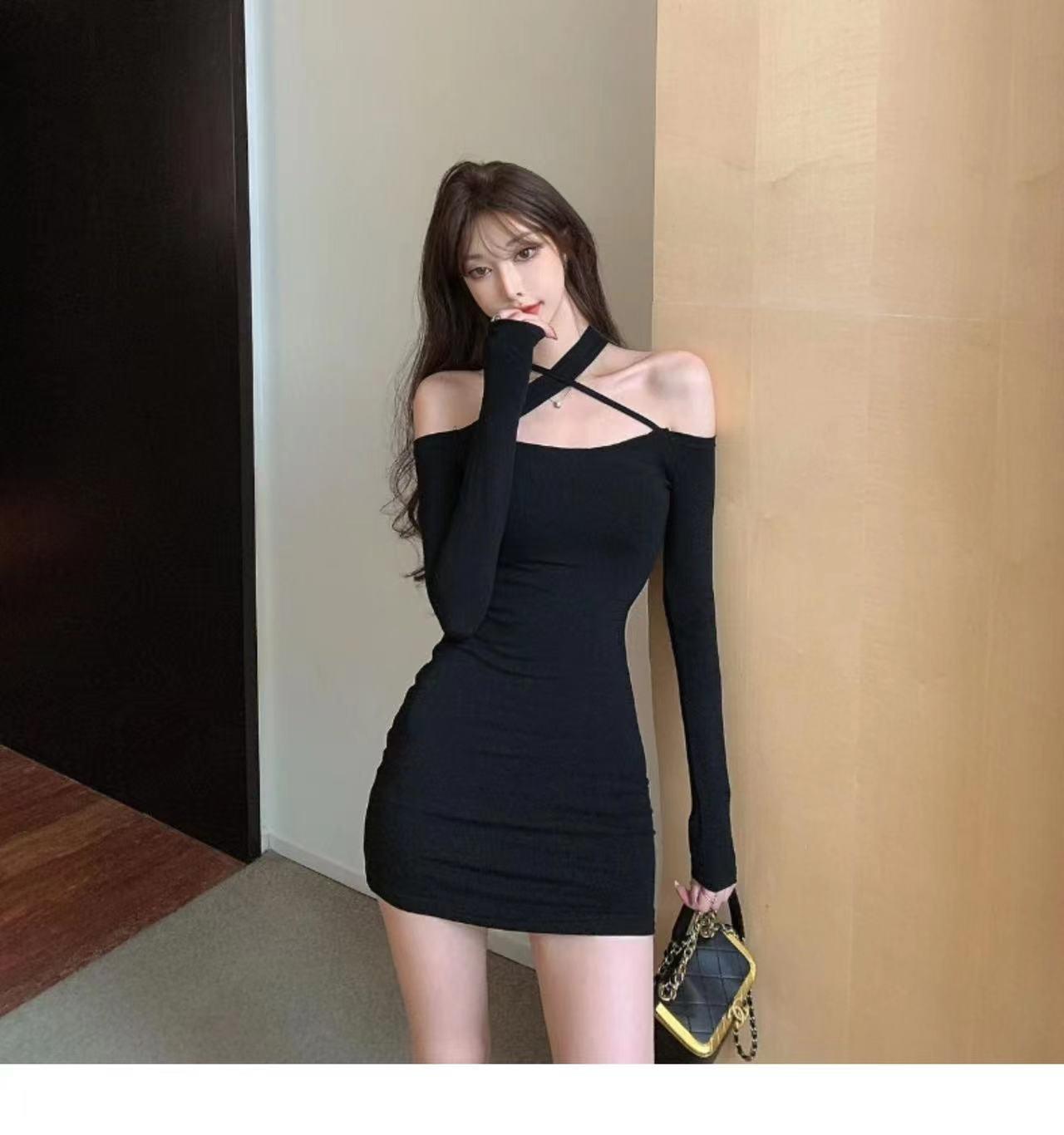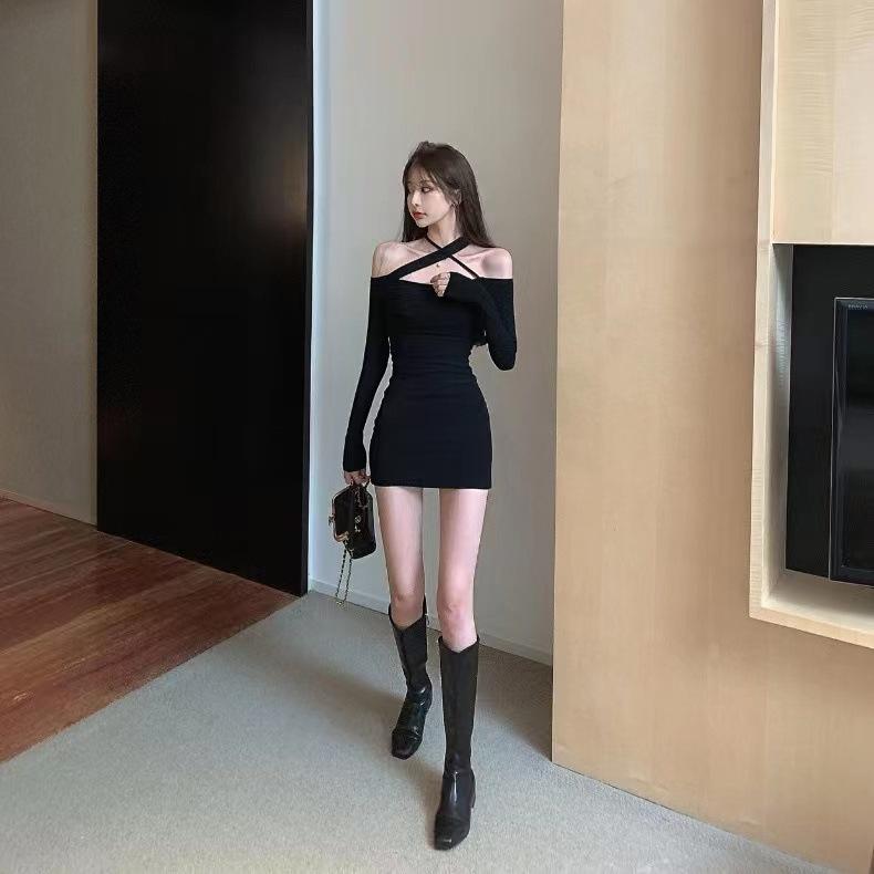 Primavera y verano 2023 Nuevo vestido sexy Spice Girl de manga larga ajustado a la cadera negro con hombros descubiertos y cuello halter para mujer