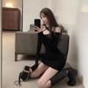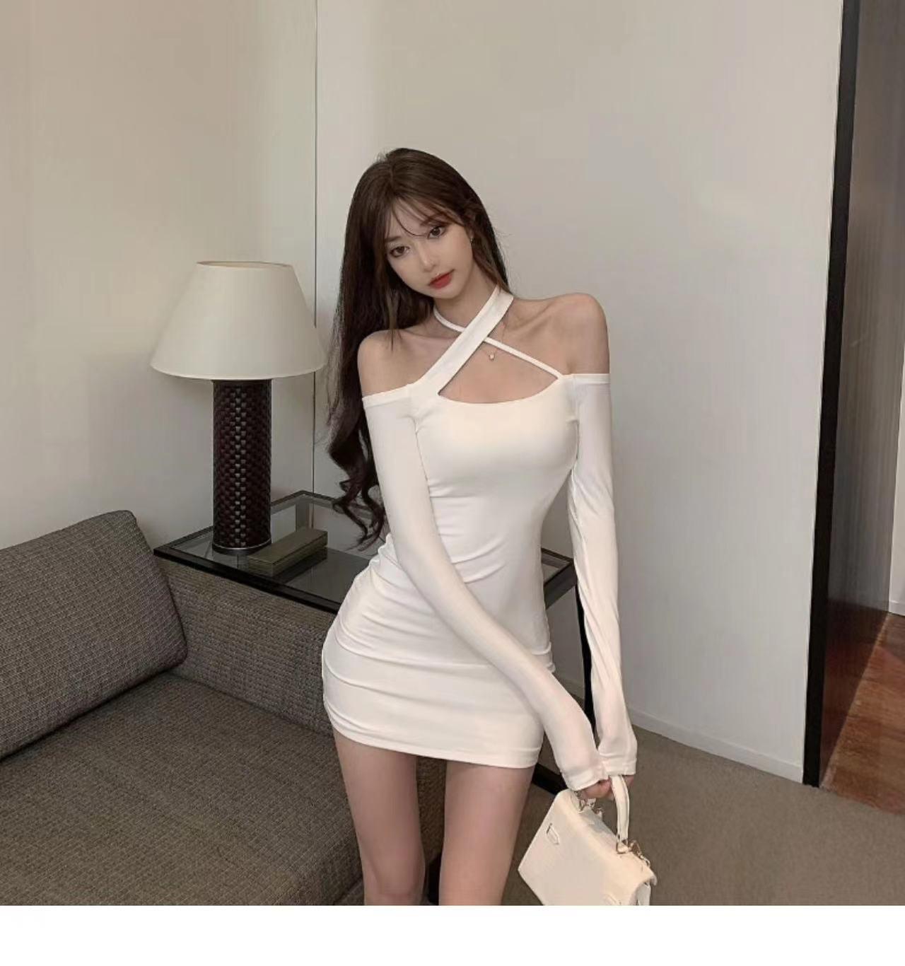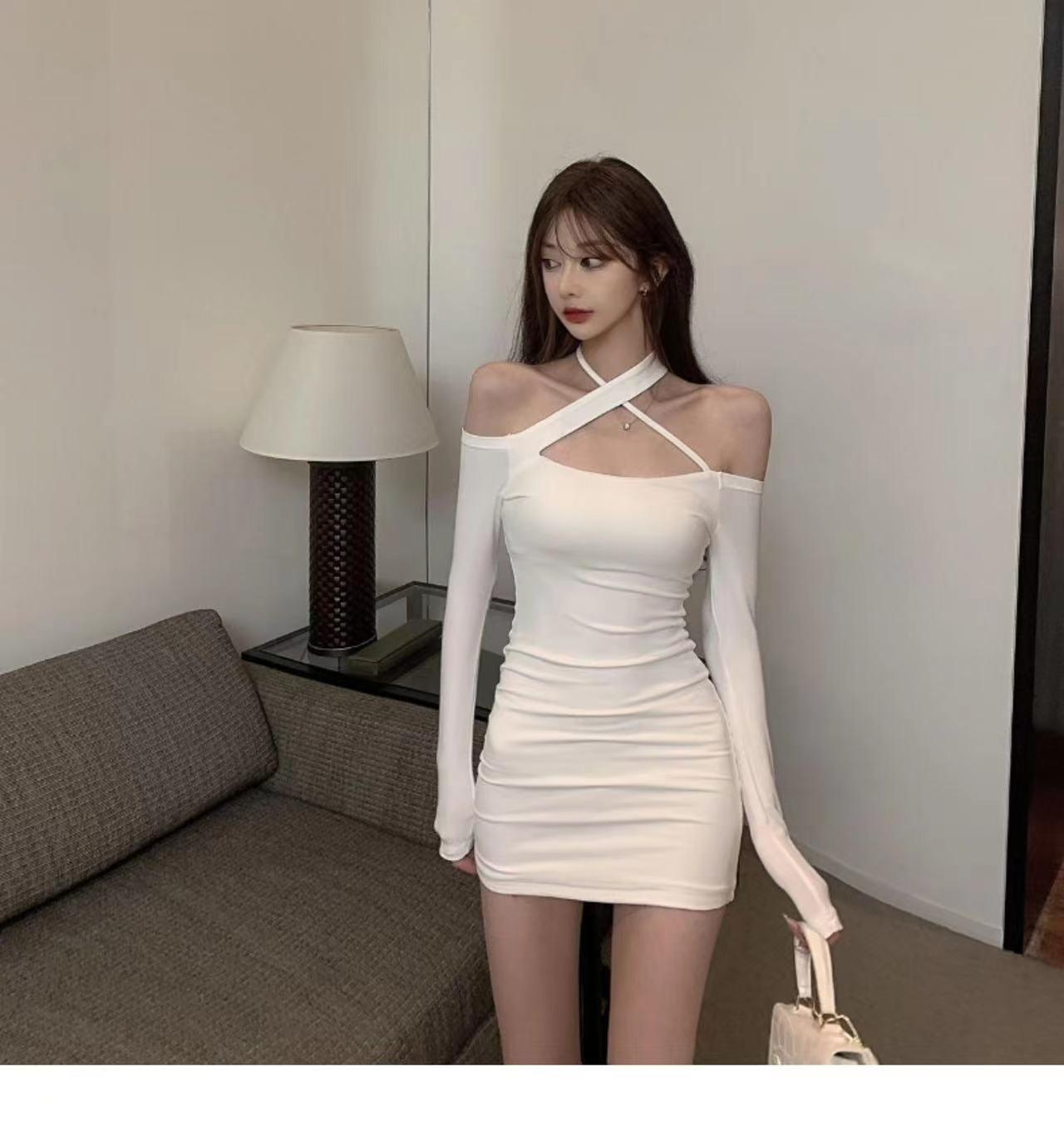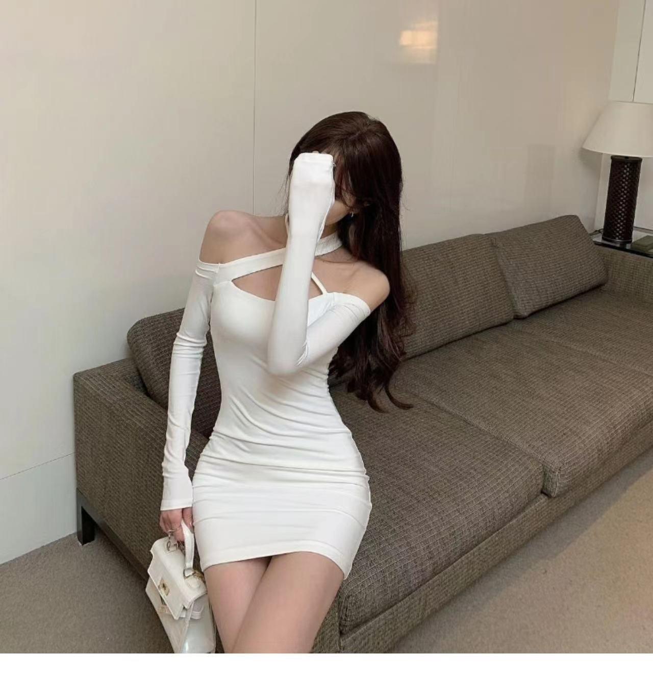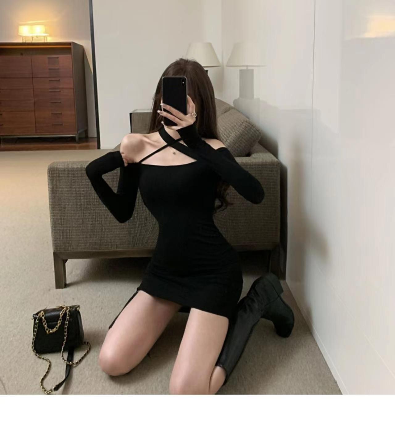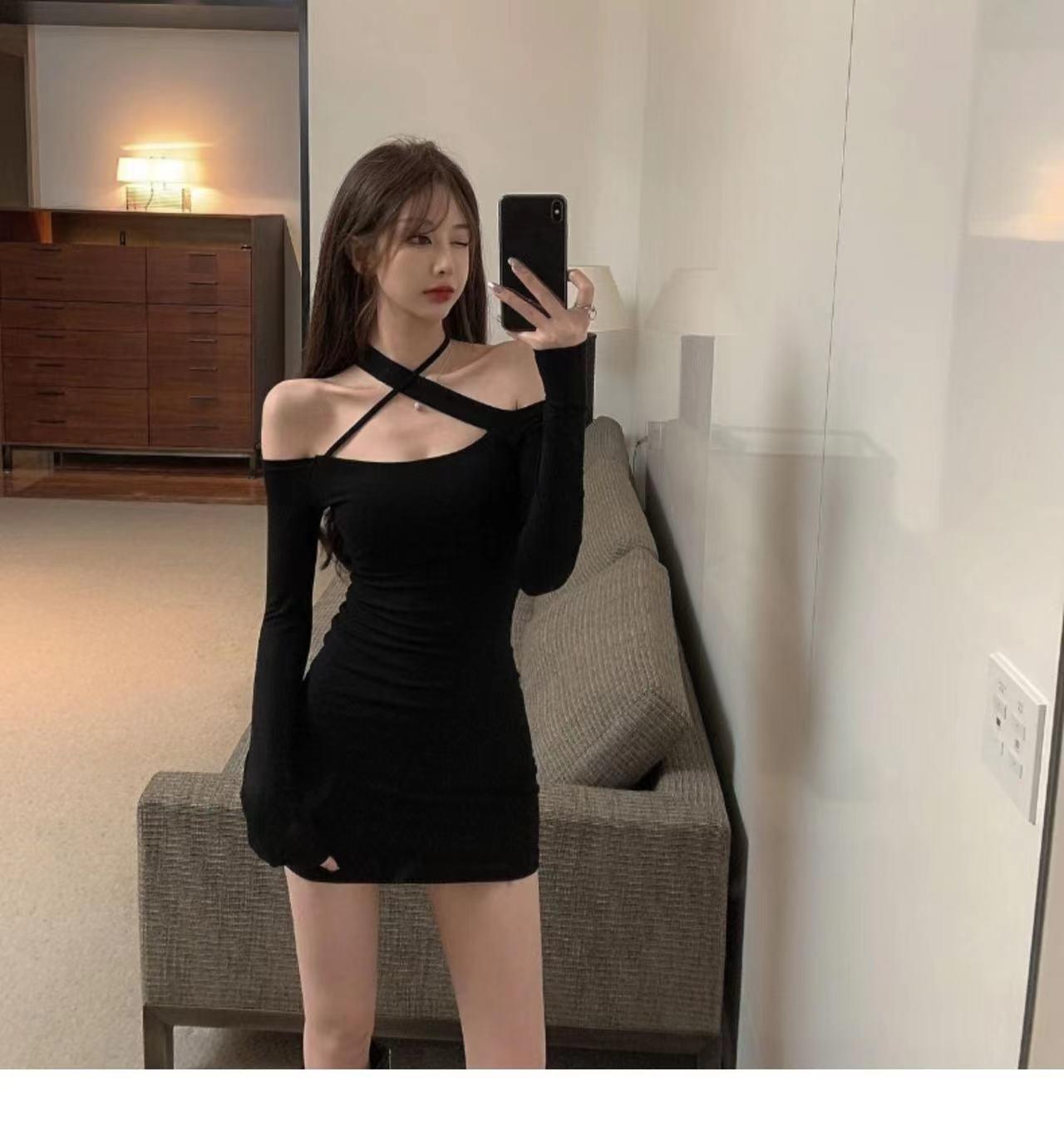 Primavera y verano 2023 Nuevo vestido sexy Spice Girl de manga larga ajustado a la cadera negro con hombros descubiertos y cuello halter para mujer