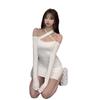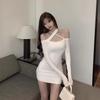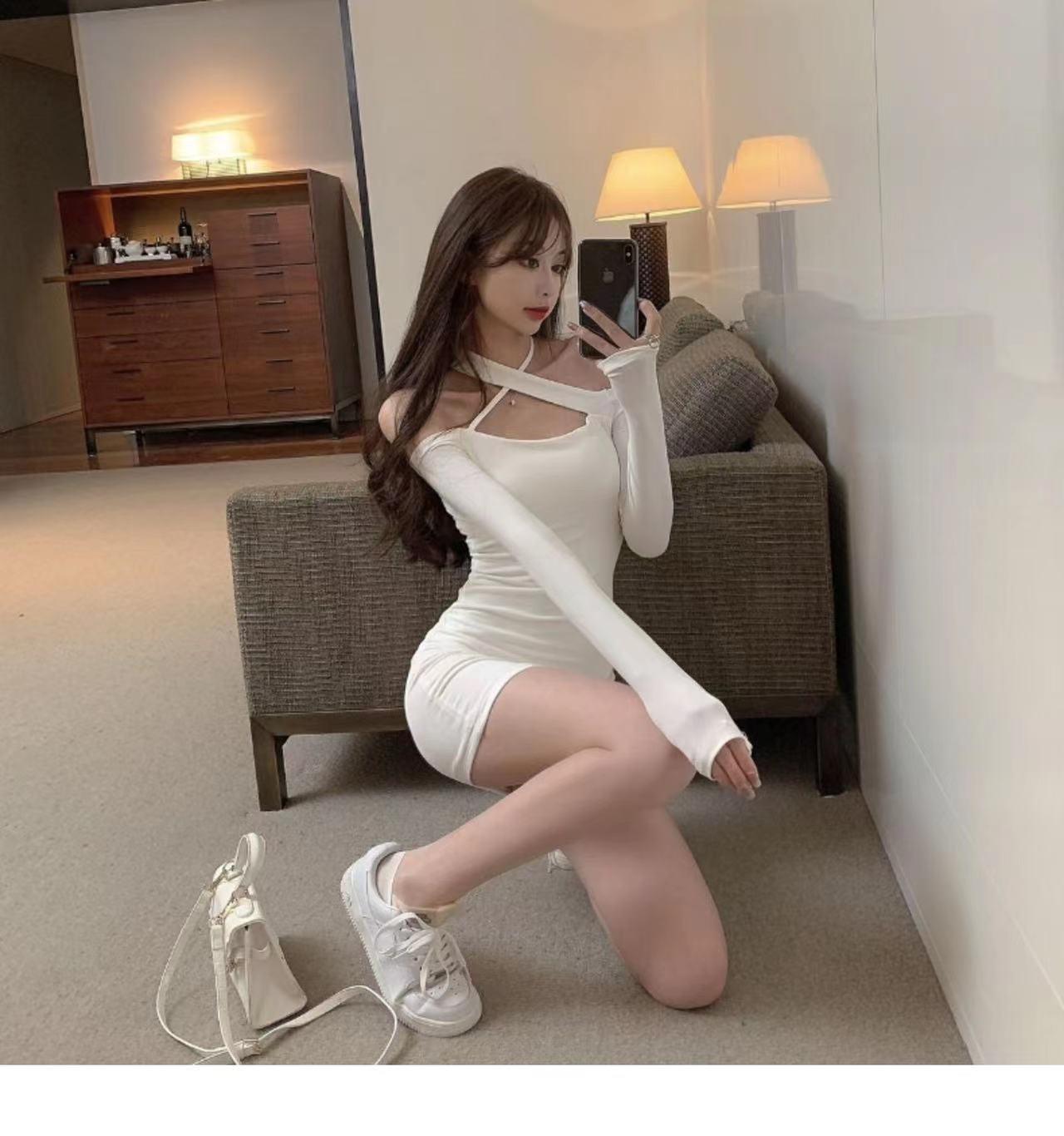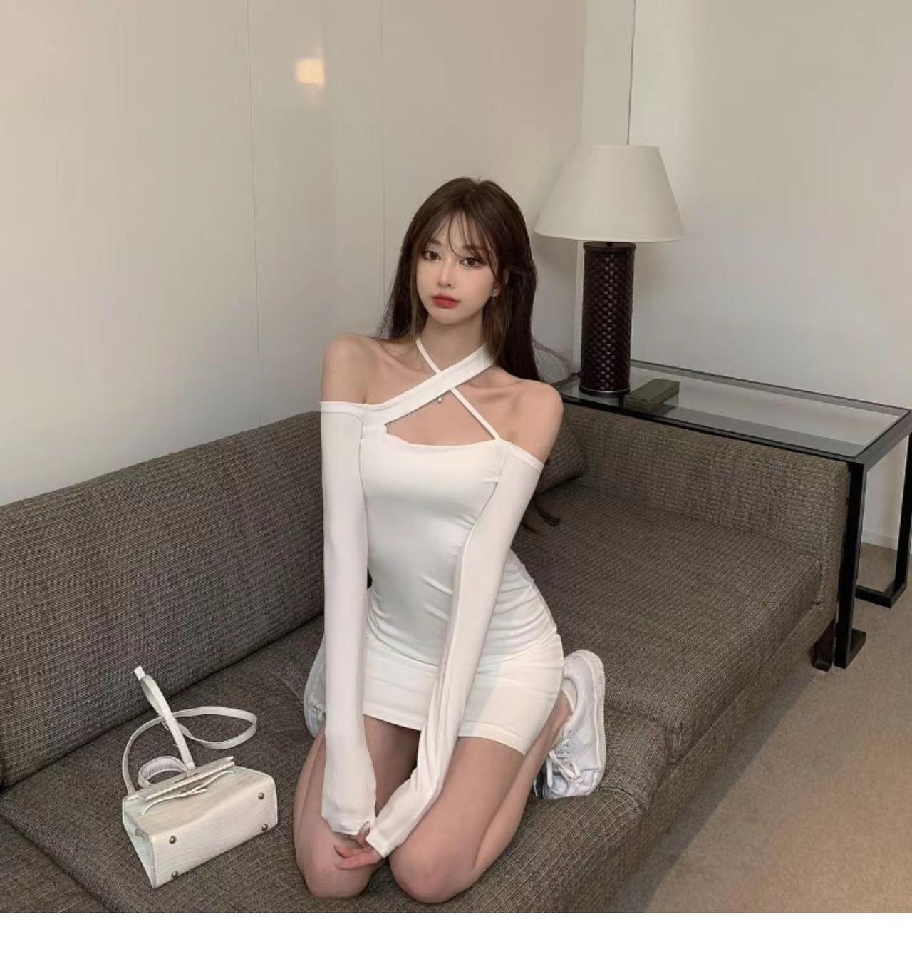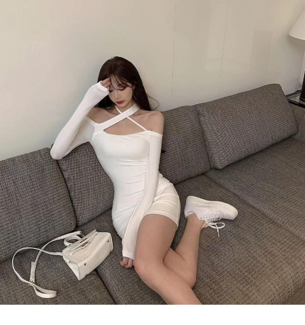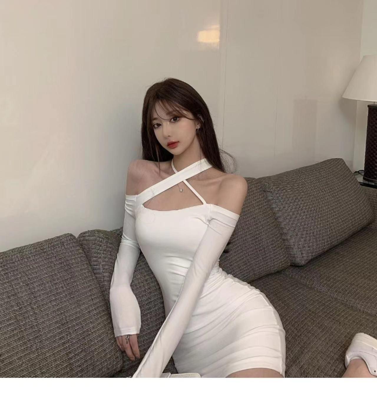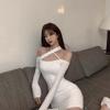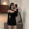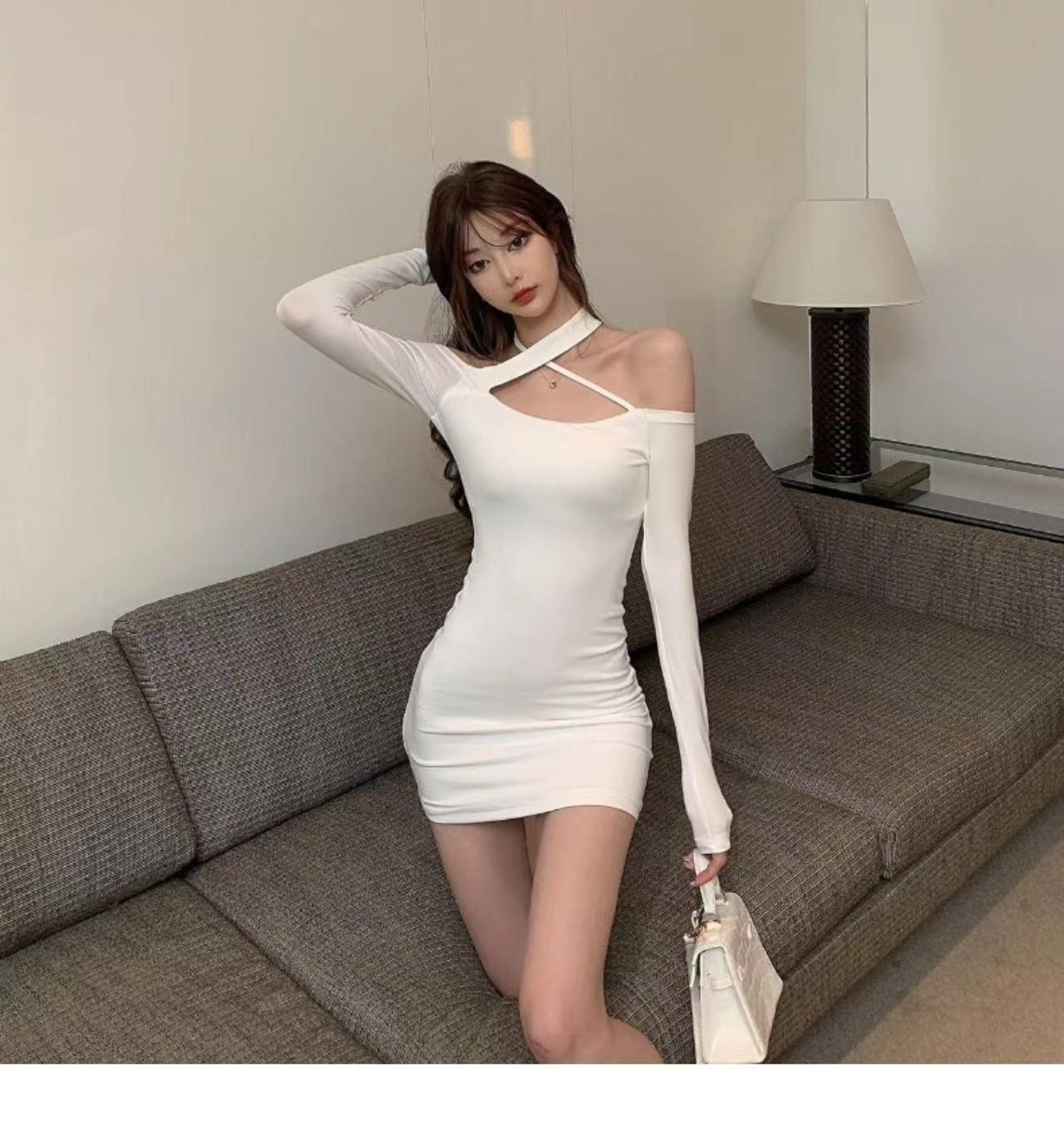 Primavera y verano 2023 Nuevo vestido sexy Spice Girl de manga larga ajustado a la cadera negro con hombros descubiertos y cuello halter para mujer