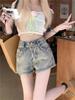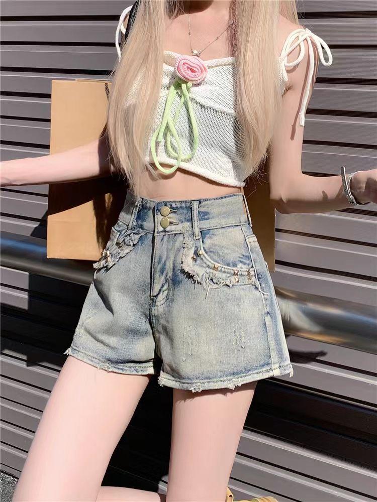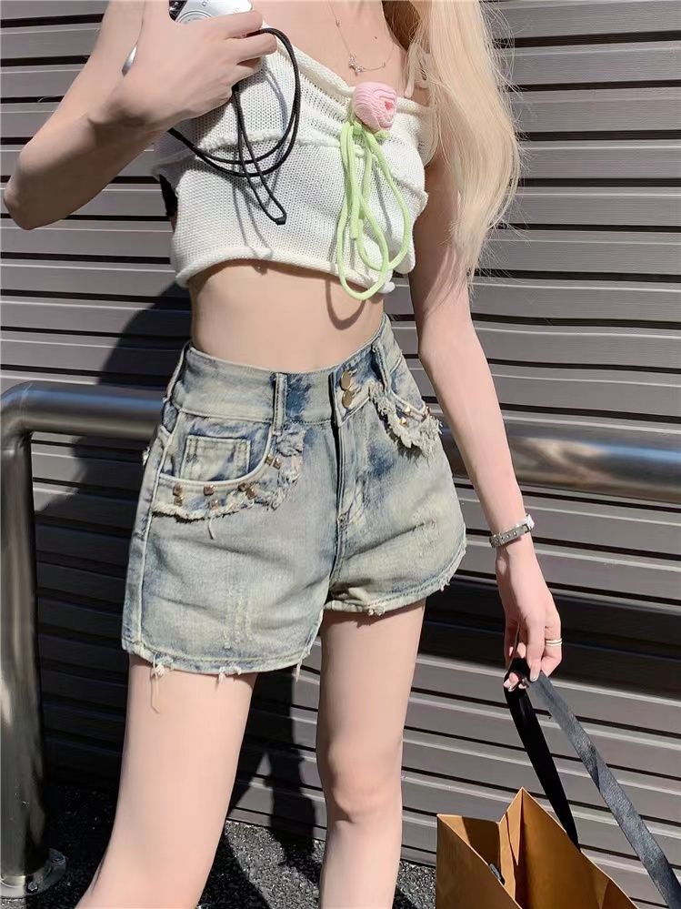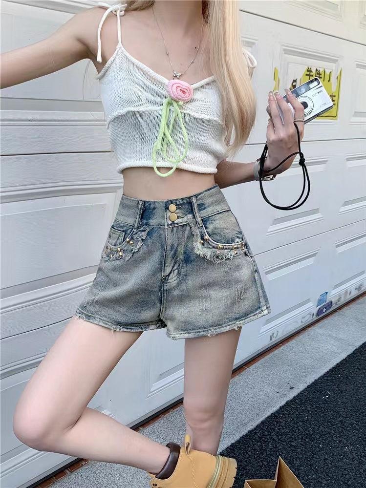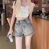 Shorts de Mezclilla de Cintura Baja Estilo Americano para Chica Caliente Liu Ding para Mujer Primavera y Verano Nuevo Ajustado Adelgazante Bolsa Cadera Pierna Ancha Pantalones Calientes de Moda