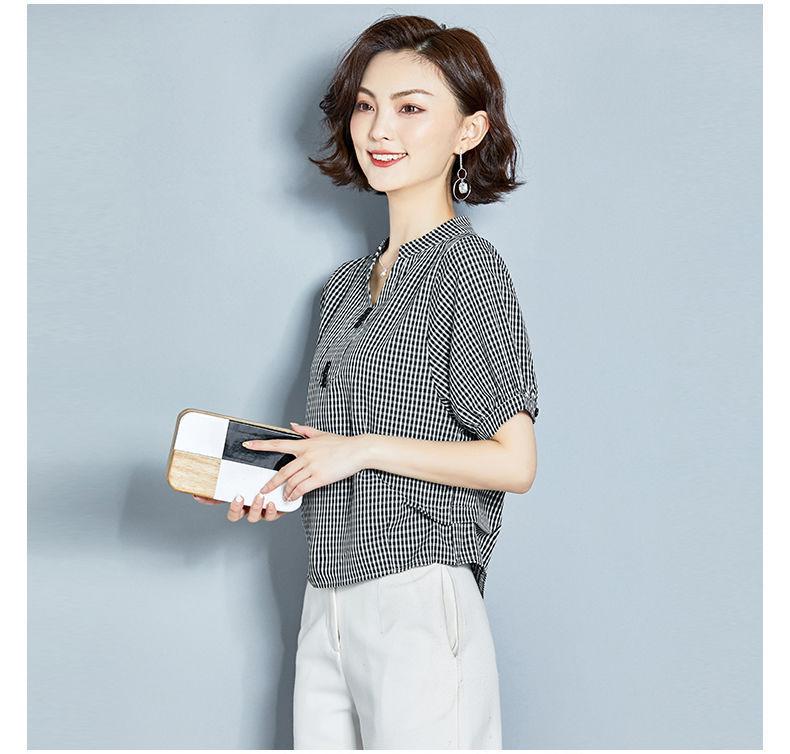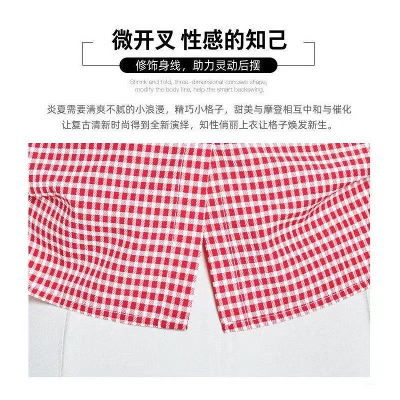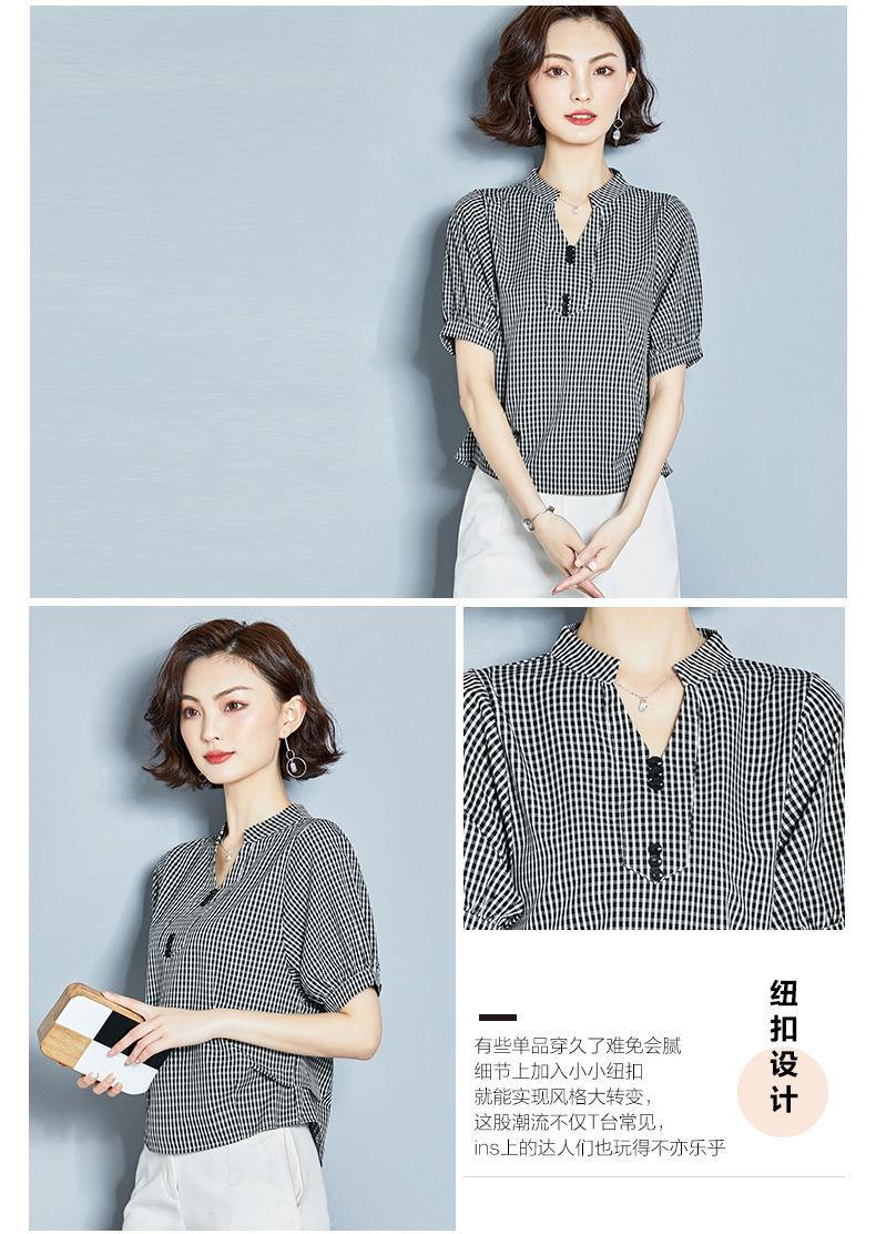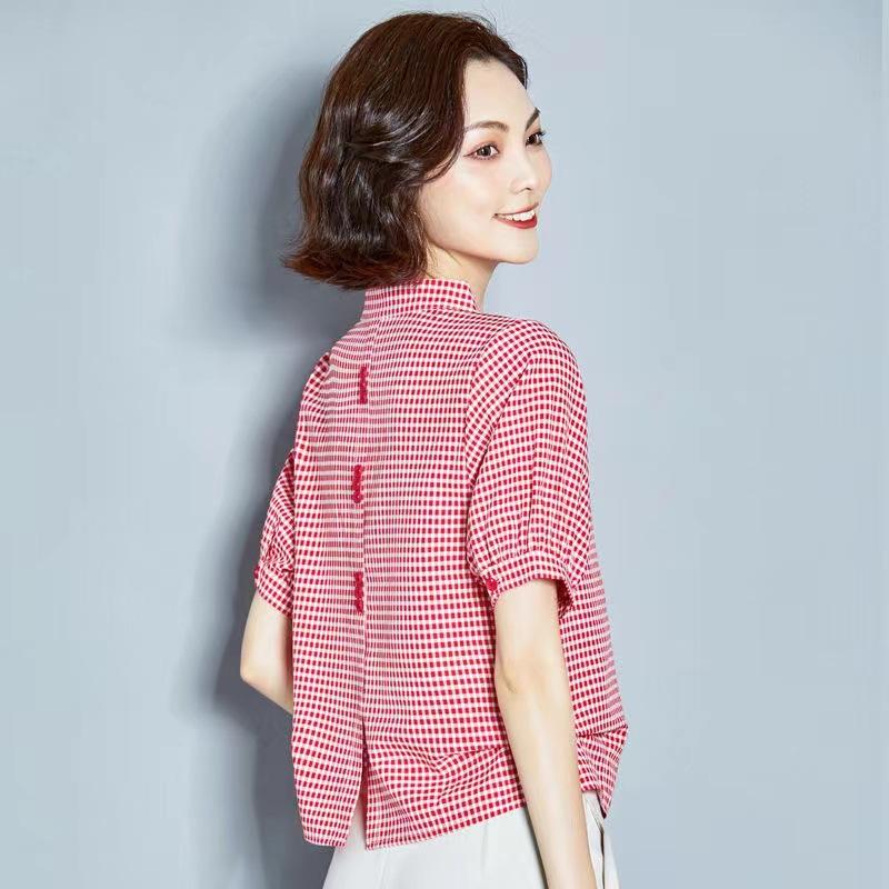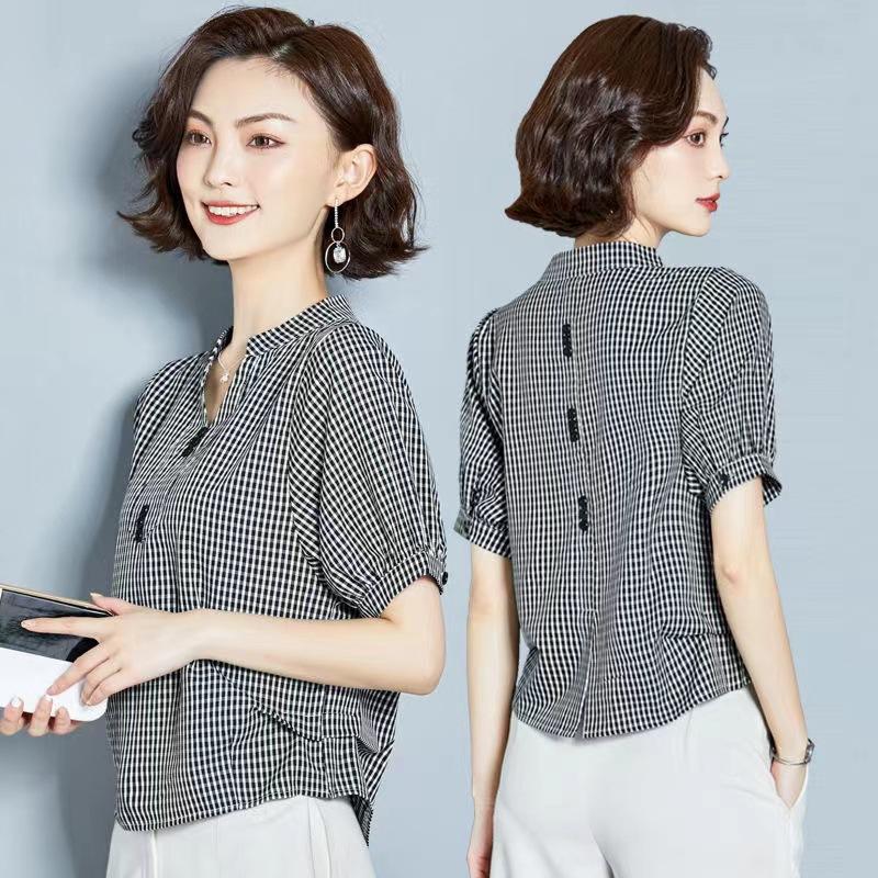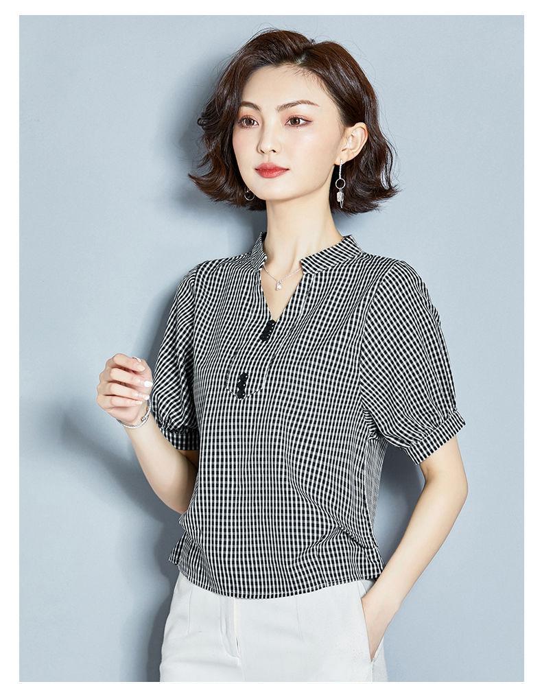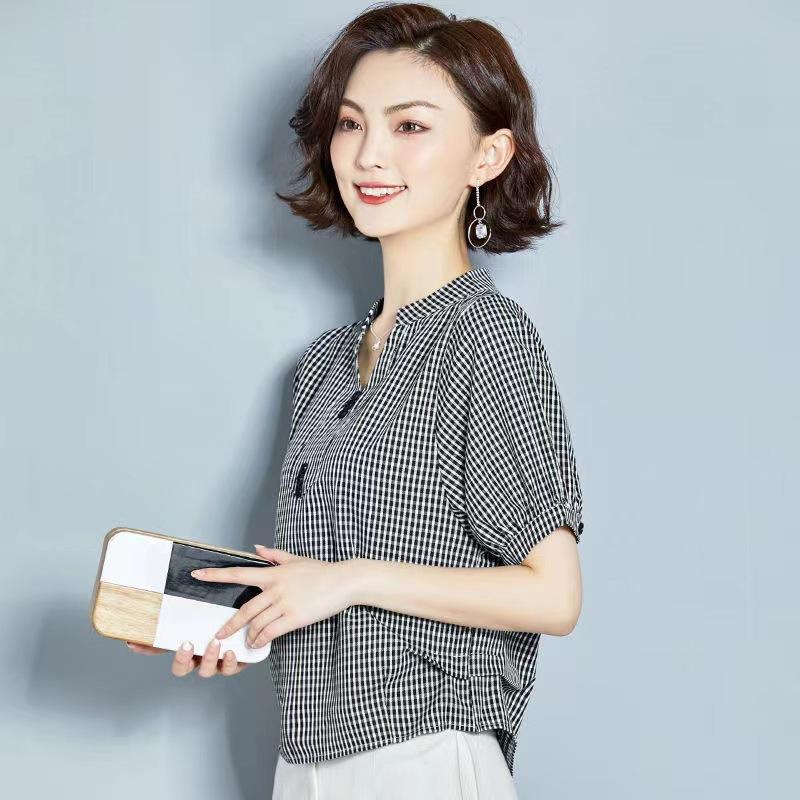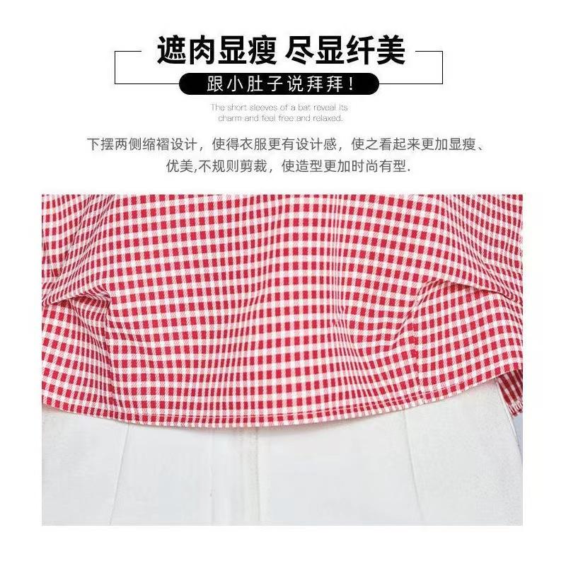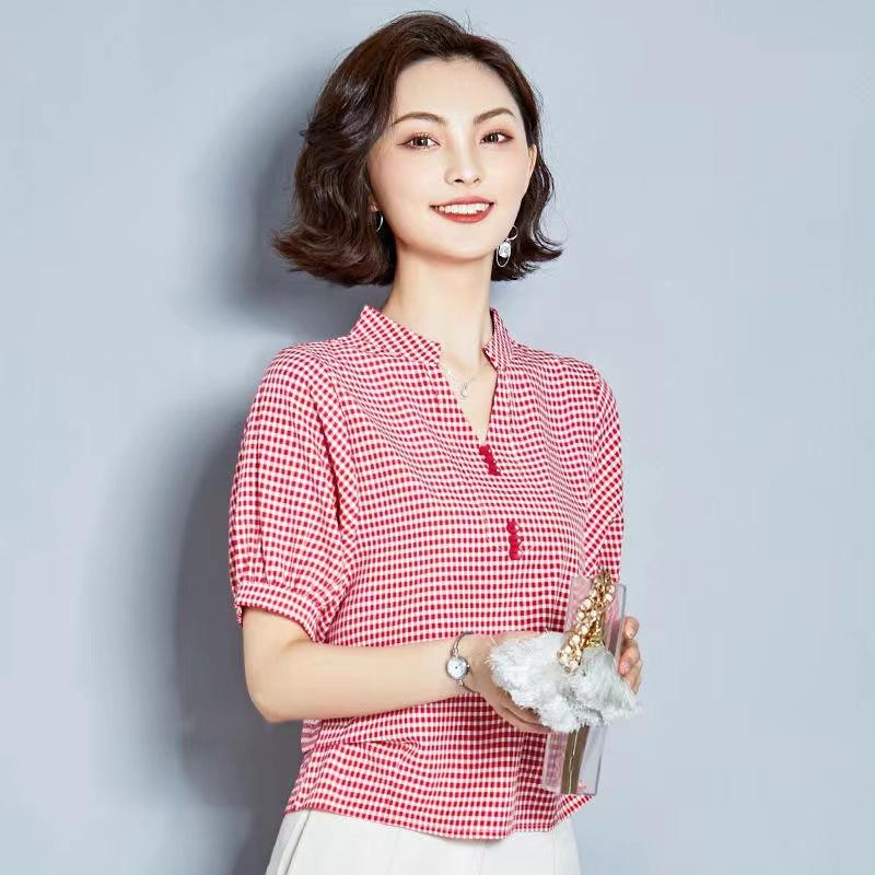 Sense Camisa de gasa de manga corta para mujer 2024 Nicho Cuadros Nuevo Top Estilo occidental Cubre vientre Diseño de cuello en V Verano Camisa pequeña