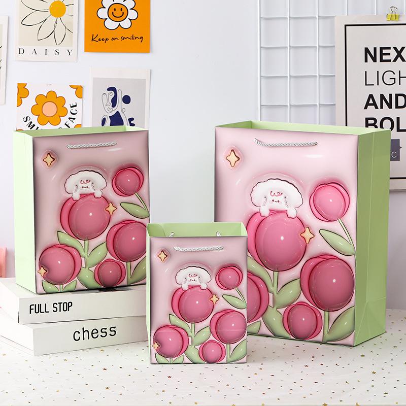 Bolsa de regalo de papel portátil de gran capacidad con dibujos animados de flores y animales, en stock, bolsa de regalo de cartulina blanca gruesa de alta apariencia ins