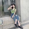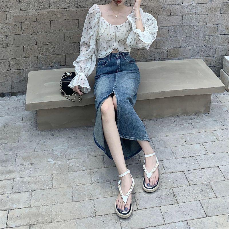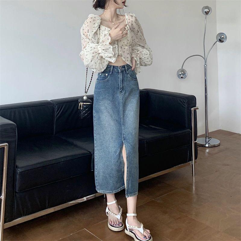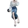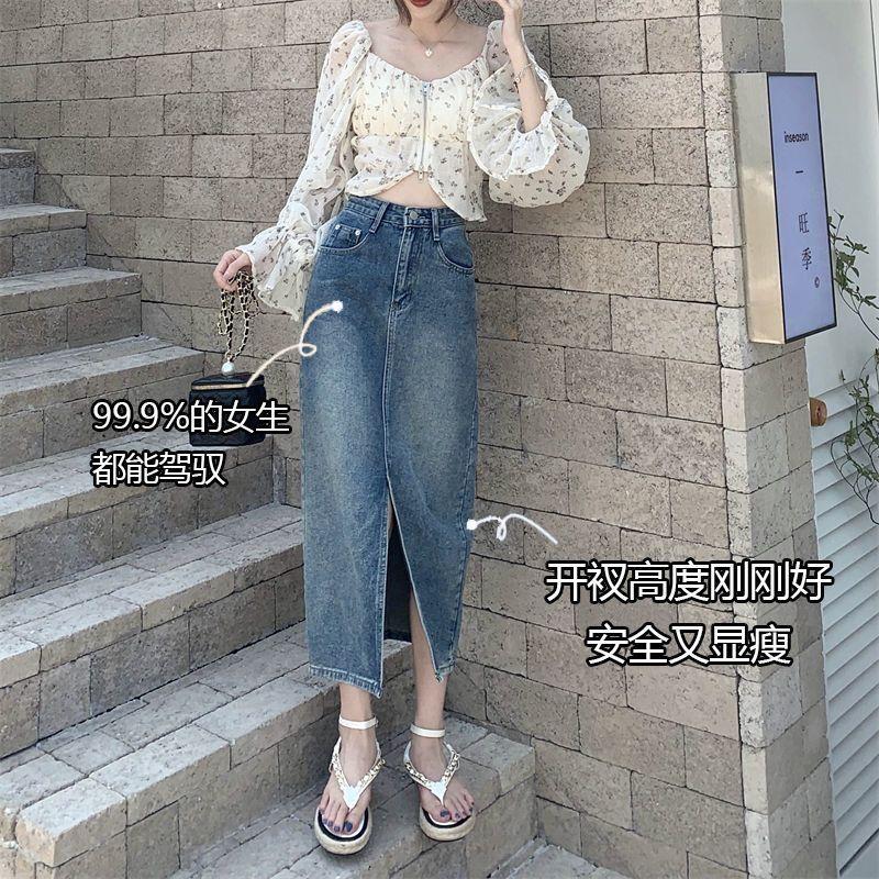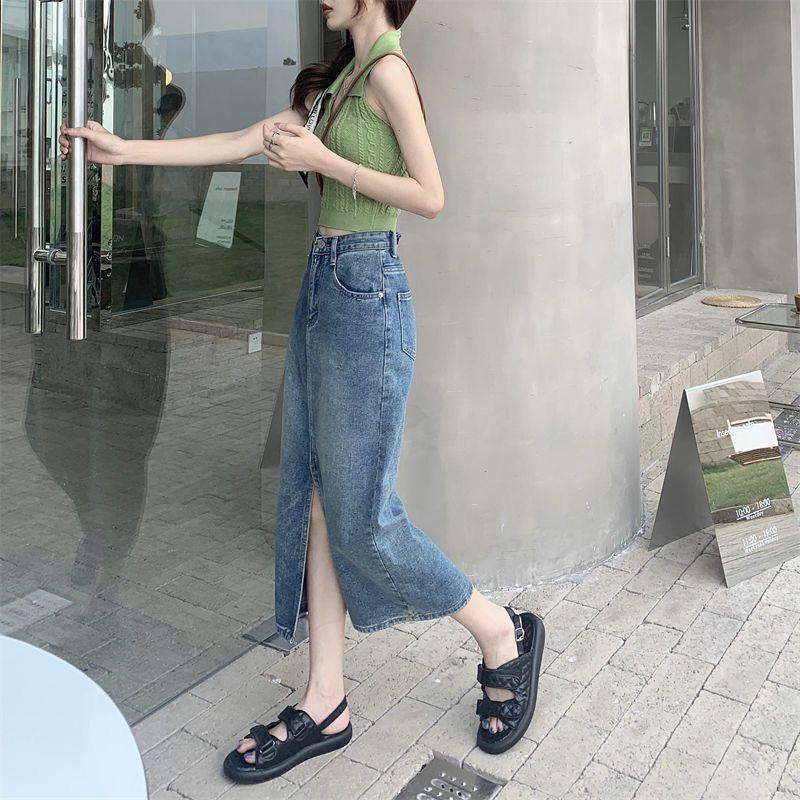 Falda vaquera para mujer, popular en Internet, con abertura frontal, estilo A, estilo informal, estilo retro, de longitud media, con aberturas laterales.