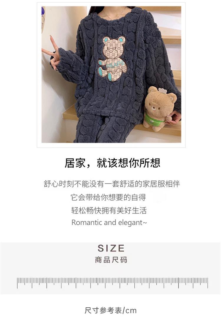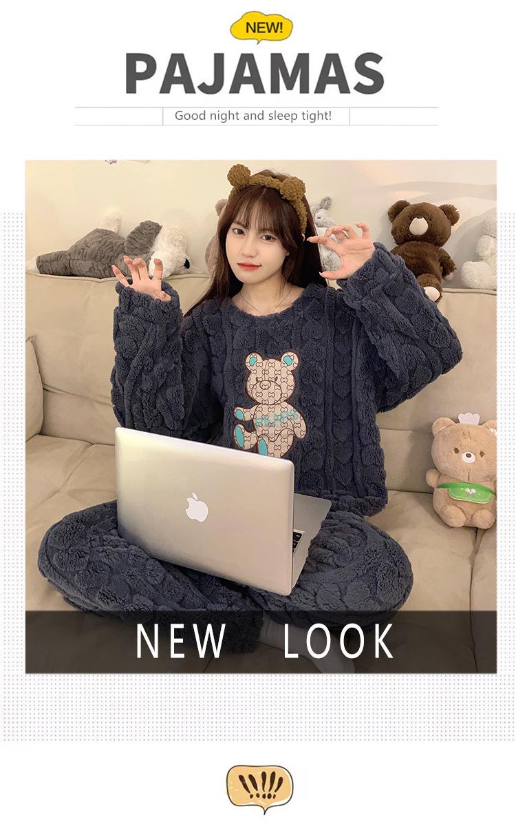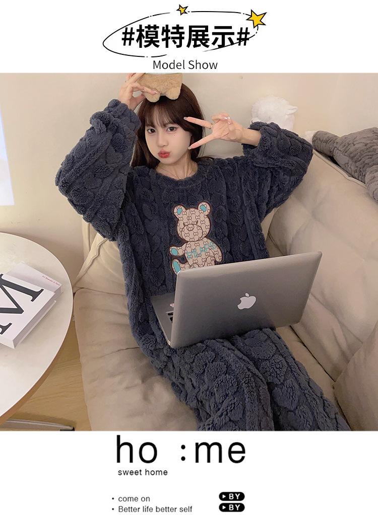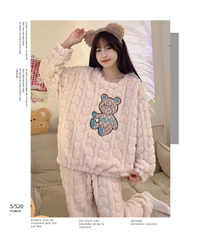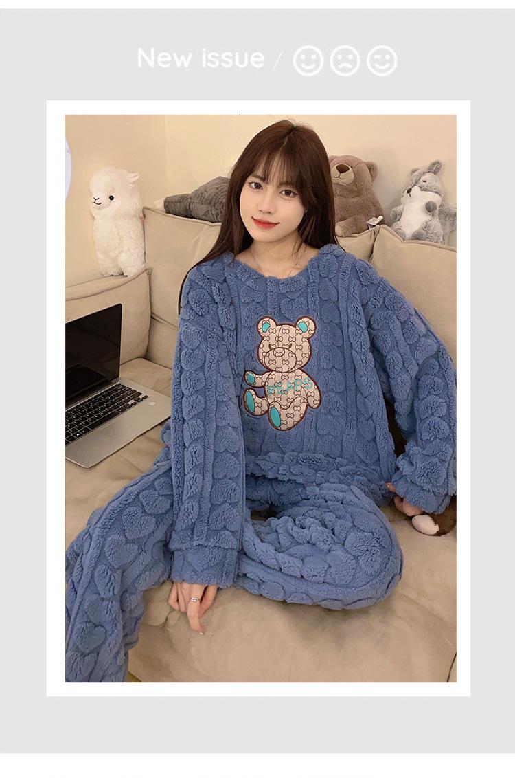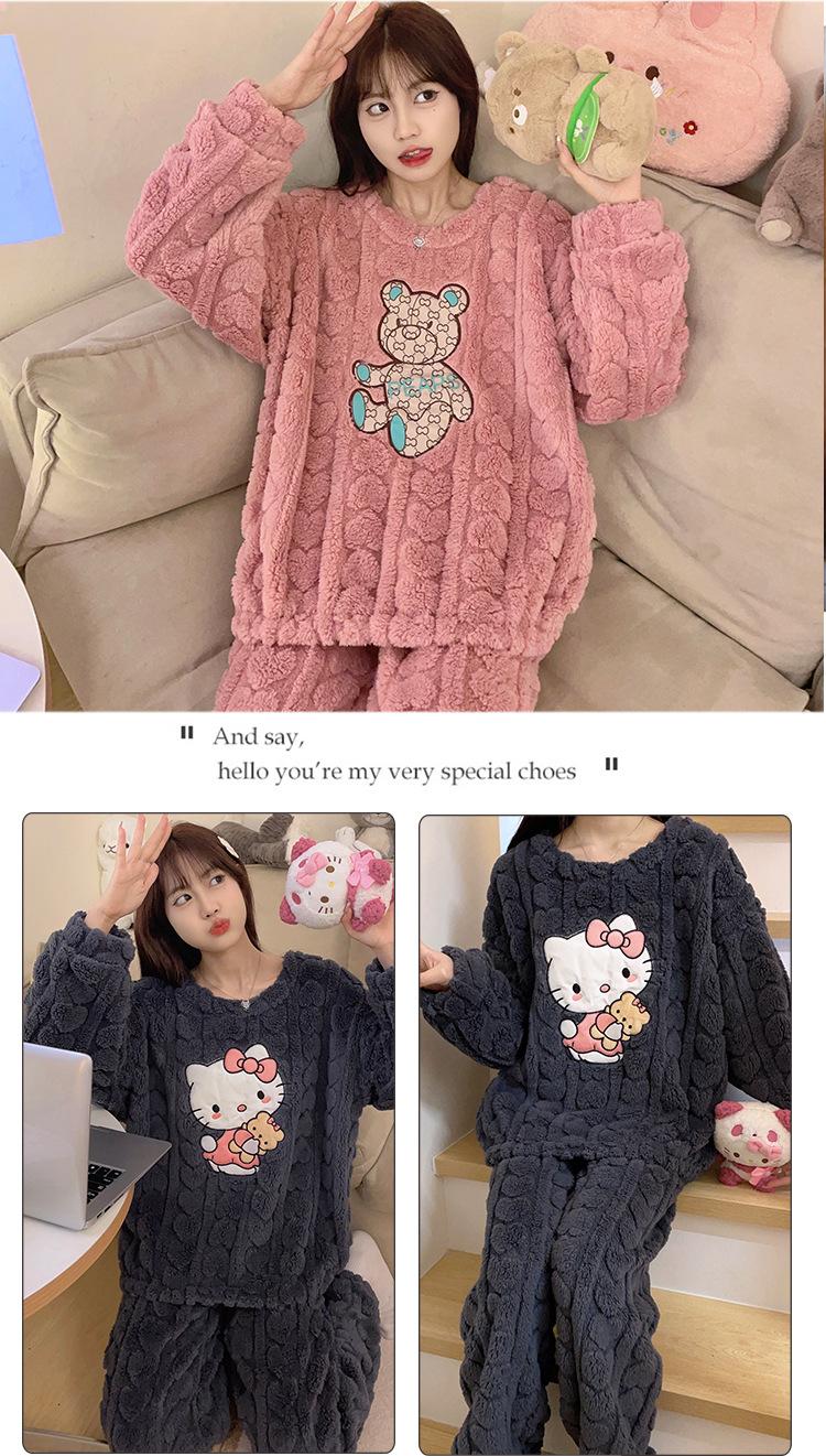 Pijamas de franela de otoño e invierno para mujer, bonitos dibujos animados, cuello redondo, forro polar coral, talla grande, para chica gordita, ropa de casa cálida