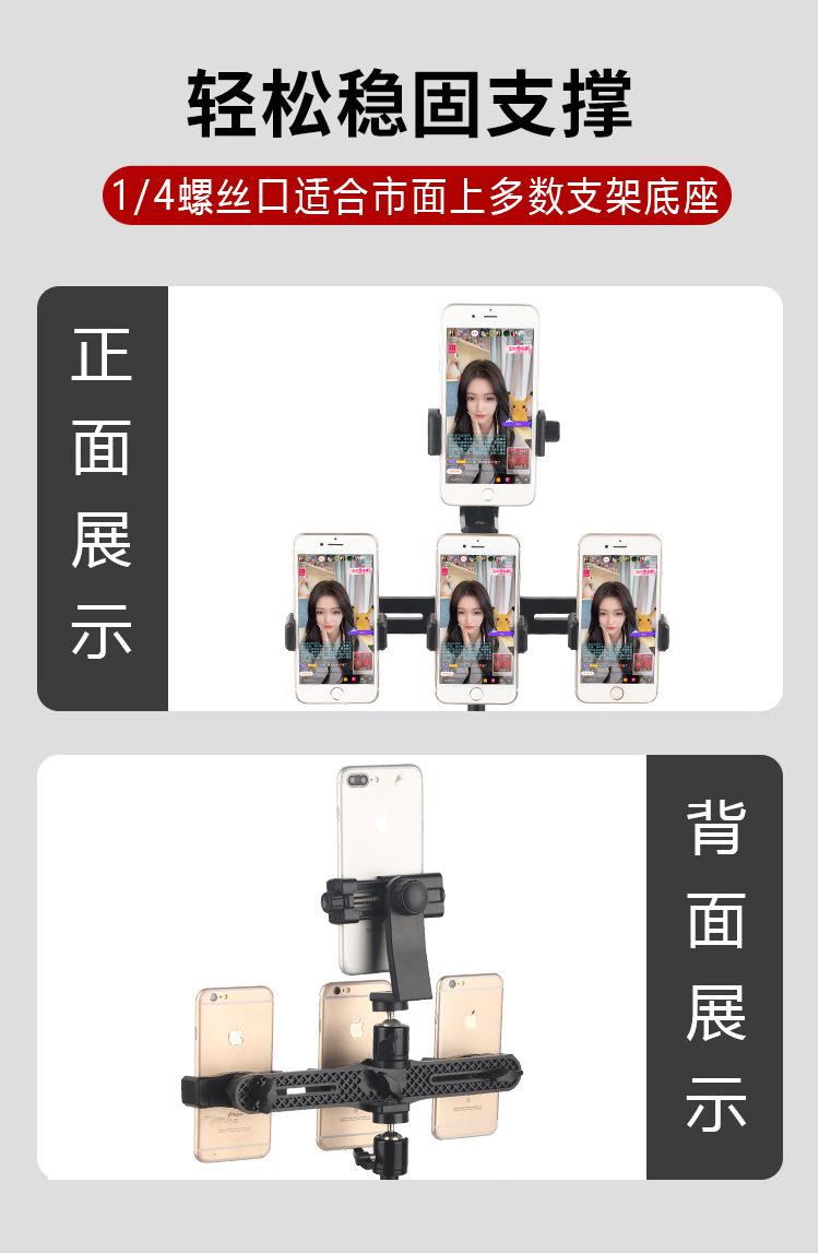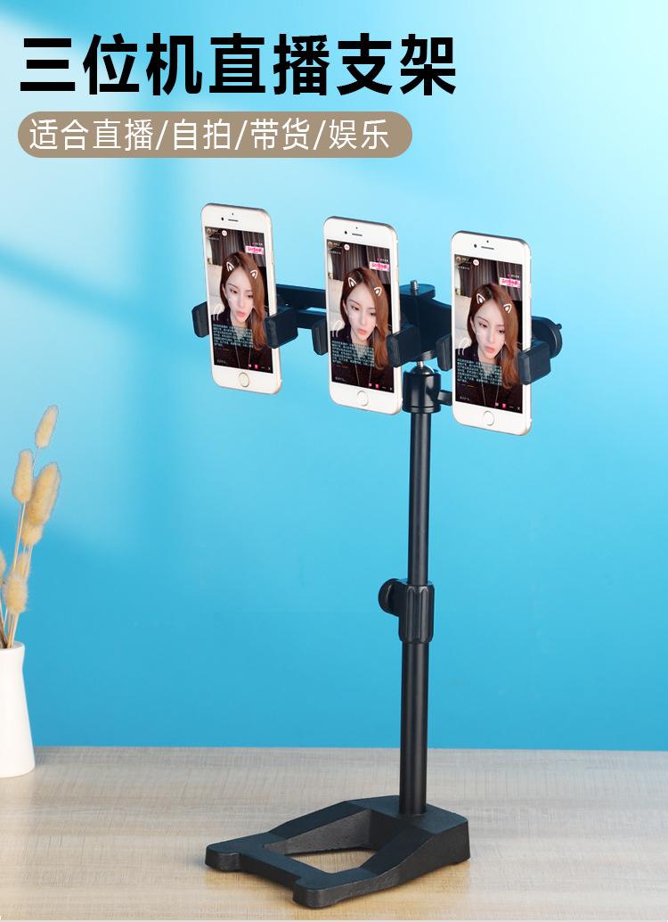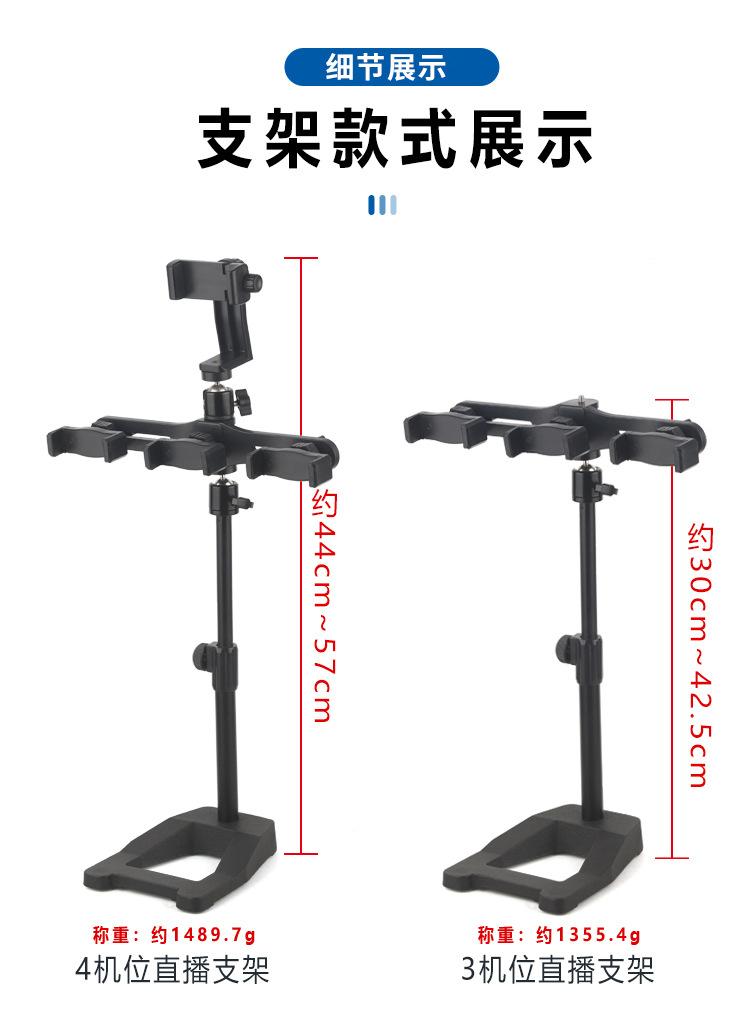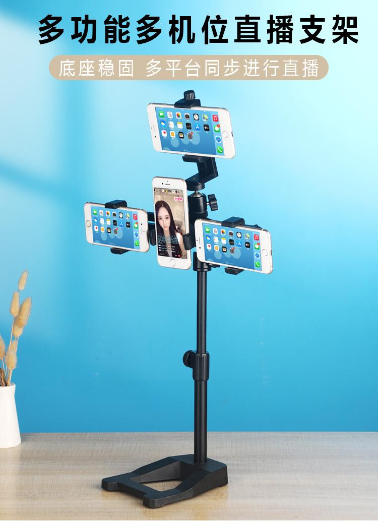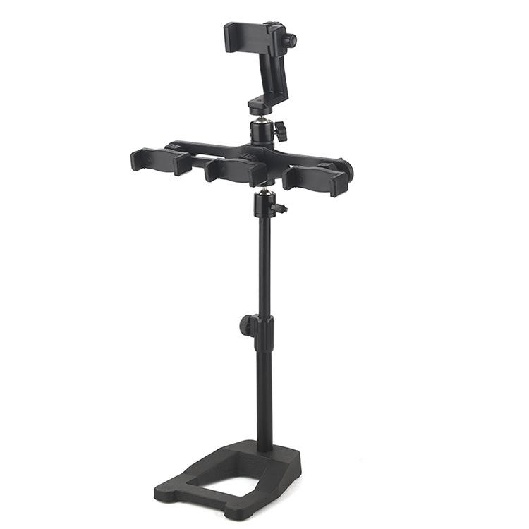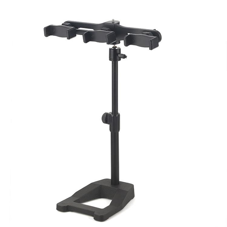 El soporte para transmisión en vivo de teléfono móvil con cabezal de clip para múltiples cámaras hace vibrar tres o cuatro teléfonos móviles al mismo tiempo con una base de soporte de escritorio