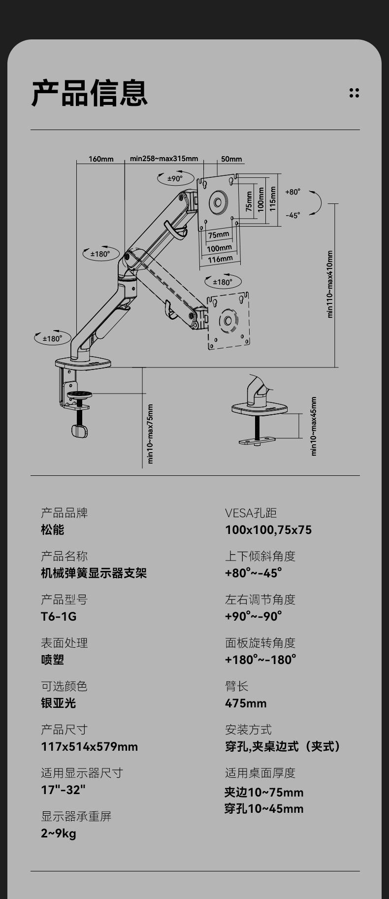 Soporte para monitor de computadora, brazo mecánico, pantalla de visualización, voladizo, elevación, orificio VESA, base de escritorio T6G