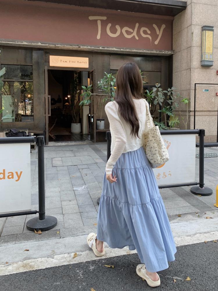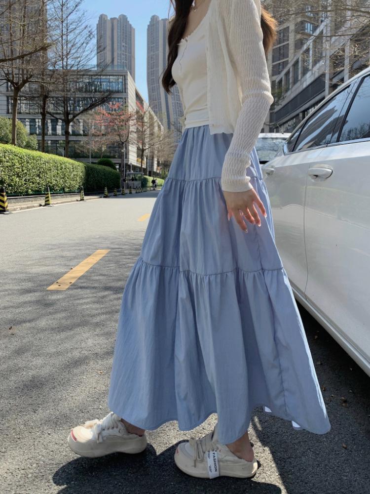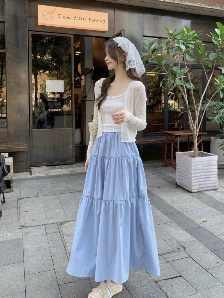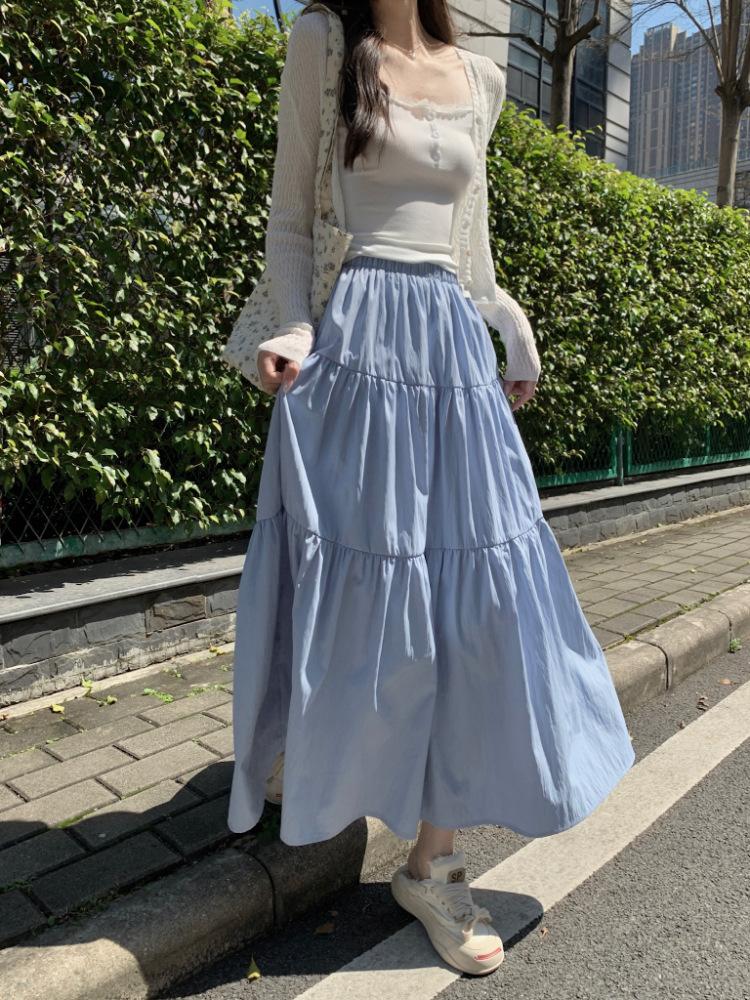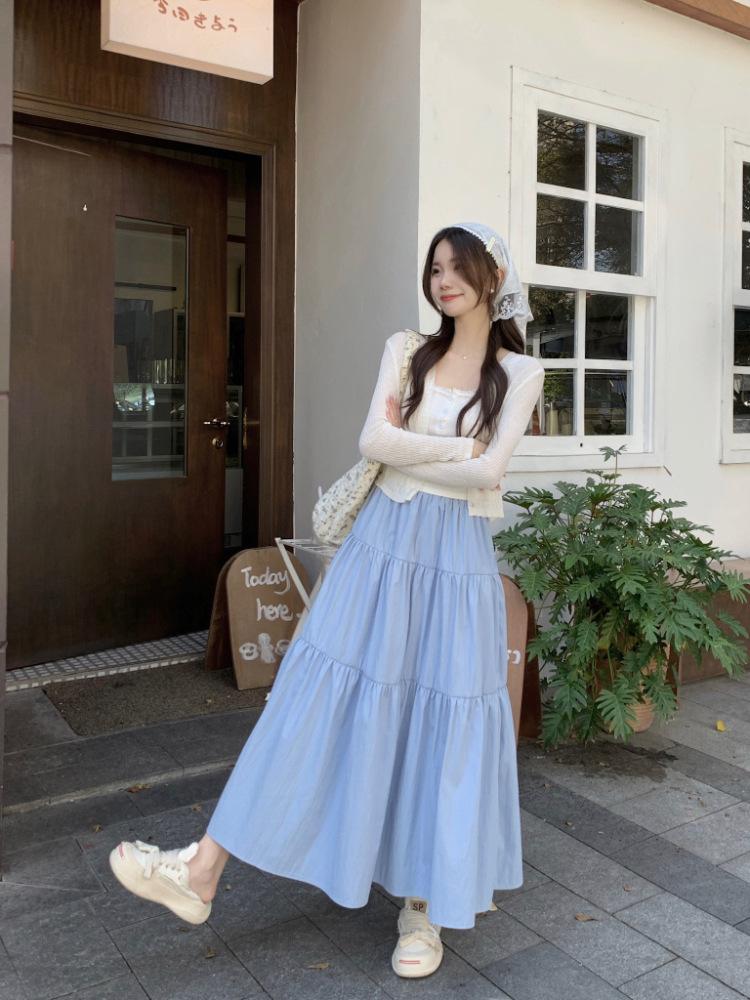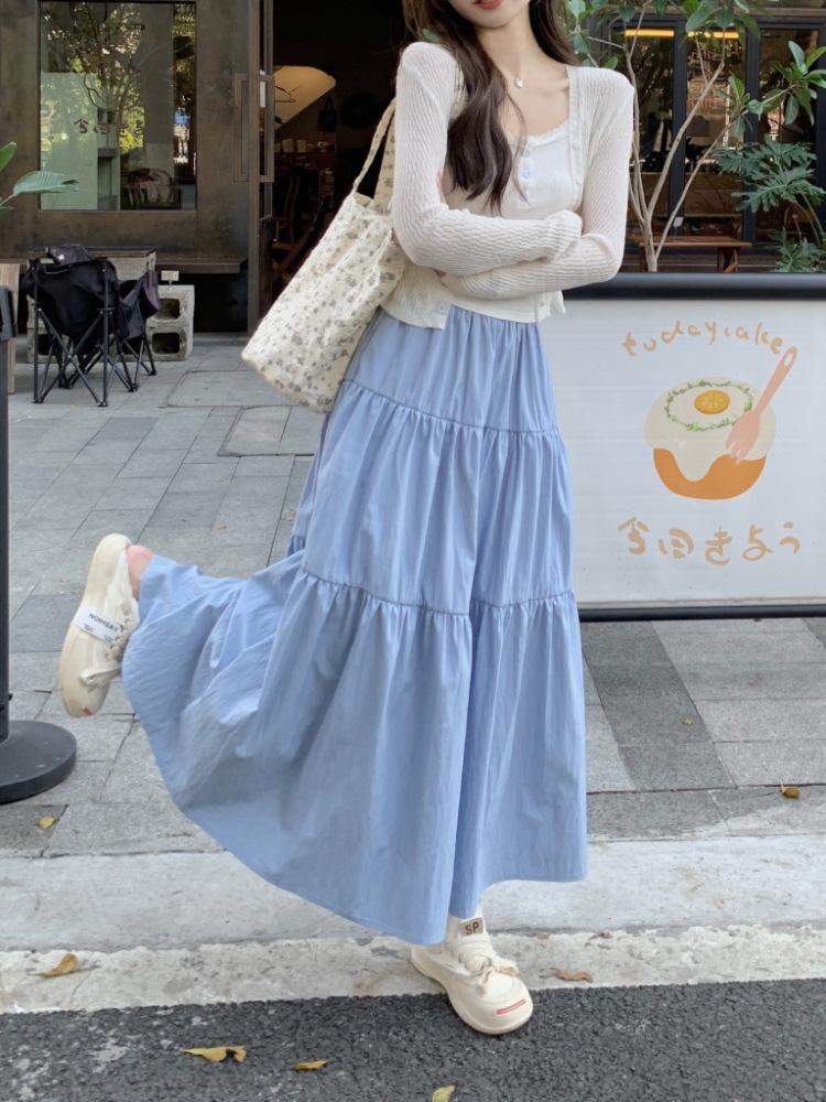 Falda Azul Suave para Mujer, Otoño 2025, Dulce, Rejuvenecedora, Adelgazante, con Capas, Falda Larga Petite A-Line