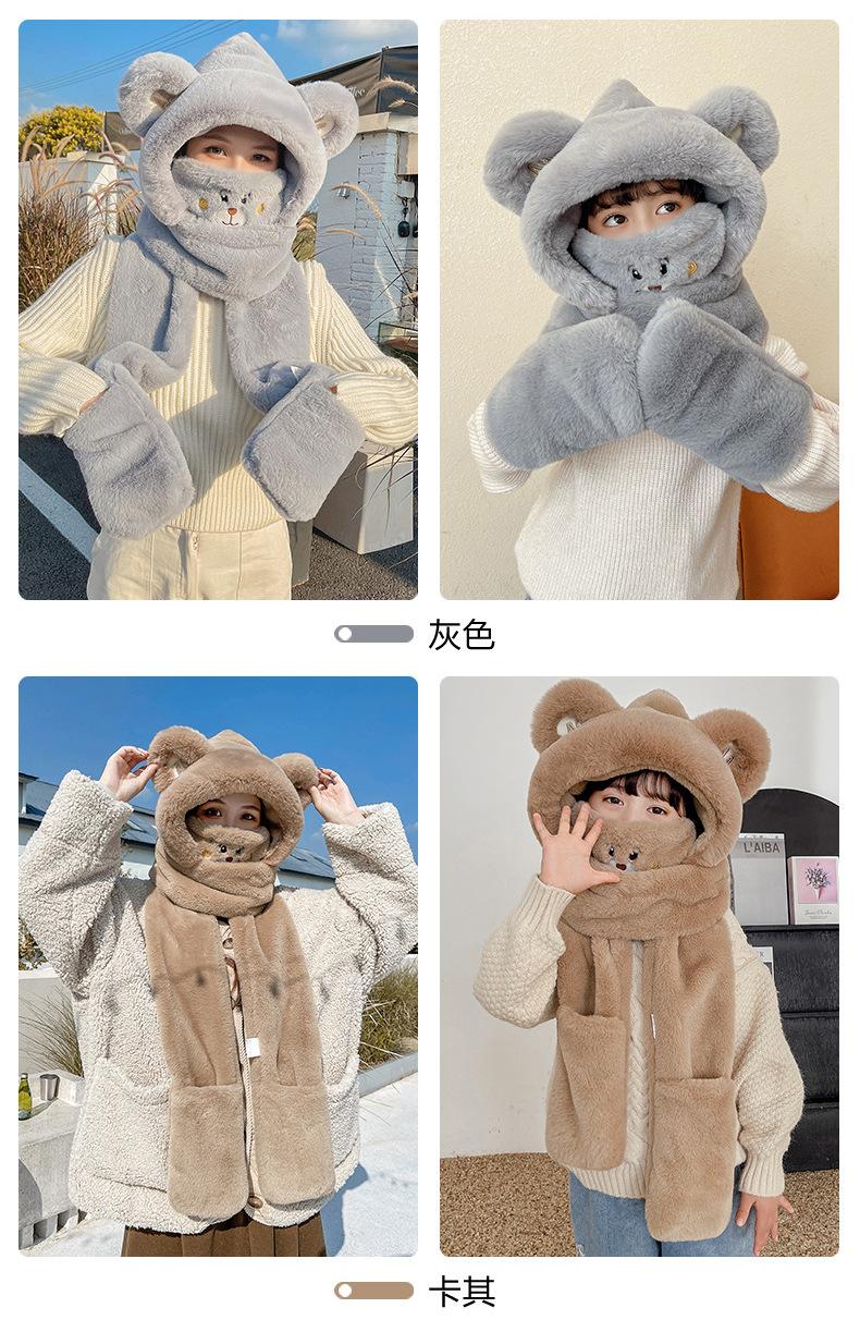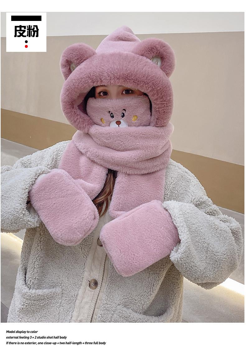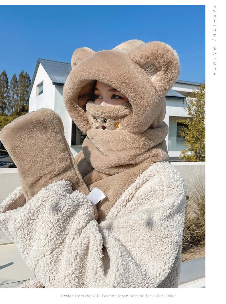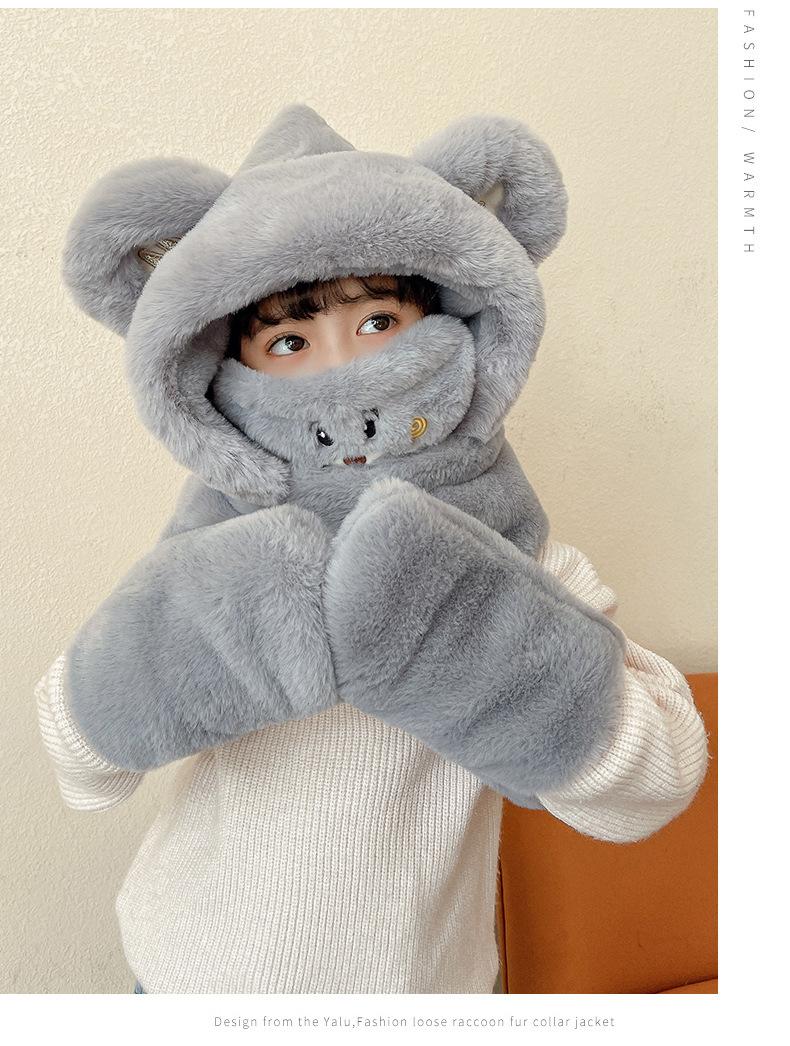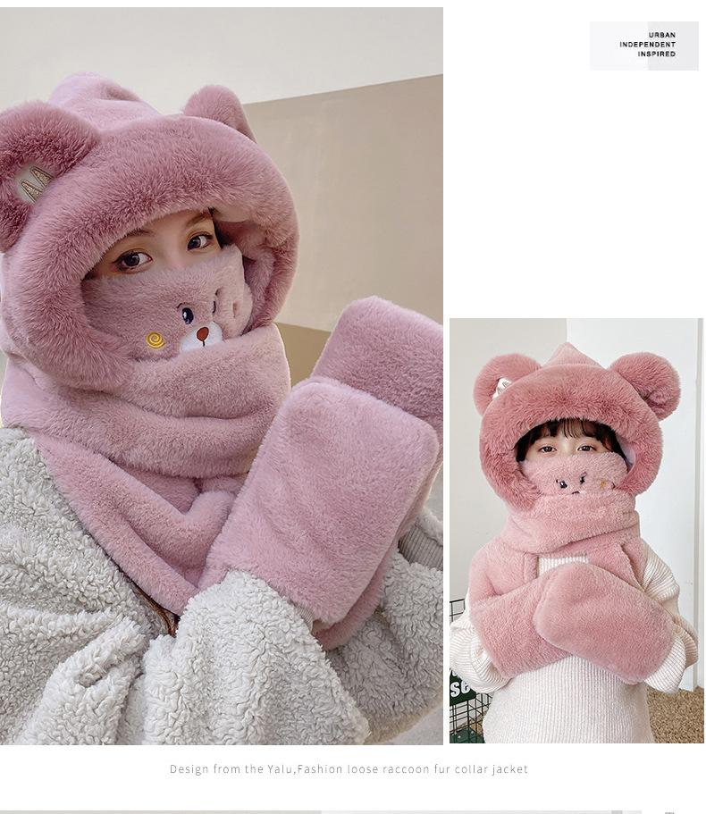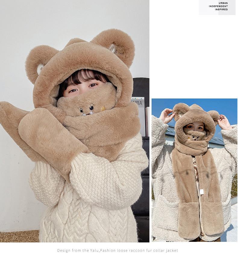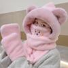 Gorro de oso estilo coreano, bonito gorro para mujer, bufanda para todo tipo de otoño e invierno, guantes cálidos integrados, bufanda, traje de tres piezas de moda