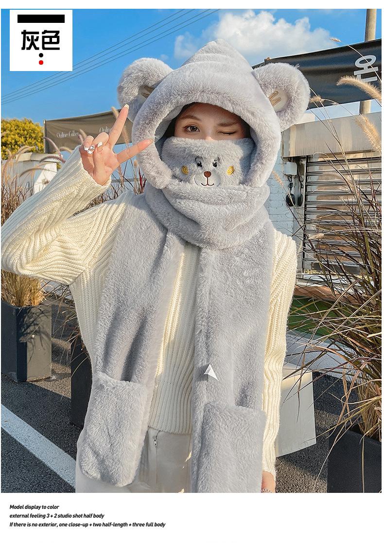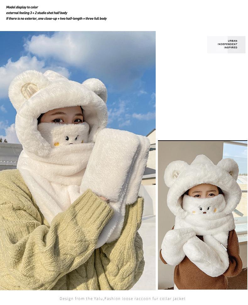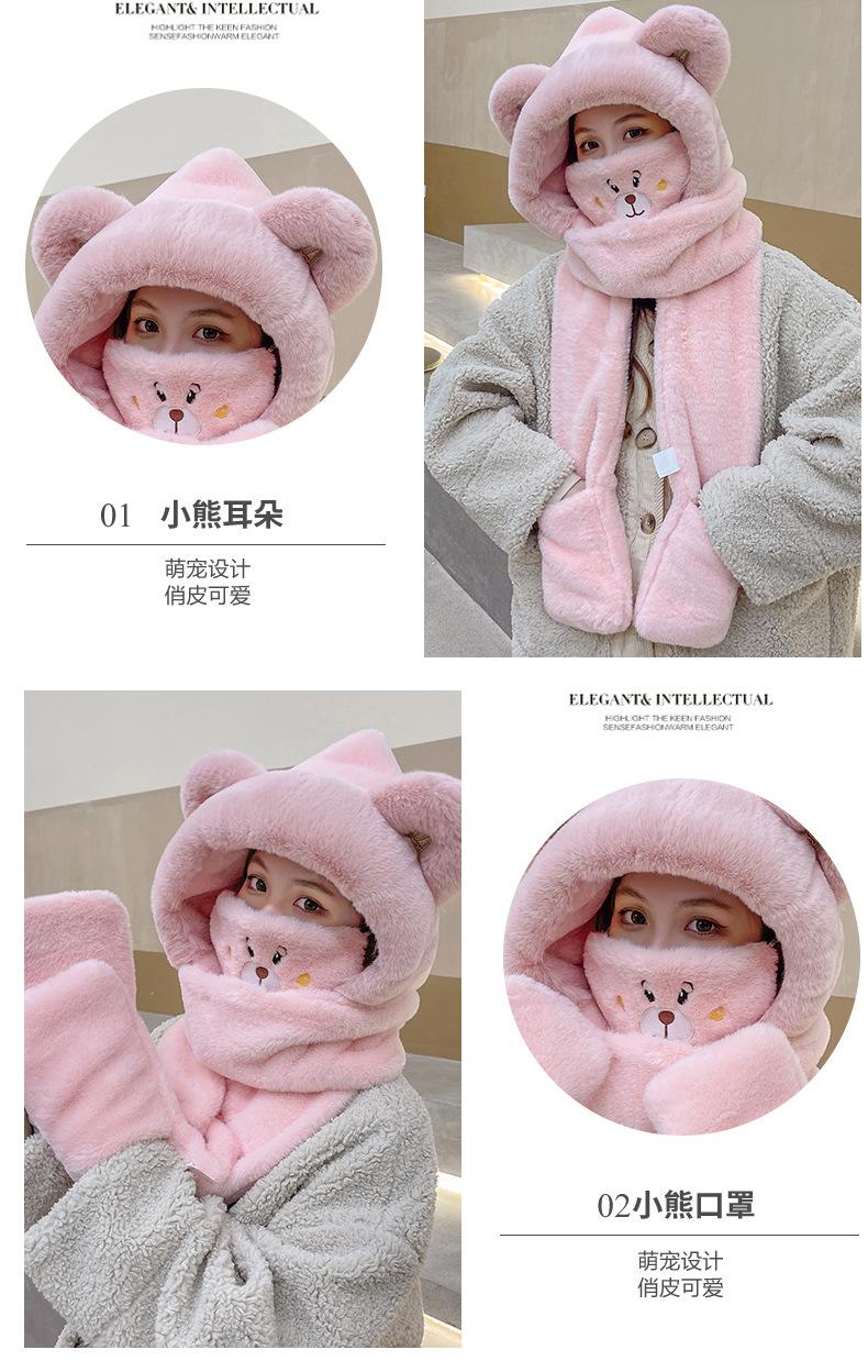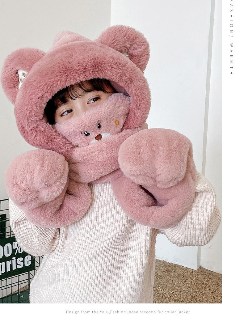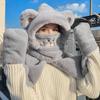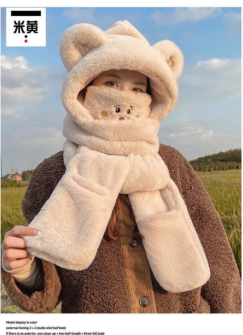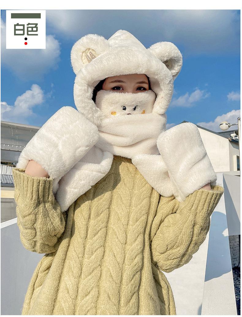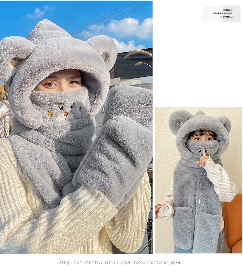 Gorro de oso estilo coreano, bonito gorro para mujer, bufanda para todo tipo de otoño e invierno, guantes cálidos integrados, bufanda, traje de tres piezas de moda