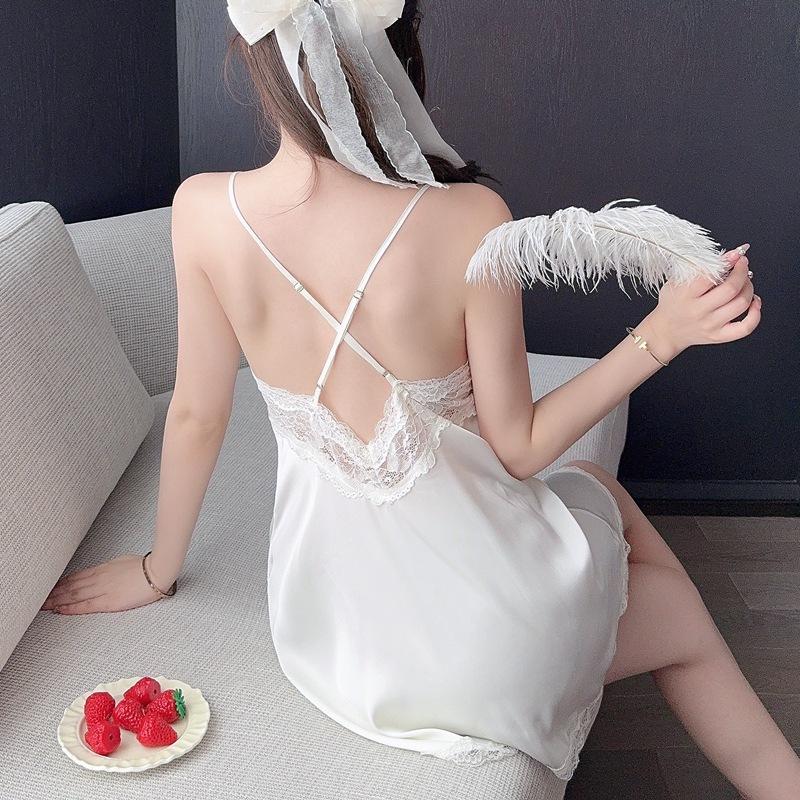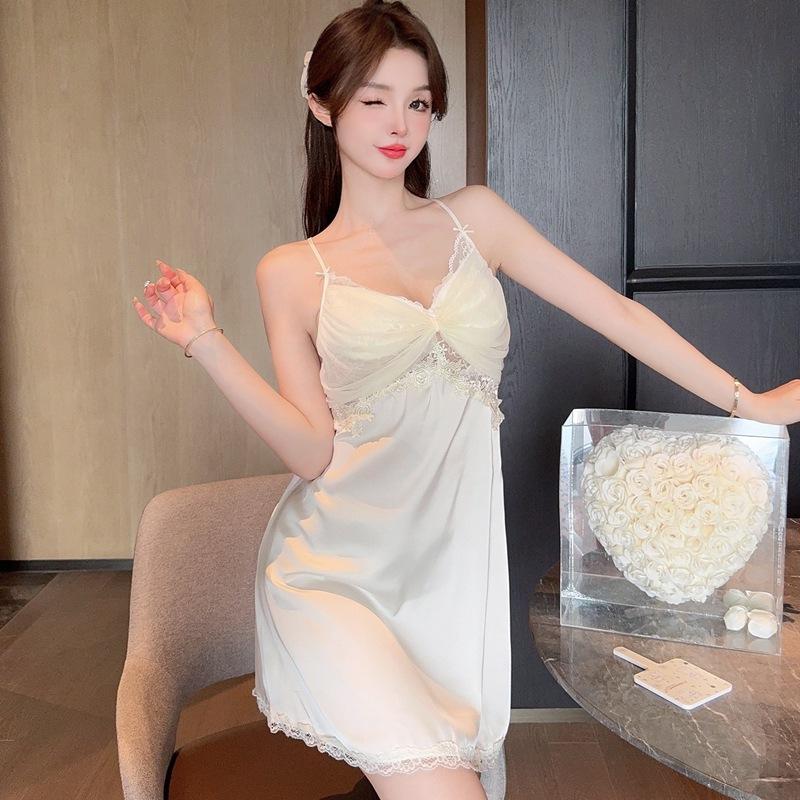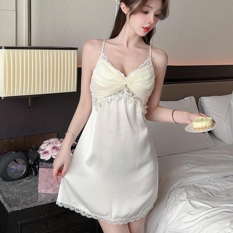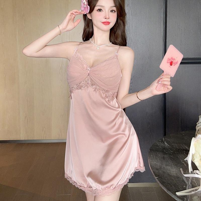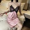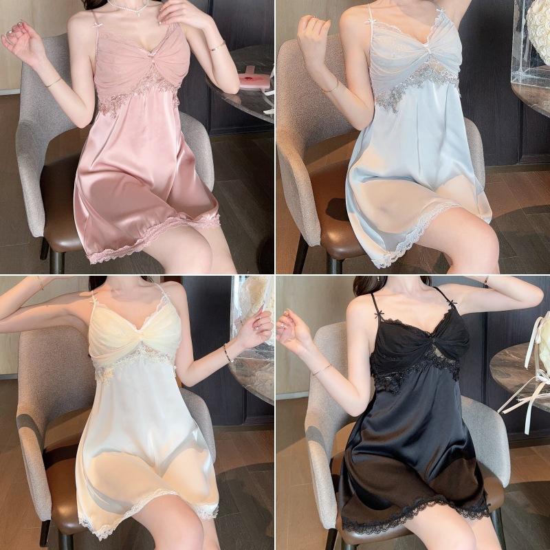 2024 Nuevo Verano Sexy Pijama Camisón de Tirantes de Seda de Hielo para Mujer Satén Encaje Tirantes de Belleza Almohadilla para el Pecho Ropa para el Hogar