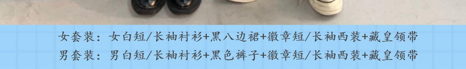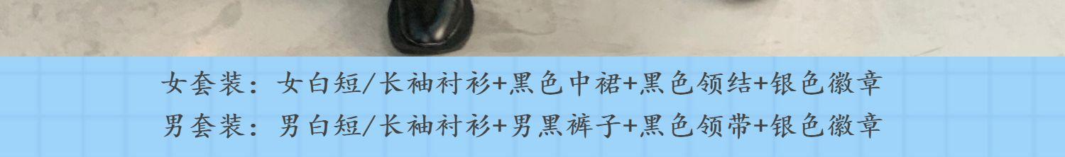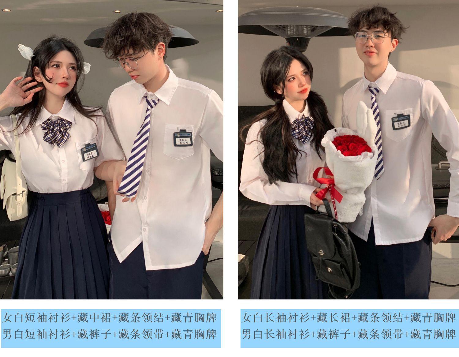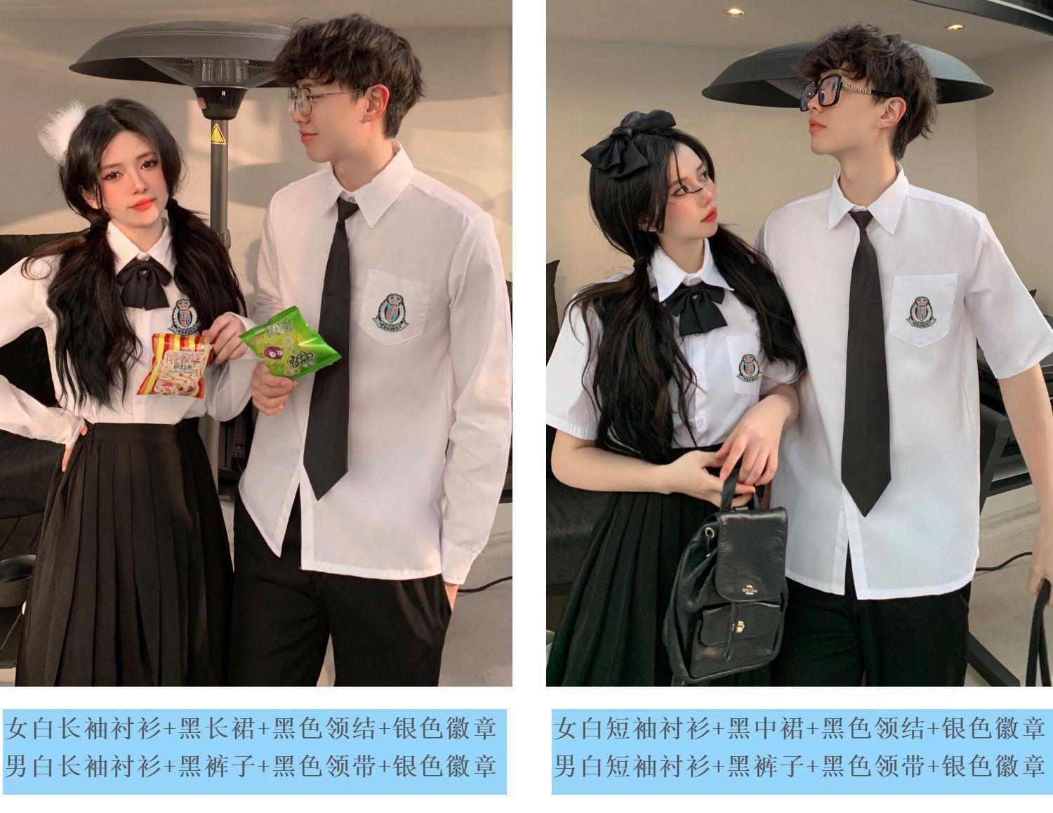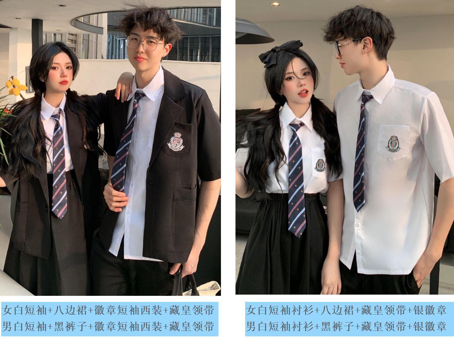 Women's white short-sleeved + black eight-sided skirt + badge short-sleeved suit + blue crown tie, Men's white...