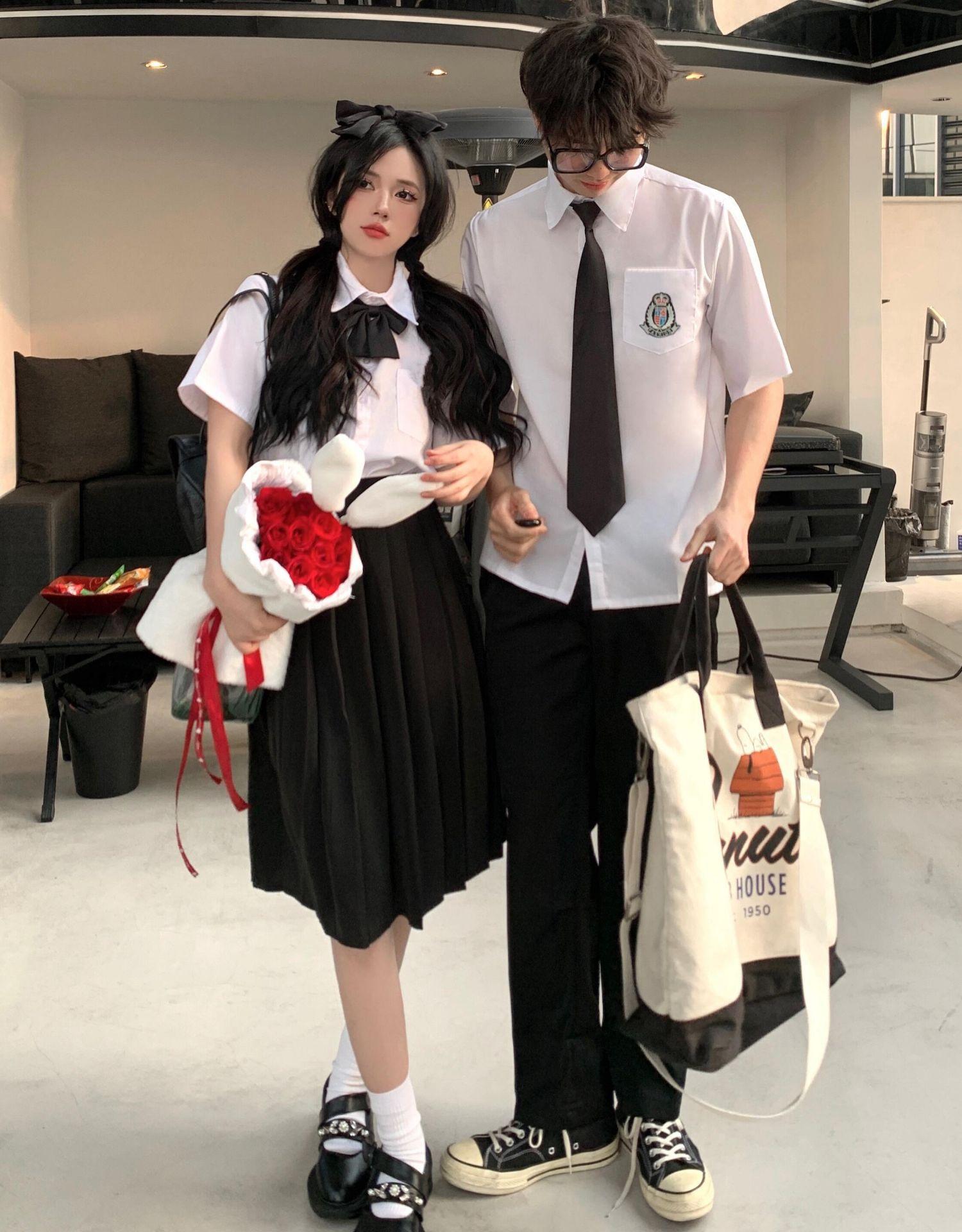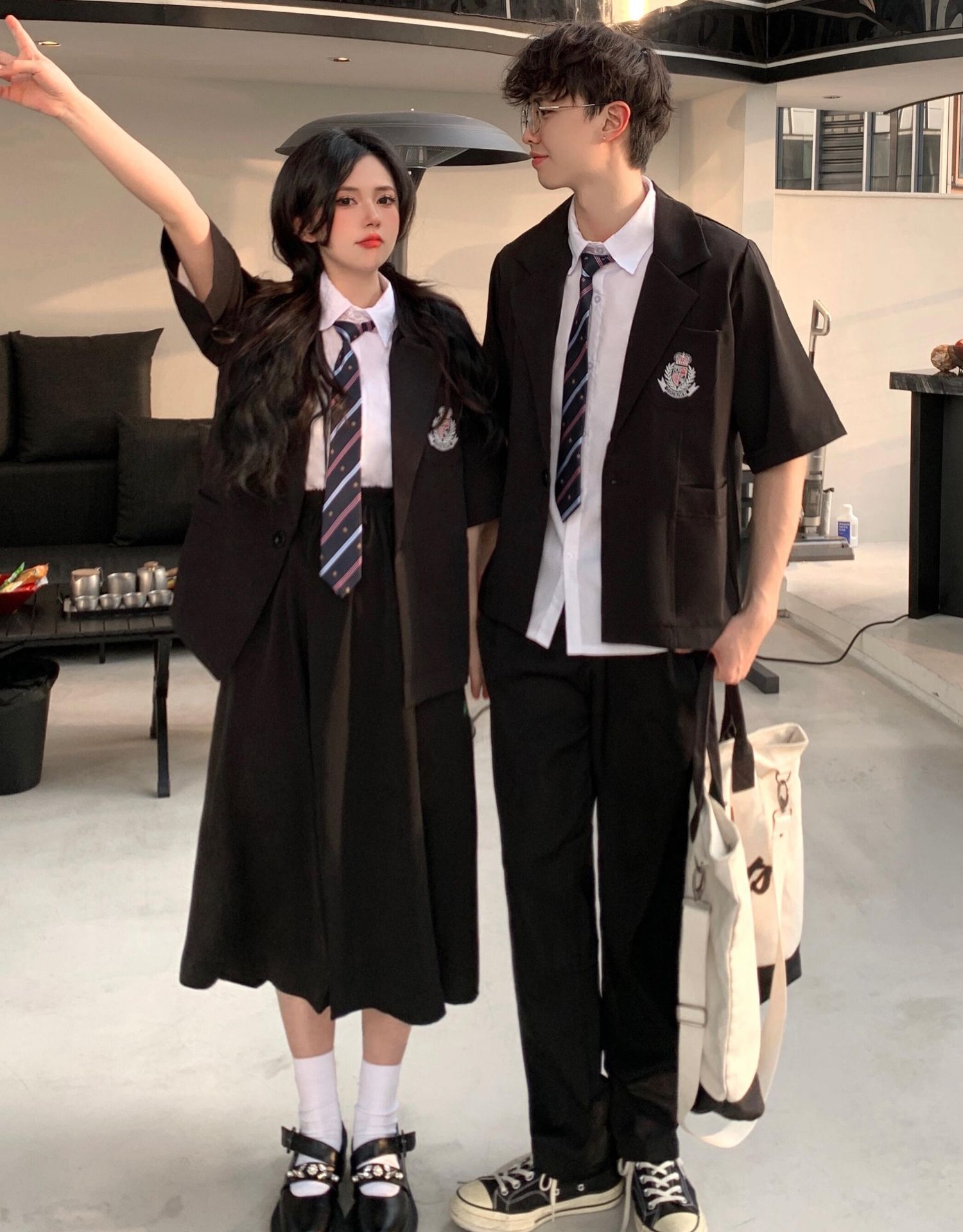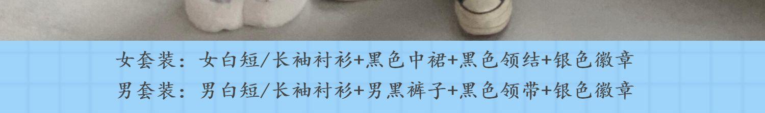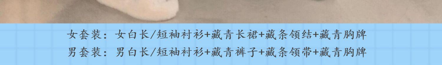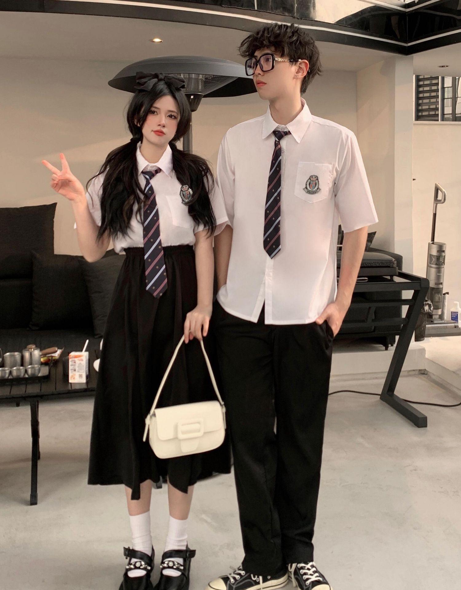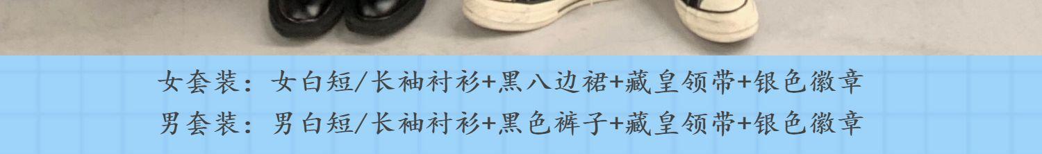 Women's white short-sleeved + black eight-sided skirt + badge short-sleeved suit + blue crown tie, Men's white...