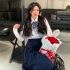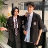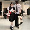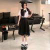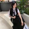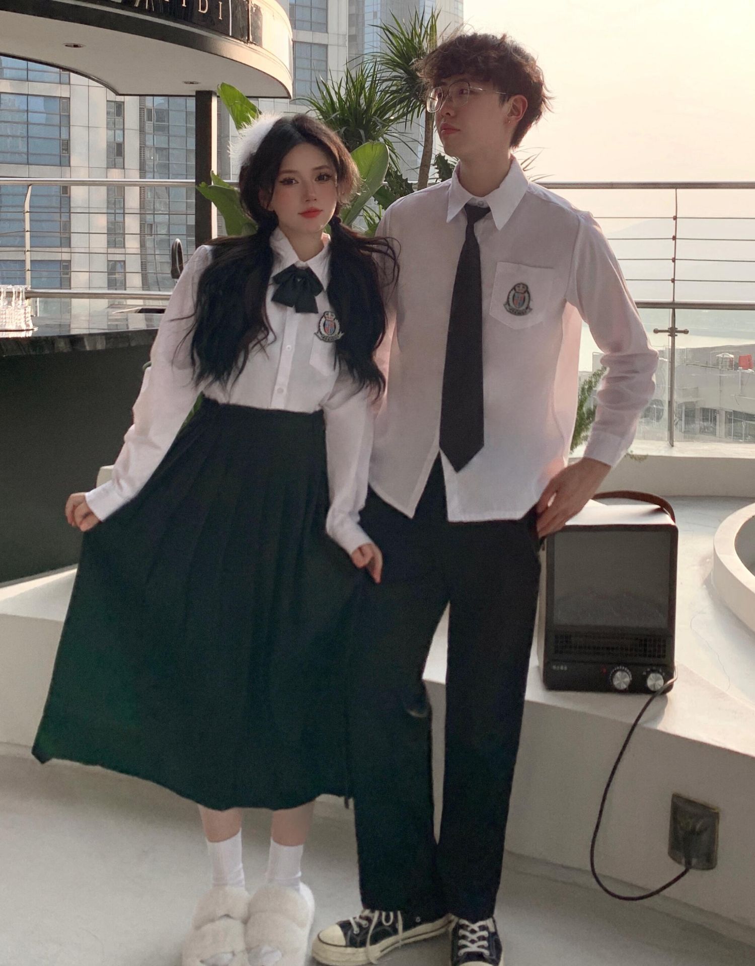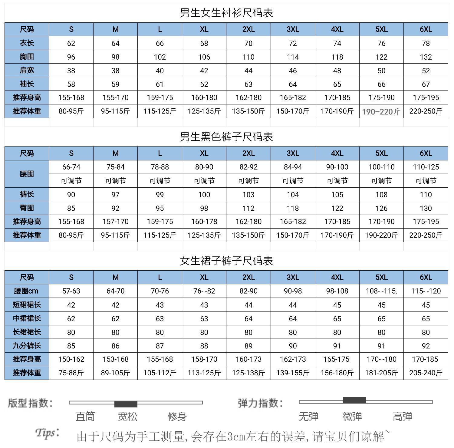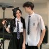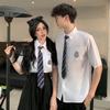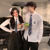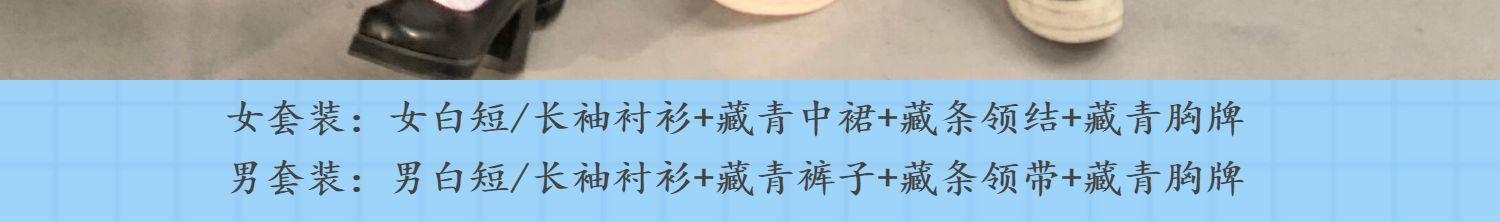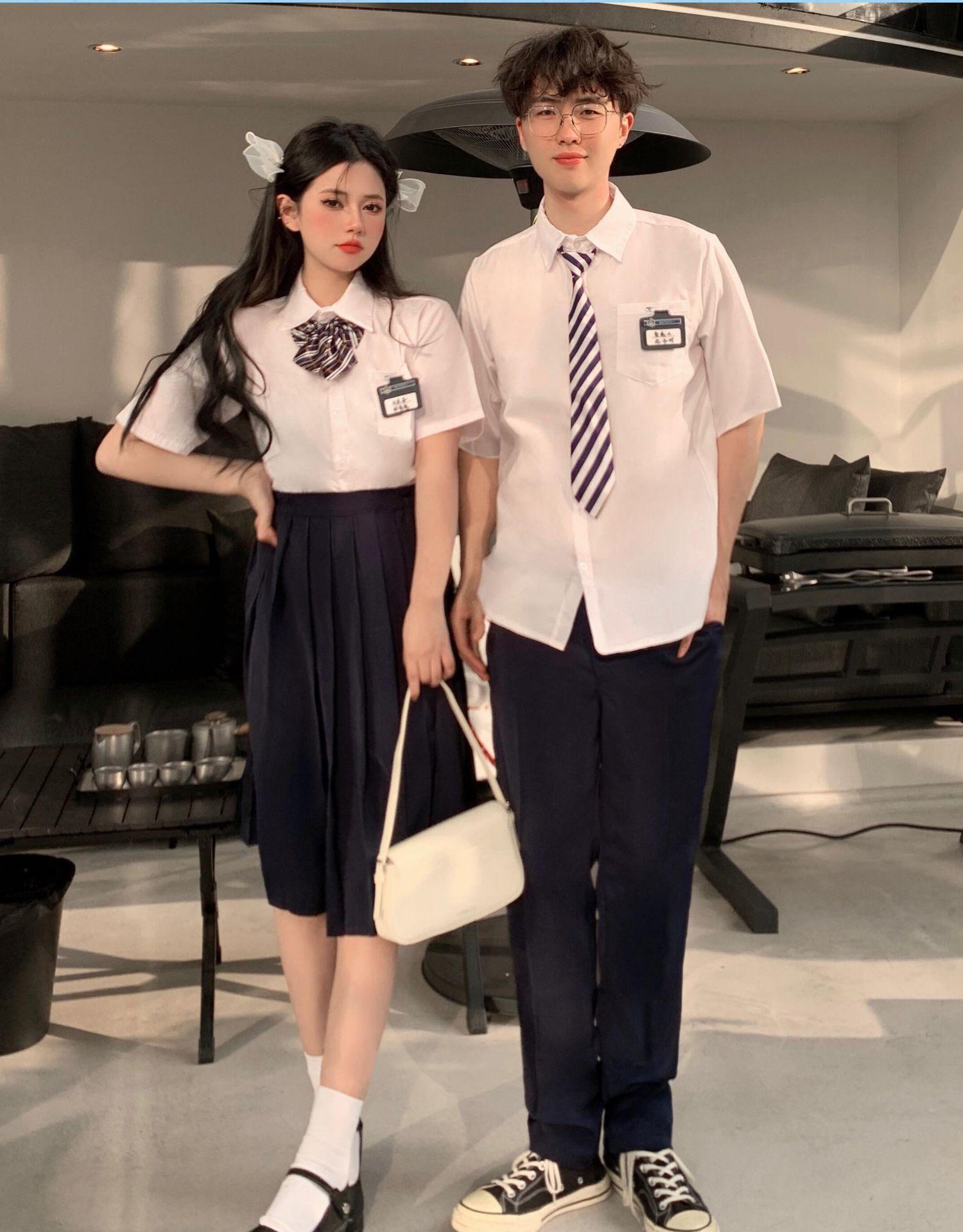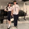 Women's white short-sleeved + black eight-sided skirt + badge short-sleeved suit + blue crown tie, Men's white...