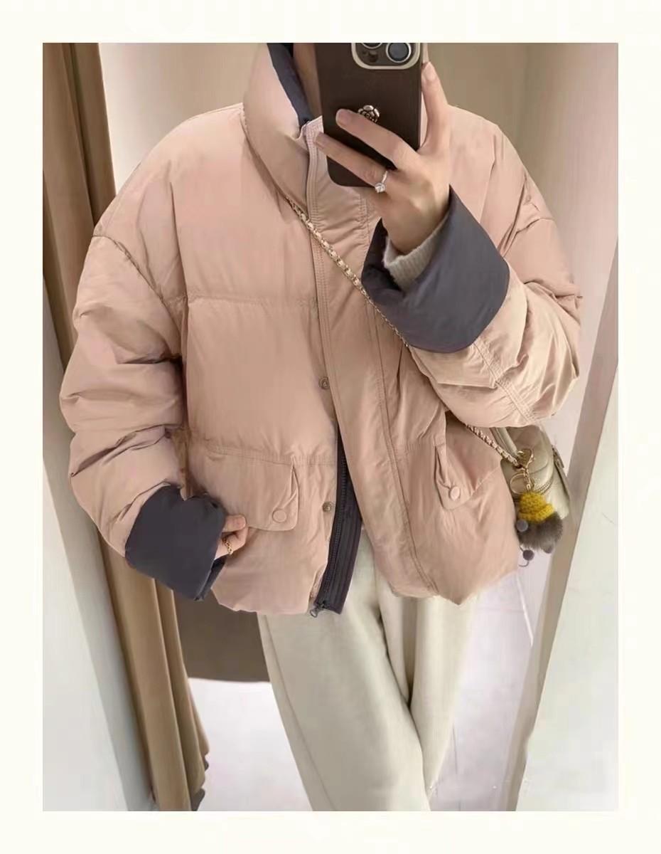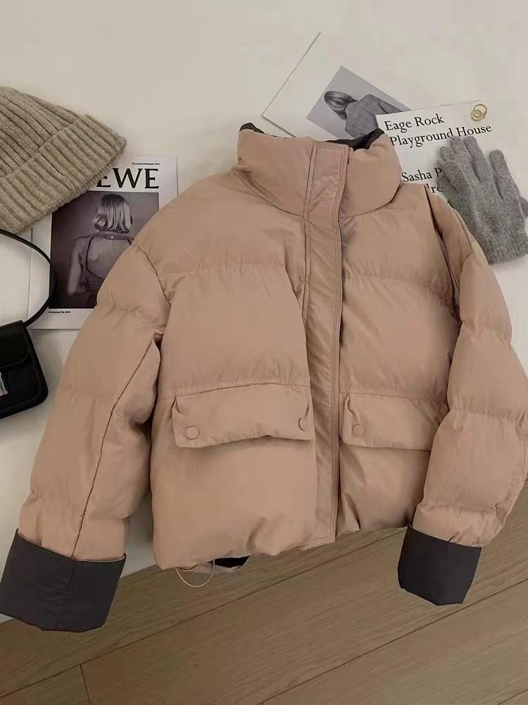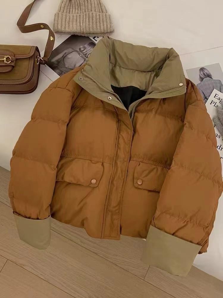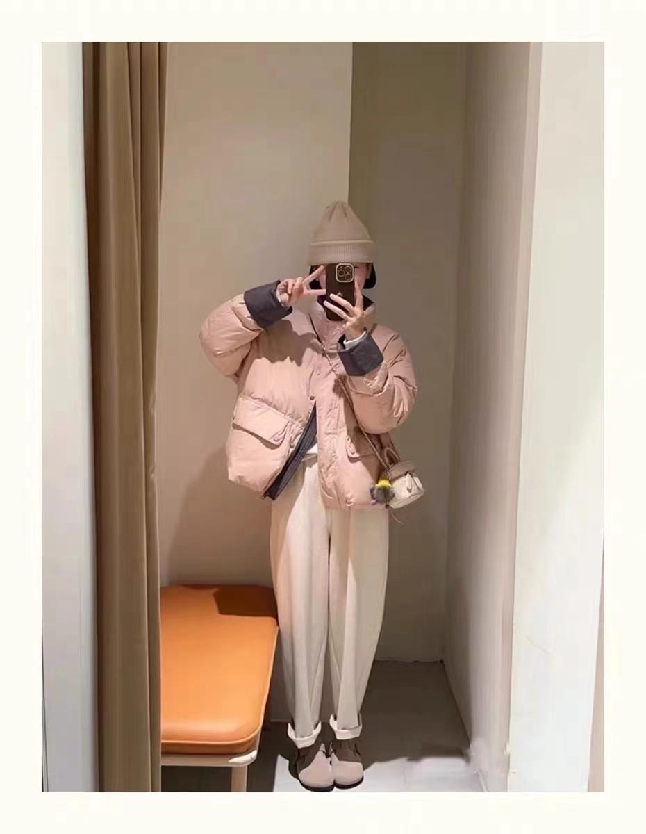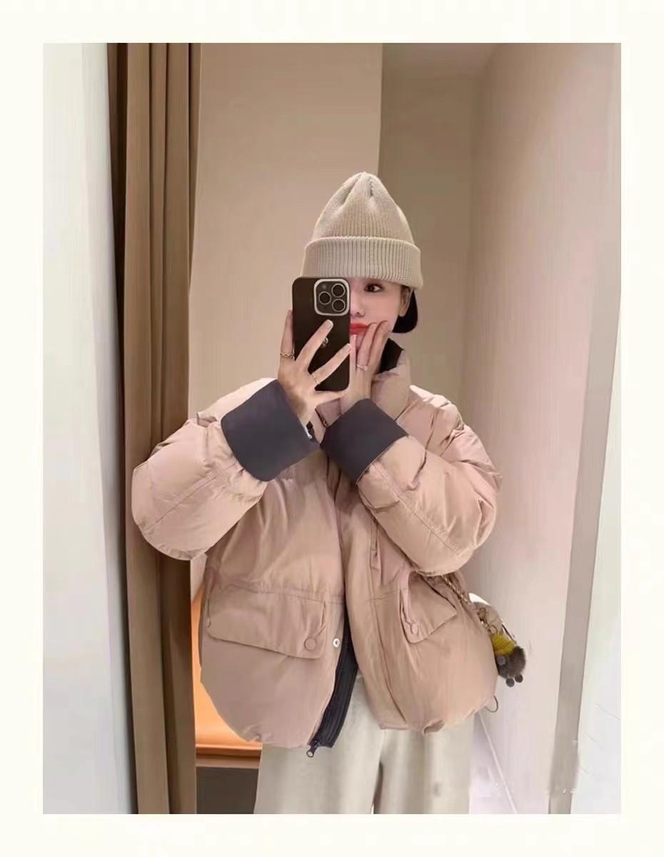 Chamarra de plumón de estilo coreano con color contrastante 2024 Invierno Nuevo Suelta y a la moda Color dopamina Gruesa Cálida Cuello alto Chaqueta tipo pan