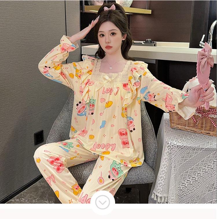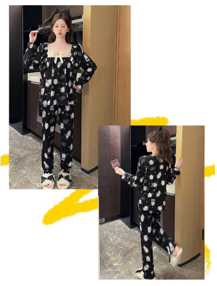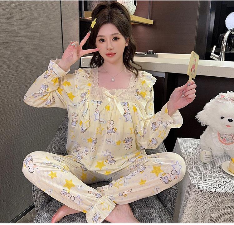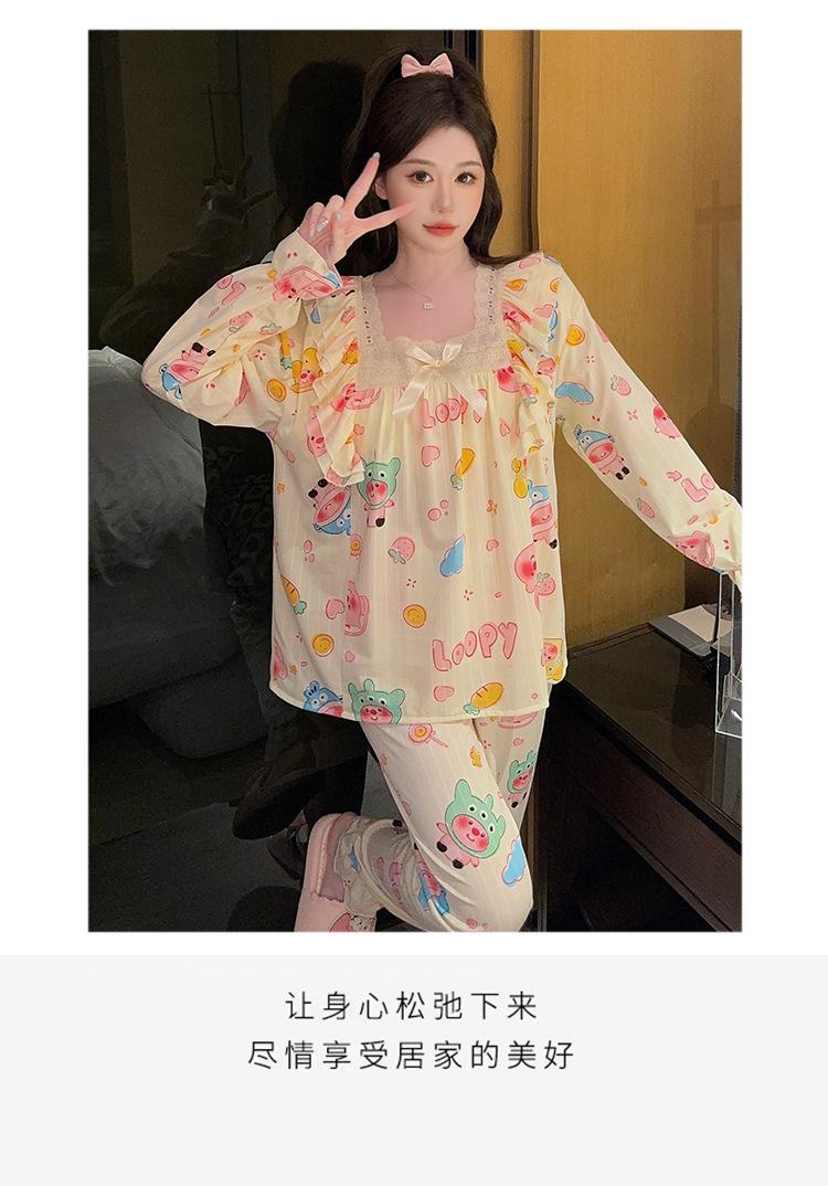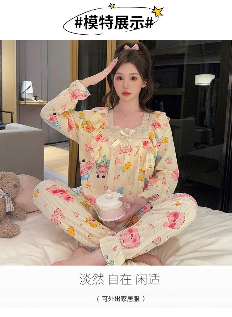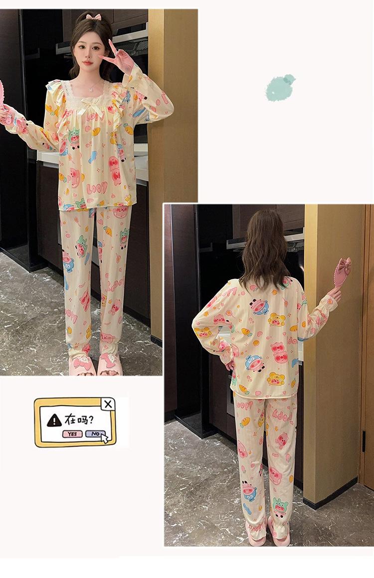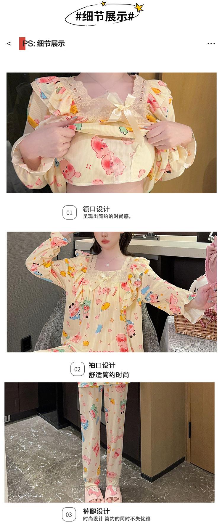 Pijama para Mujer Primavera y Otoño Lindo Dibujo Animado Manga Larga Pantalones con Almohadilla en el Pecho Talla Grande Chica Gordita Ropa Exterior Ropa para el Hogar
