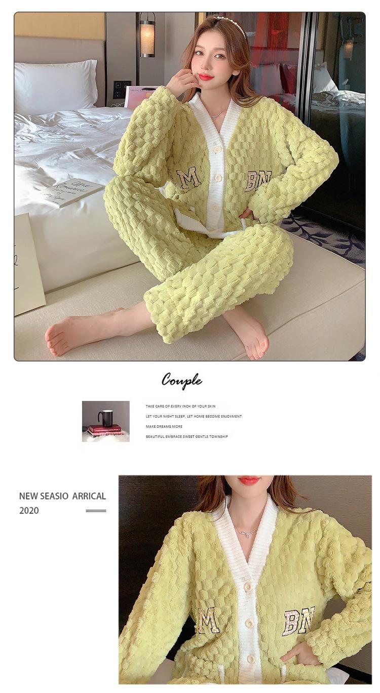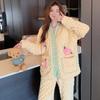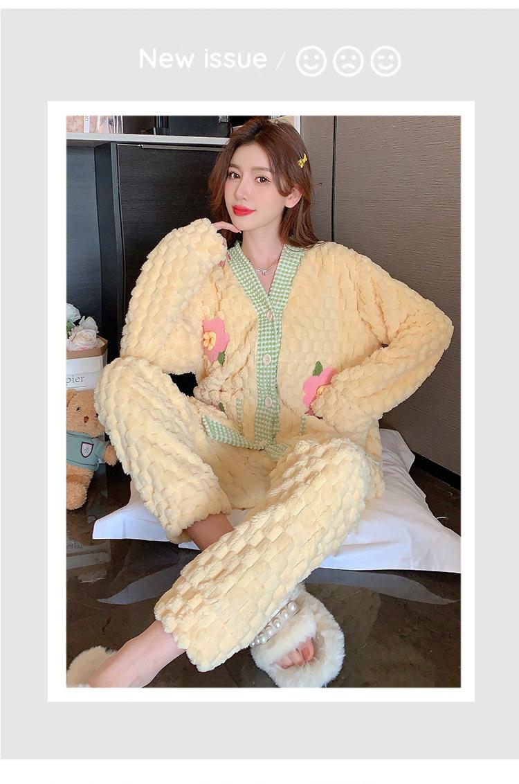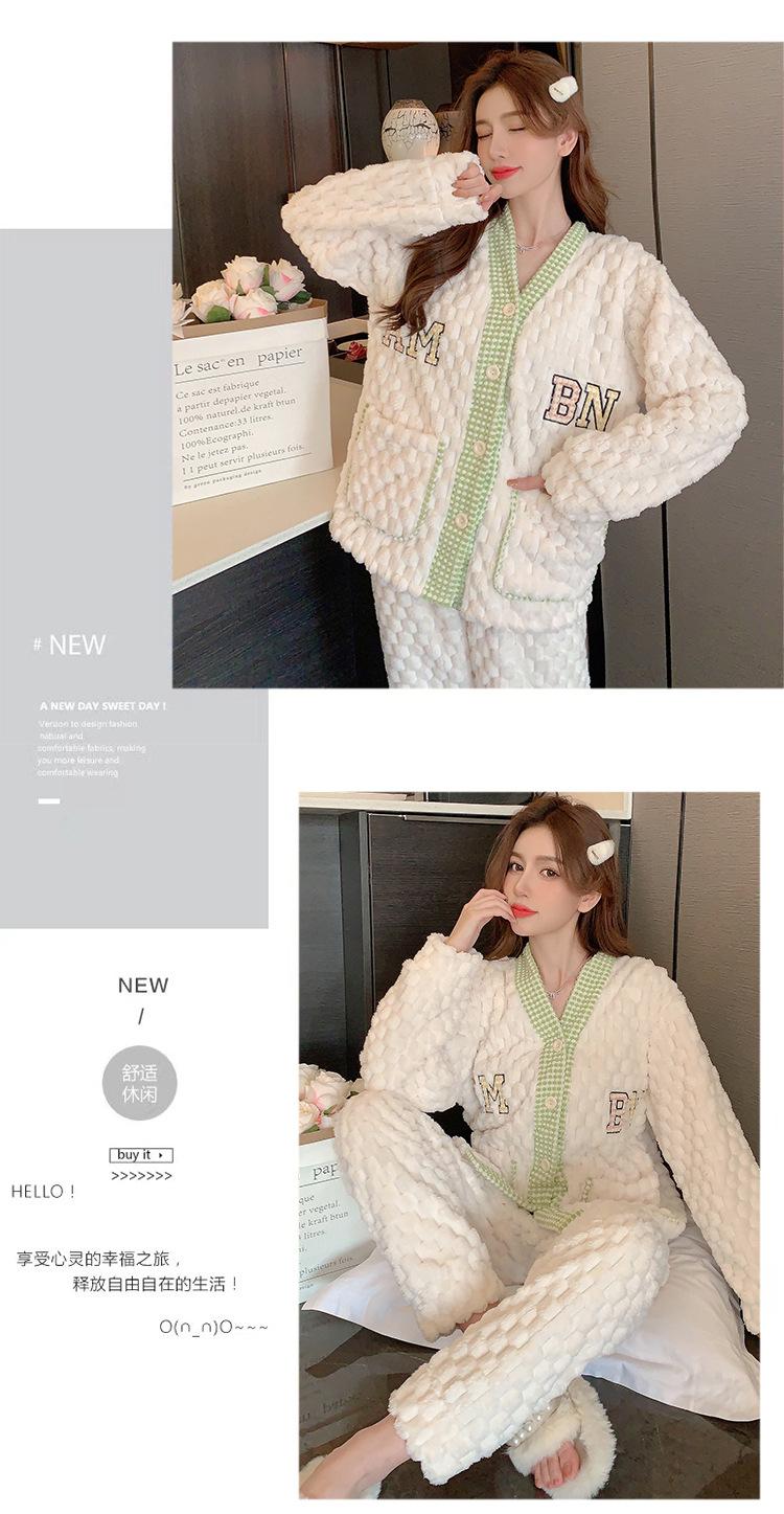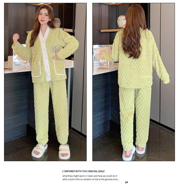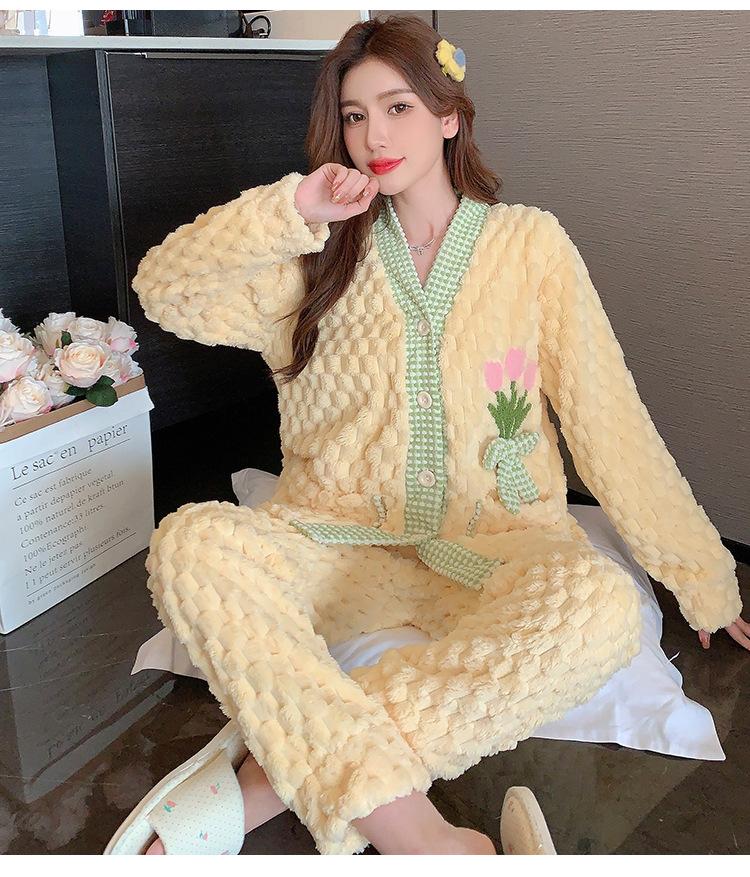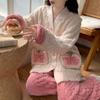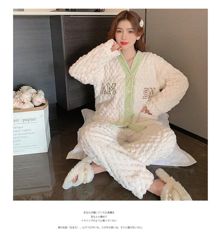 Pijama de lana coral para mujer, de invierno, bonito y dulce, estilo cárdigan de manga larga, pantalones, traje de casa, conjunto de dos piezas