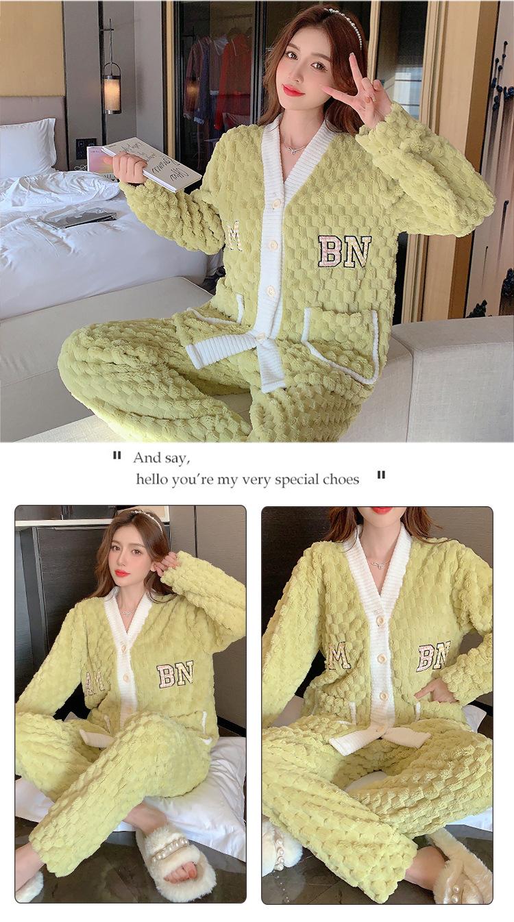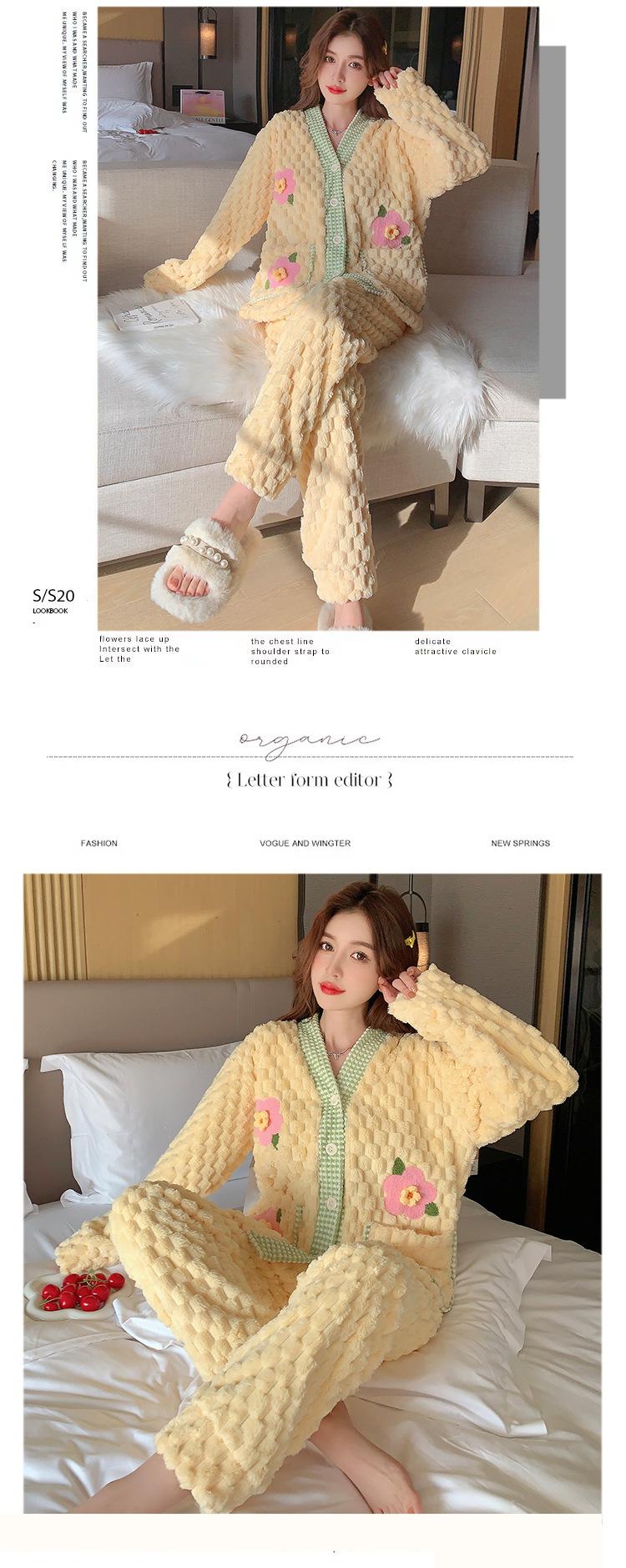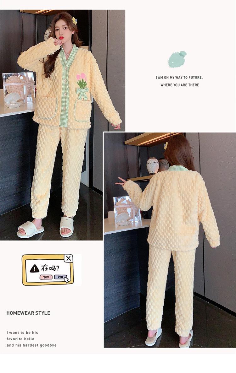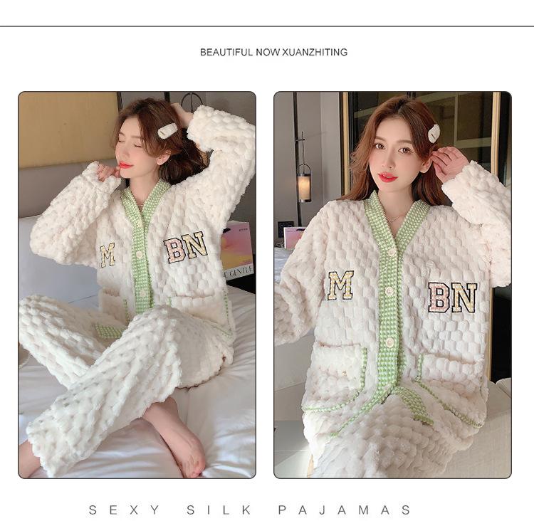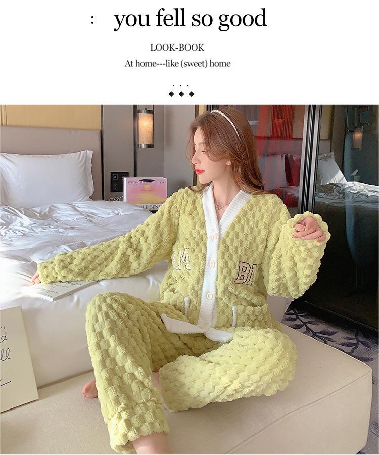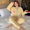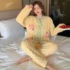 Pijama de lana coral para mujer, de invierno, bonito y dulce, estilo cárdigan de manga larga, pantalones, traje de casa, conjunto de dos piezas
