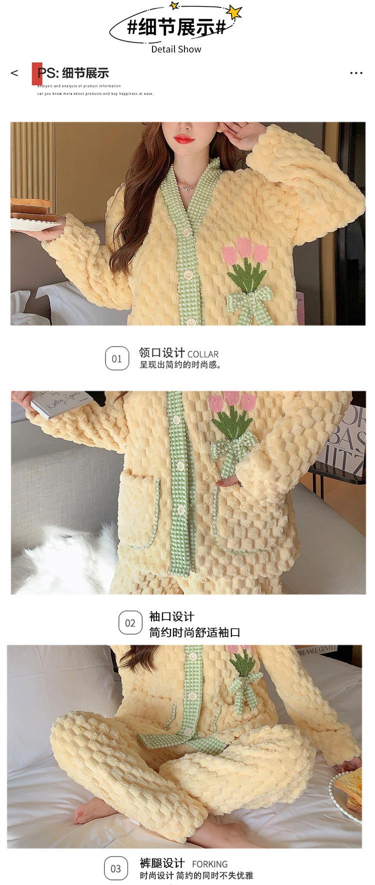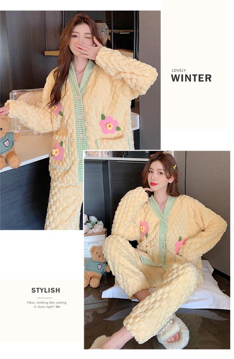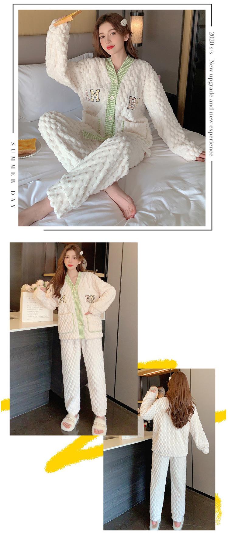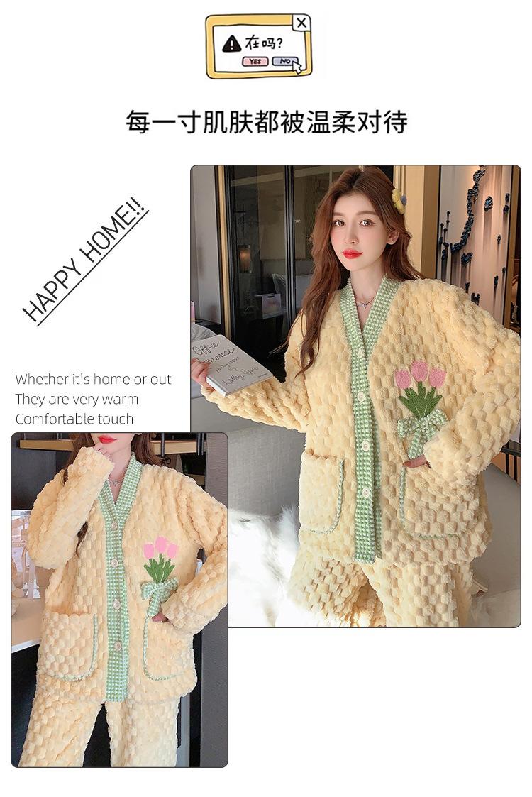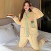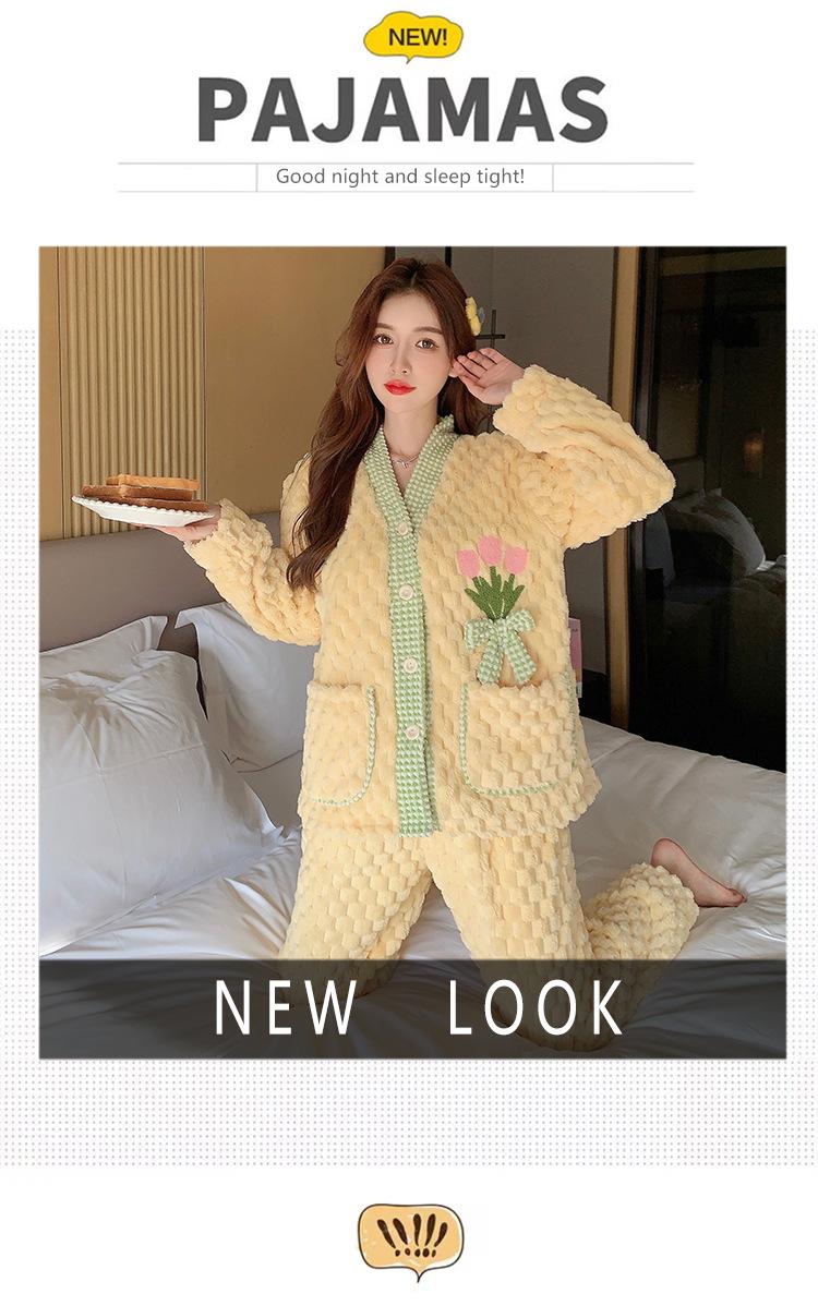 Pijama de lana coral para mujer, de invierno, bonito y dulce, estilo cárdigan de manga larga, pantalones, traje de casa, conjunto de dos piezas