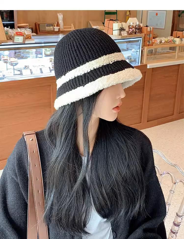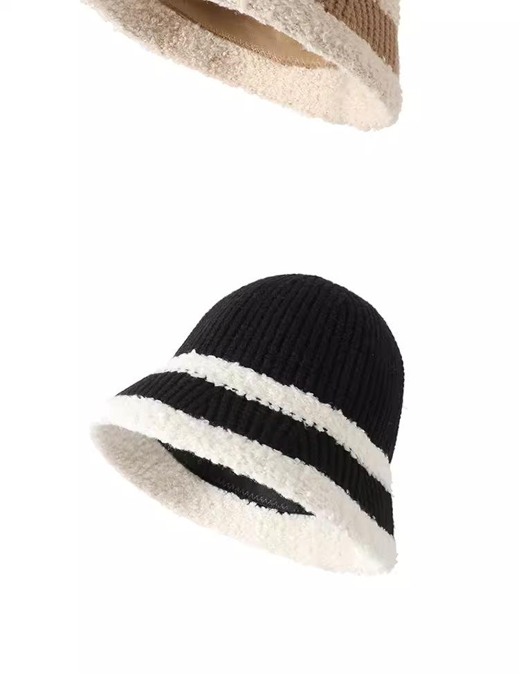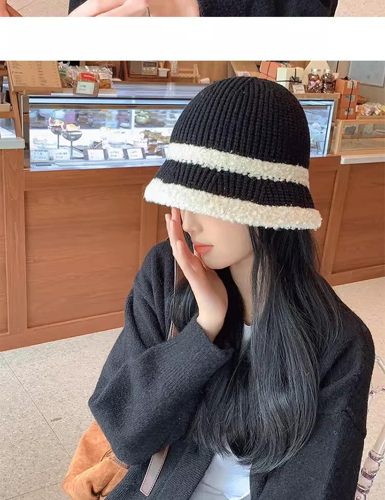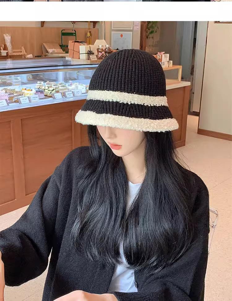 Knitted color-blocked warm basin hat-black, Knitted color-blocked warm basin hat-milk white, Knitted color-blo...