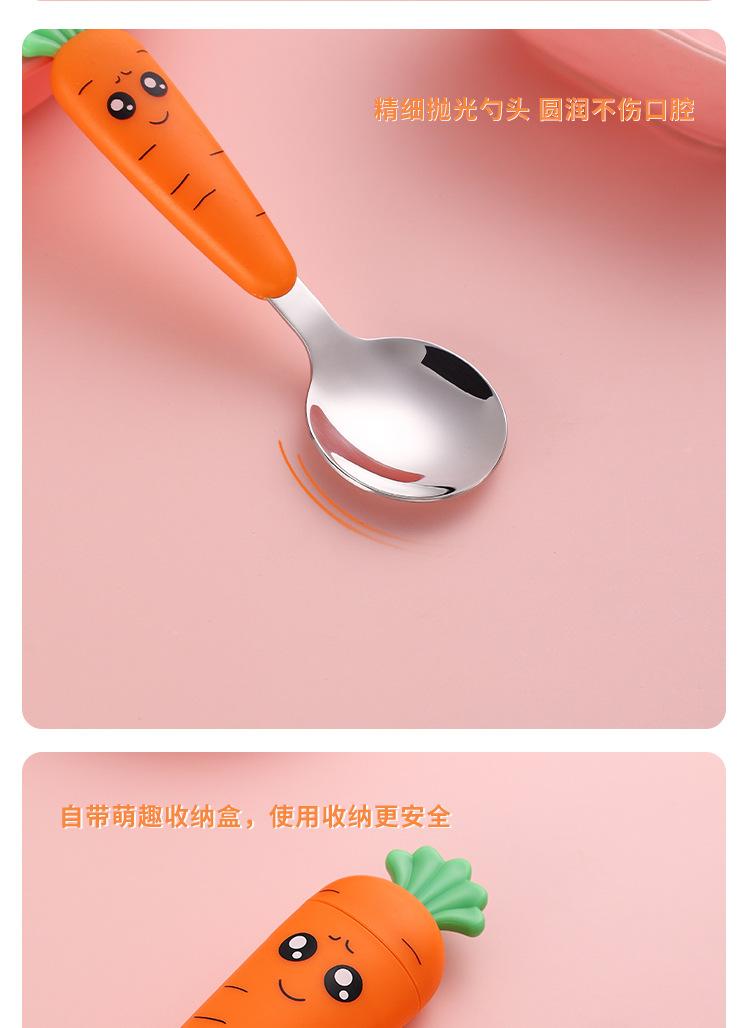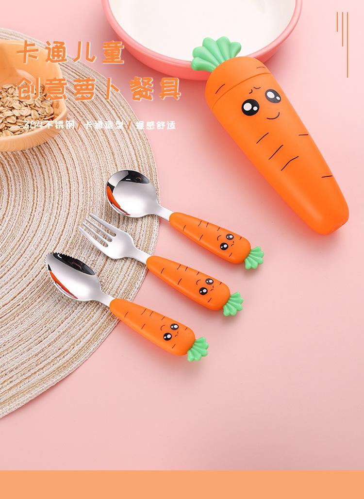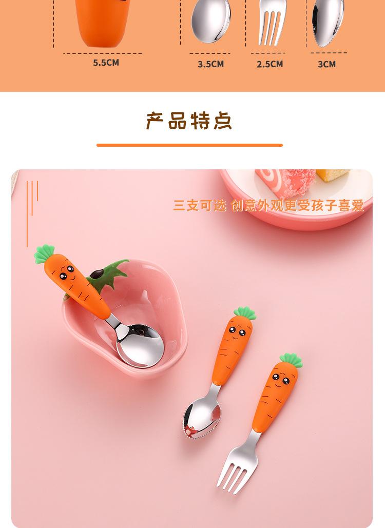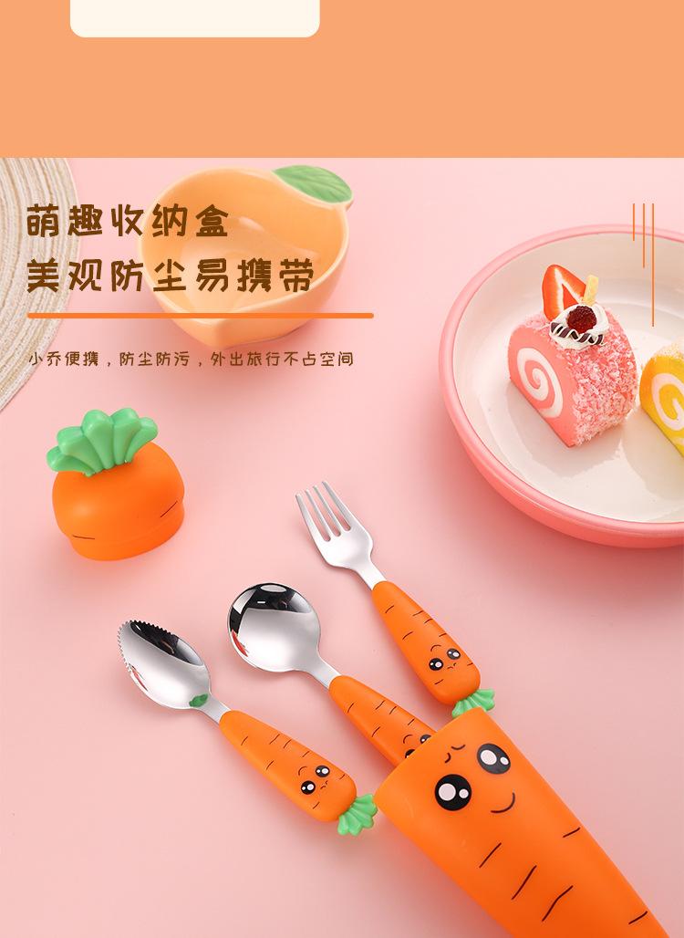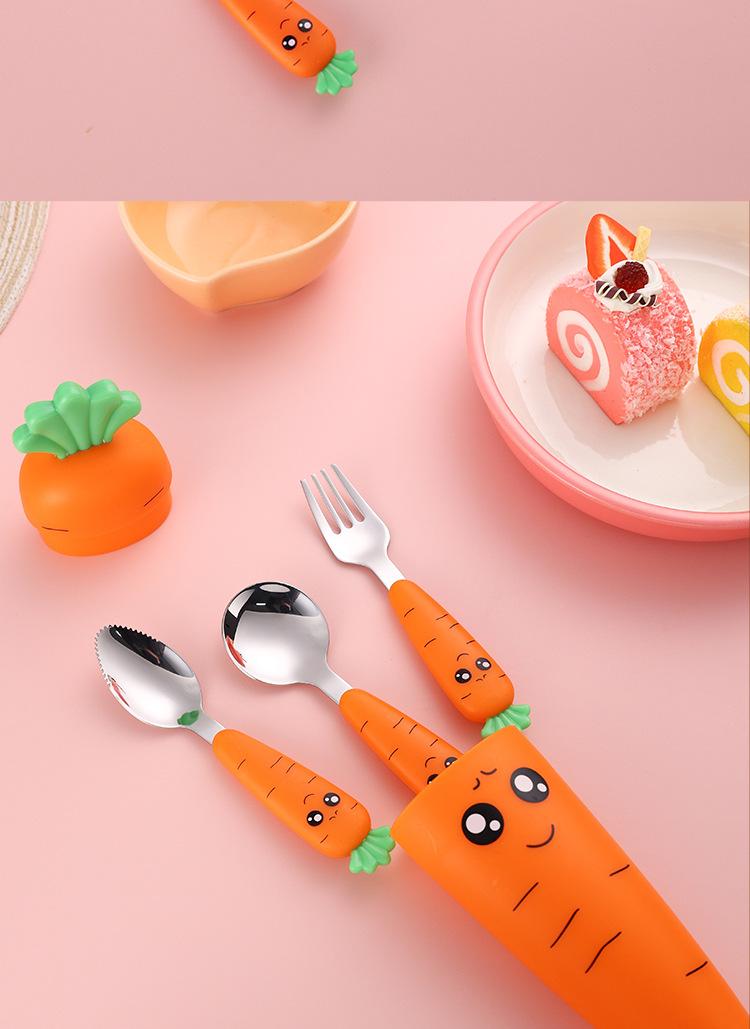 Juego de vajilla infantil de tres piezas de acero inoxidable 304, cuchara raspadora de fruta de rábano de dibujos animados, tenedor de bebé, cuchara, caja de regalo, traje