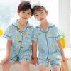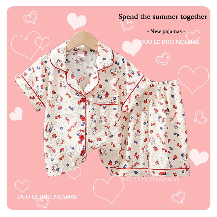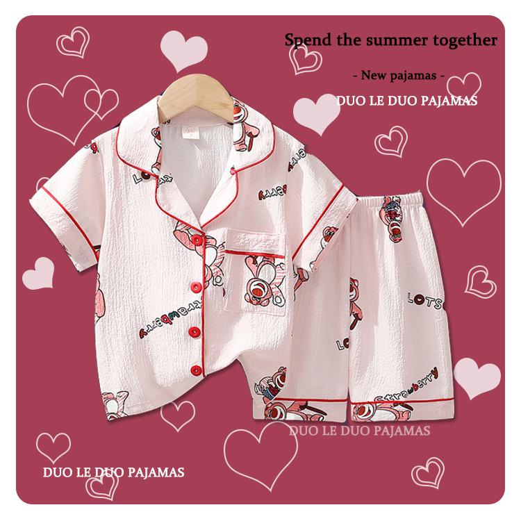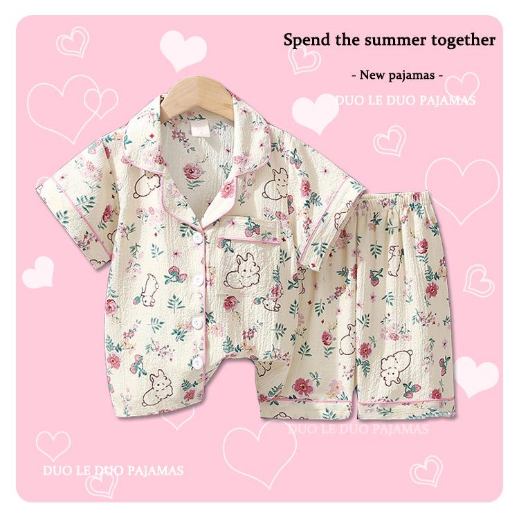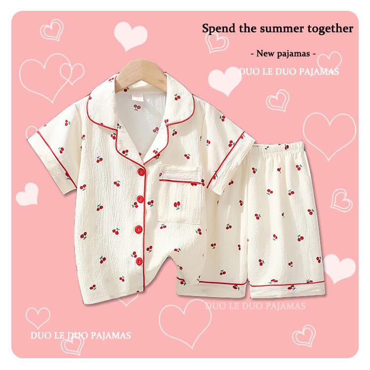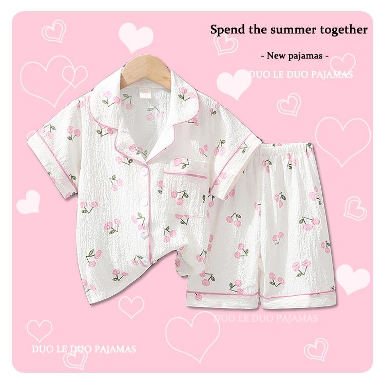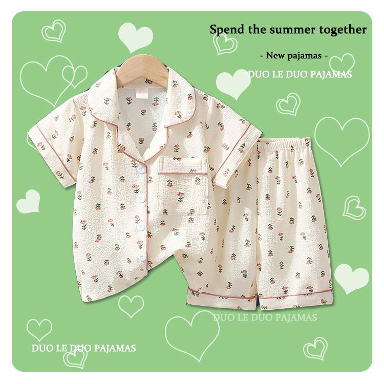 Pijamas de verano para niñas, cárdigan de solapa con burbujas de algodón, pantalones cortos de manga corta, traje de estilo coreano, ropa de hogar dulce para padres e hijos