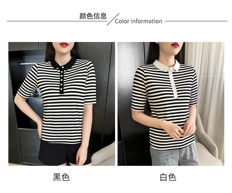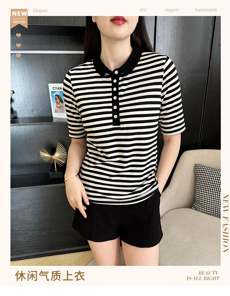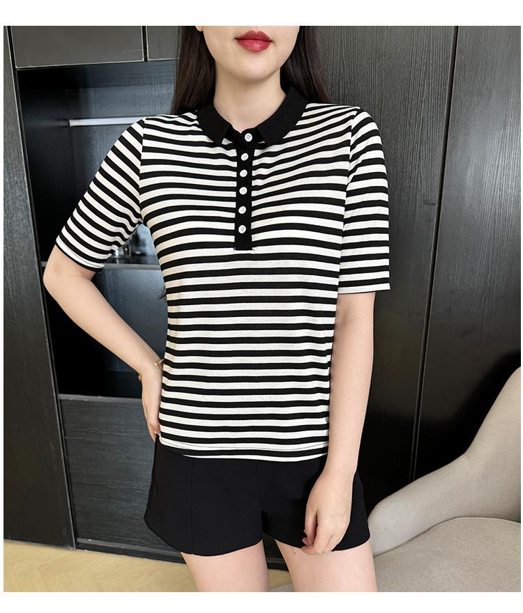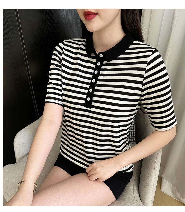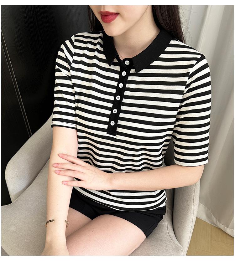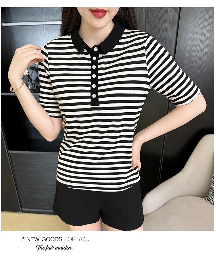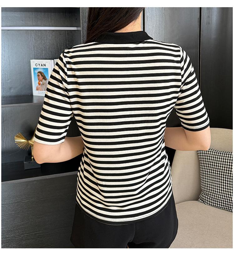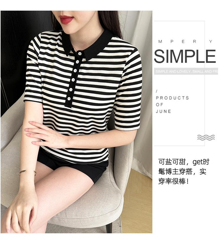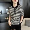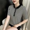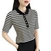 Camiseta informal de manga corta con cuello tipo polo y hombros descubiertos para mujer, de algodón, a rayas blancas y negras, de verano 2024