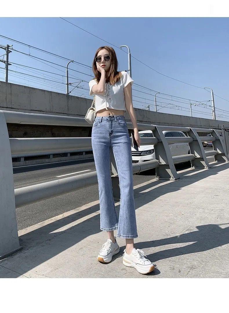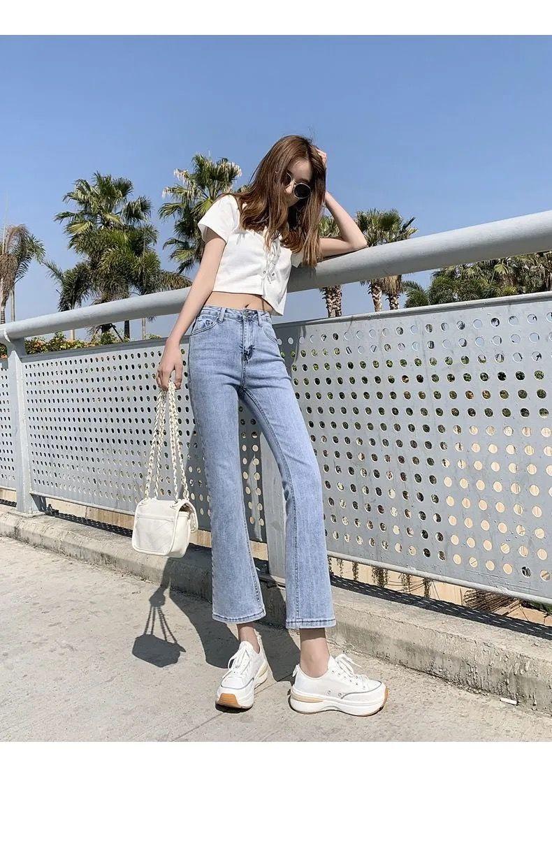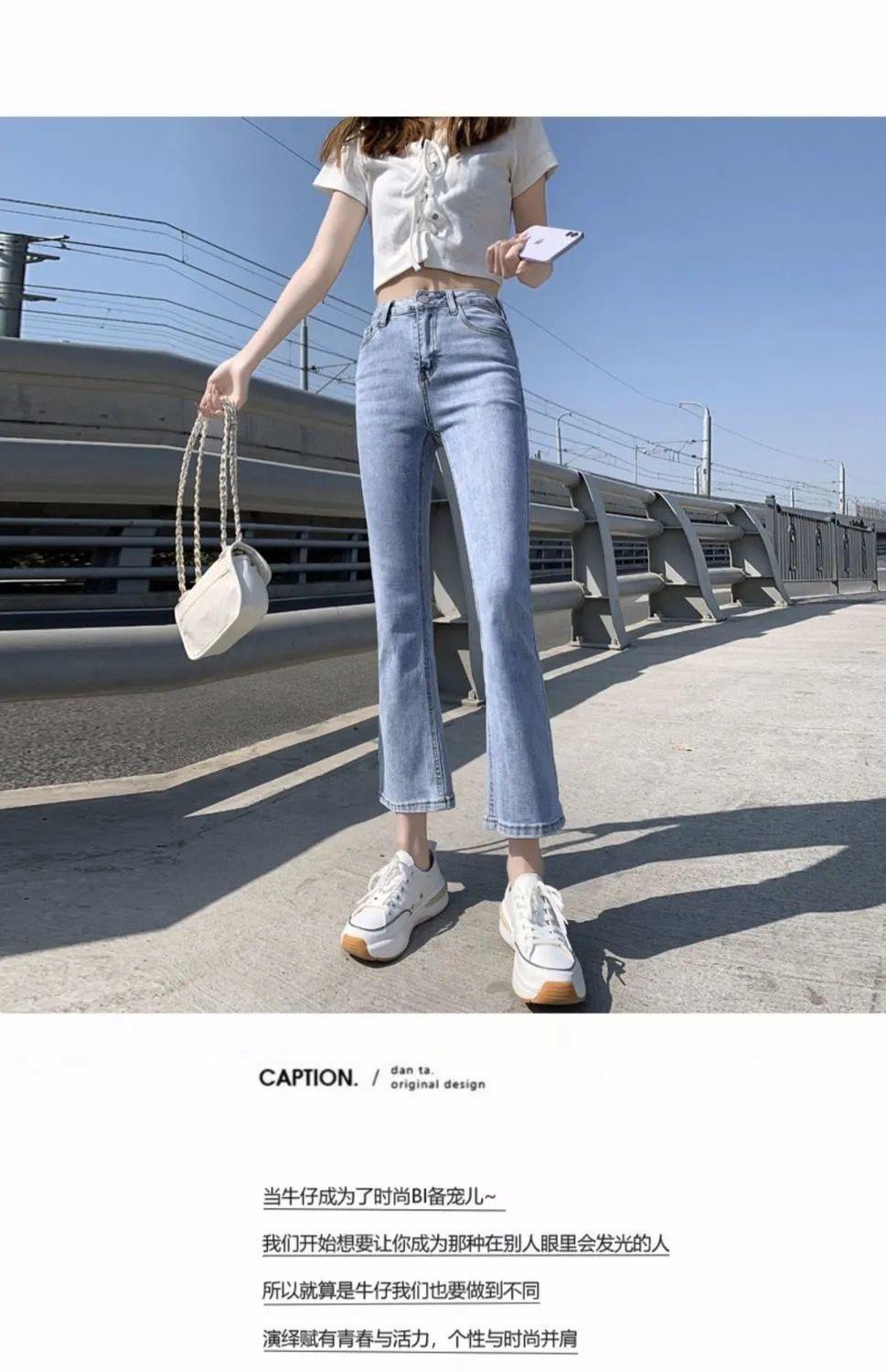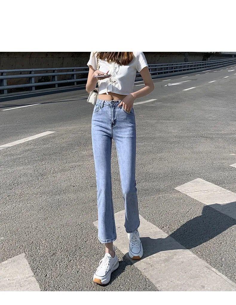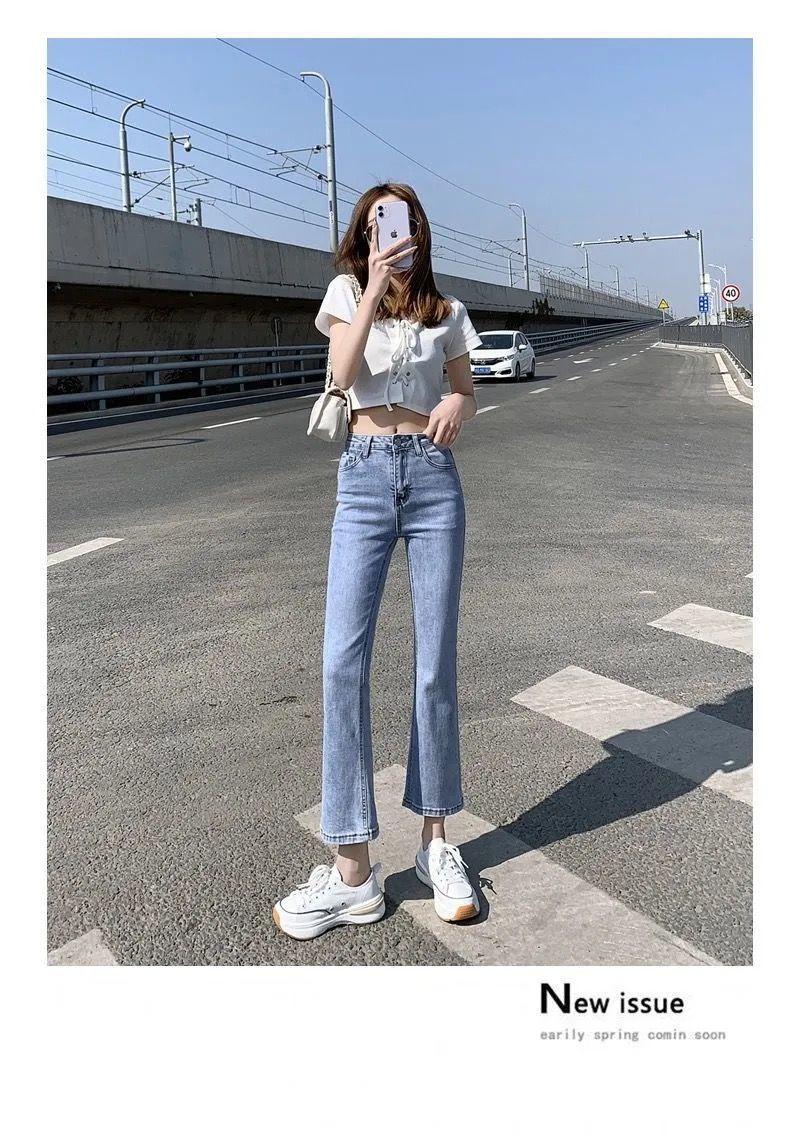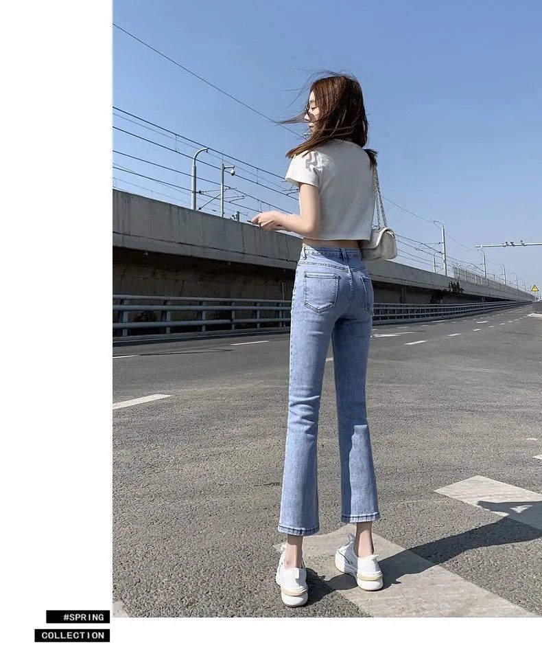 Jeans acampanados de color claro para mujer, pierna recta 2022 nuevo primavera y otoño para mujer americanos de cintura alta ajustados pantalones acampanados de nueve puntos