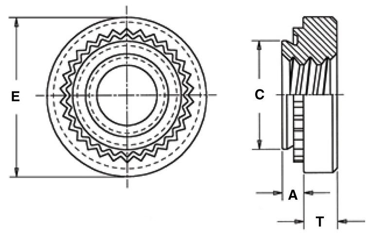 La tuerca autoajustable, también conocida como tuerca remachable o tuerca autoajustable, se utiliza en placas delgadas o láminas metálicas. Tiene forma redonda con dientes grabados y ranuras guía en un extremo. El principio consiste en presionar los dientes grabados en el orificio preajustado de la lámina metálica. Generalmente, la abertura del orificio preajustado es ligeramente menor que la de los dientes grabados de la tuerca autoajustable. La presión hace que los dientes de la tuerca autoajustable se presionen contra la placa, provocando una deformación plástica alrededor del orificio. El objeto deformado se presiona contra la ranura guía, produciendo así un efecto de bloqueo. Las tuercas autoajustables se dividen en tuercas autoajustables de acero de corte rápido tipo S, tuercas autoajustables de acero inoxidable tipo CLS, tuercas autoajustables de hierro inoxidable tipo SP y tuercas autoajustables de cobre y aluminio tipo CLA, según el material, que se utilizan en diferentes entornos de uso. Las especificaciones suelen ser de M2 a M12, n.° 256-5/16-24. No existe un estándar nacional unificado para las tuercas autoblocantes, que se utilizan comúnmente en gabinetes de chasis, industrias de chapa metálica, etc.。