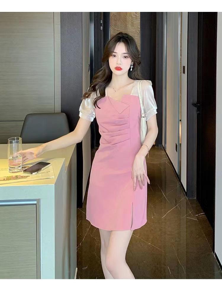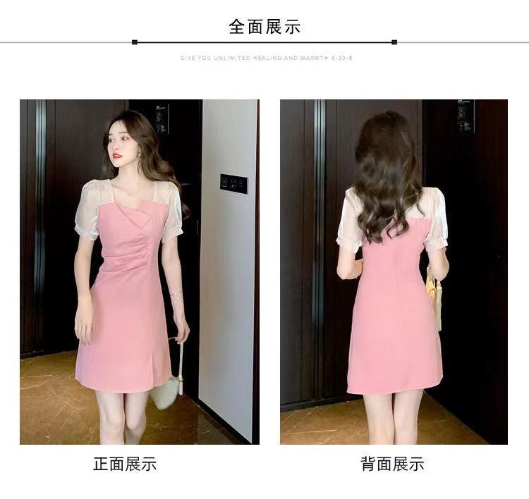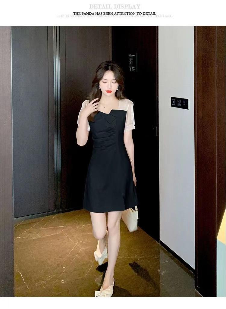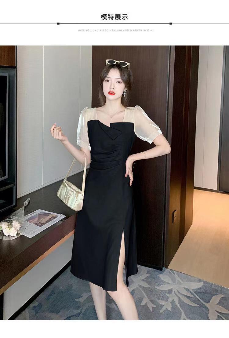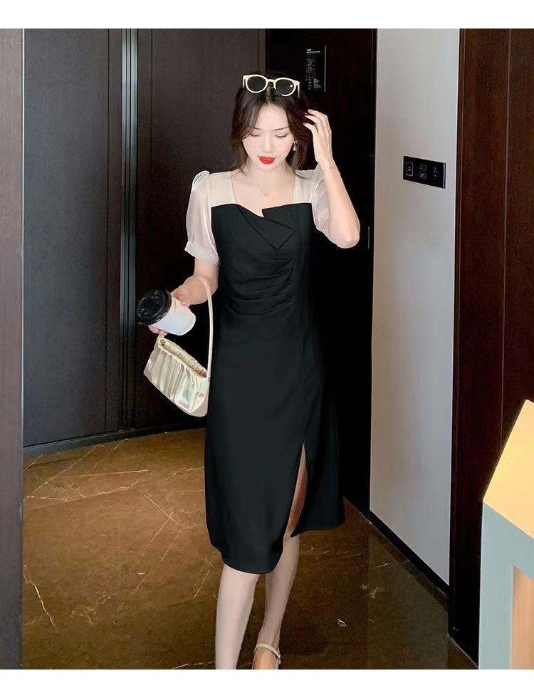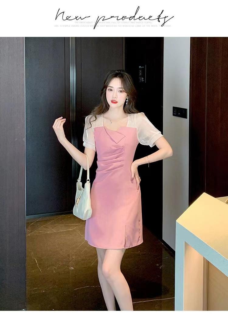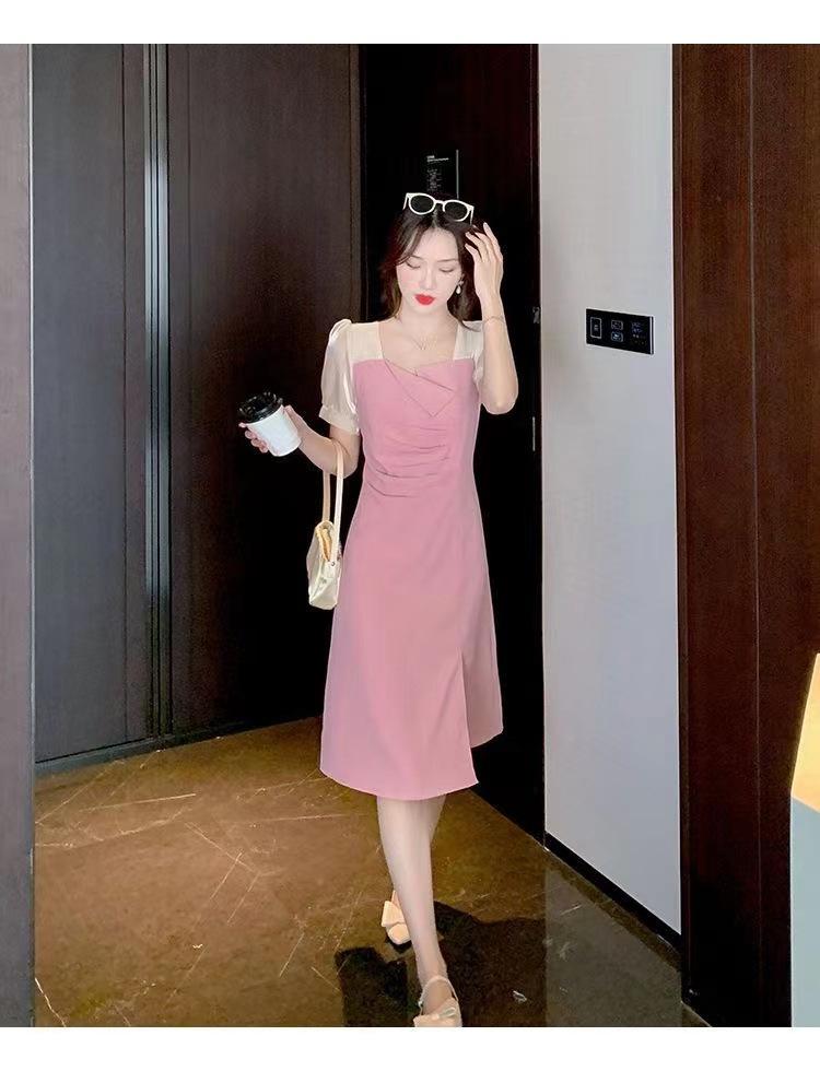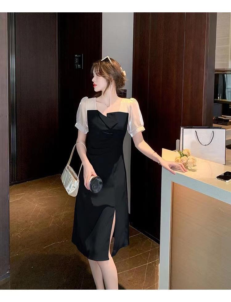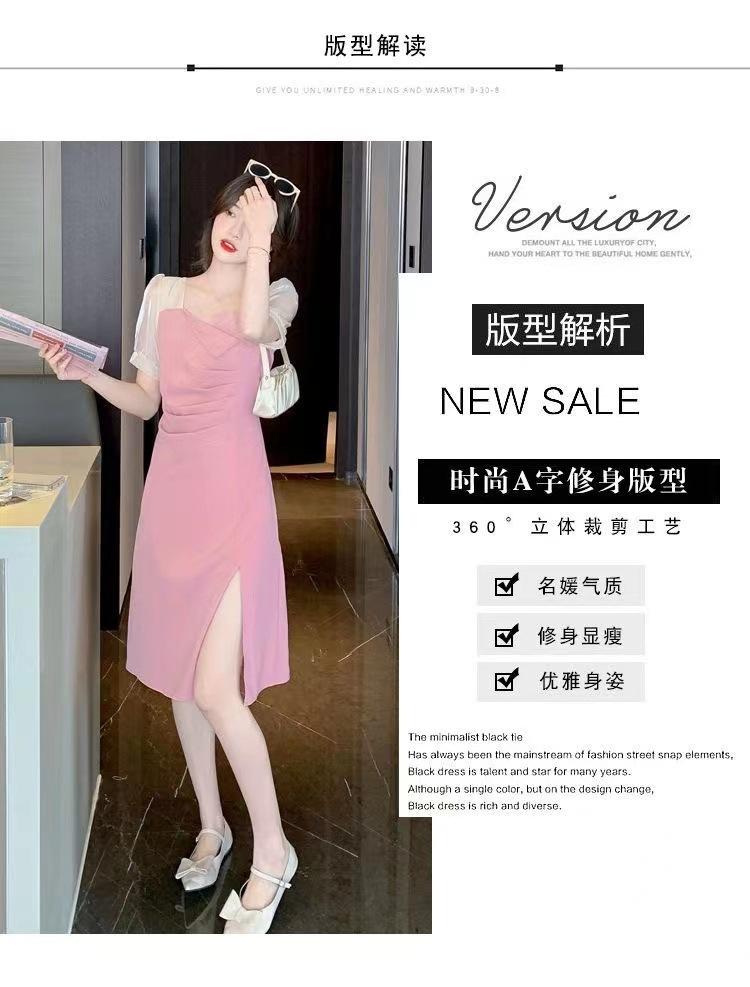 Vestido elegante de verano 2023 de estilo francés con escote en A, corte A, corte A, manga corta, estilo celebridad de internet, con costuras antiedad, plisado y abertura para mujer