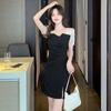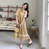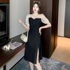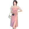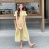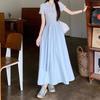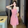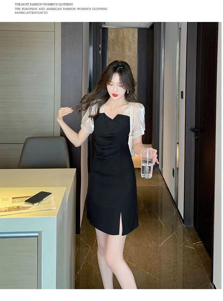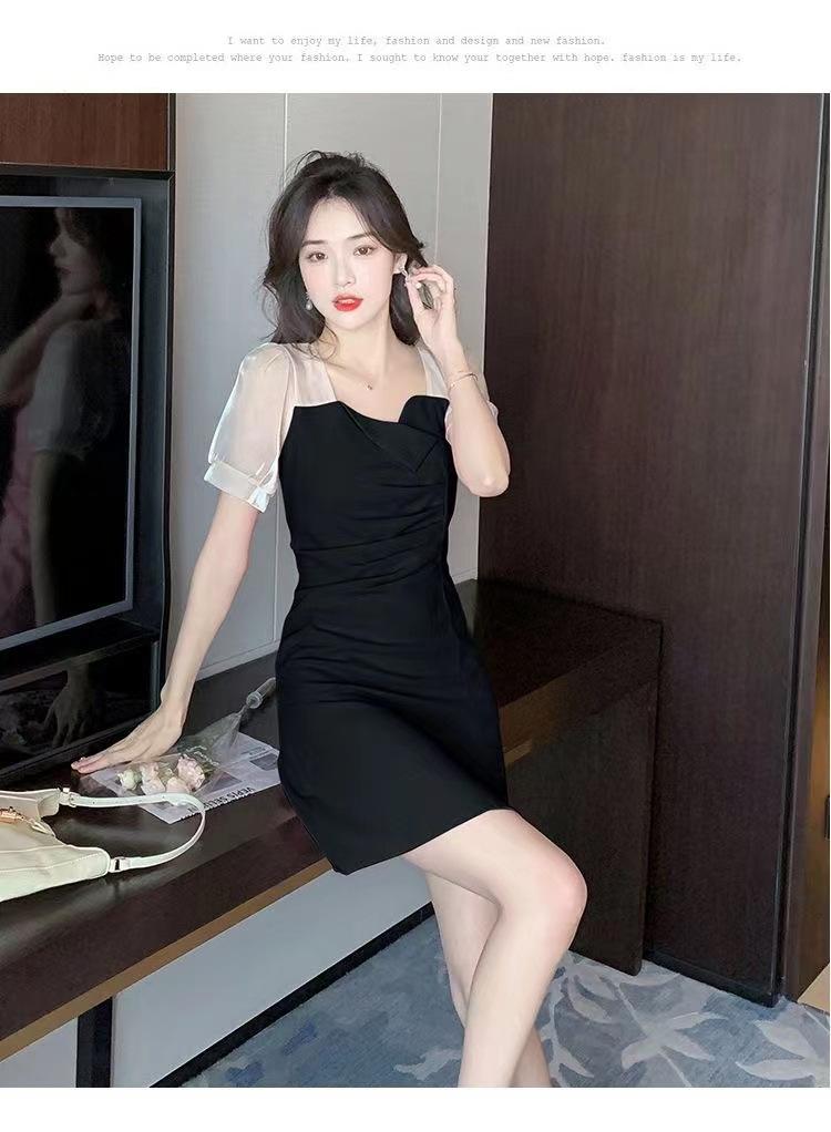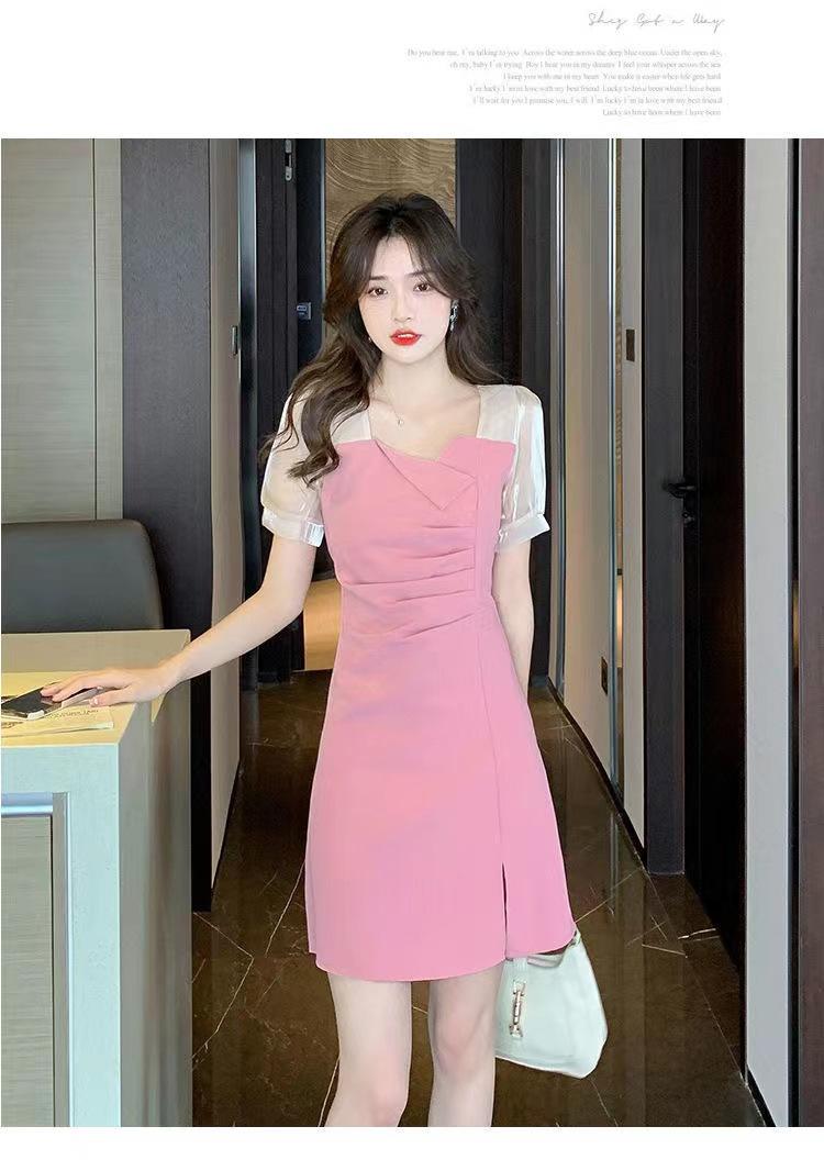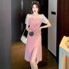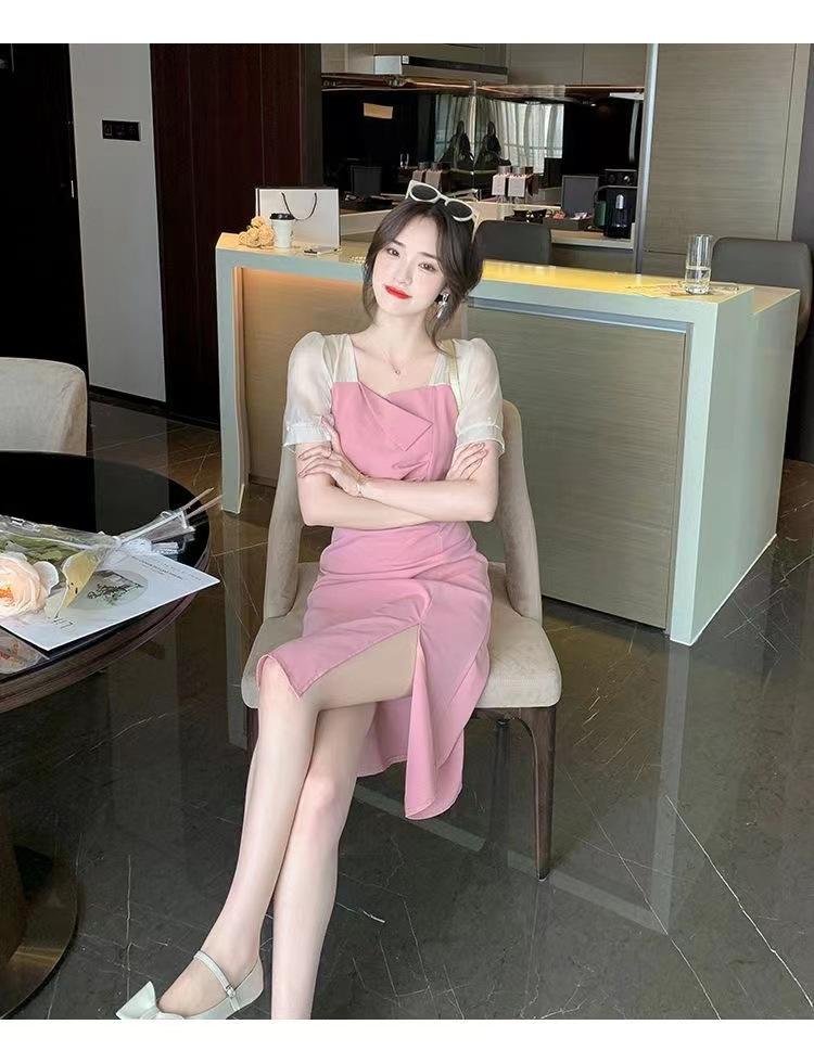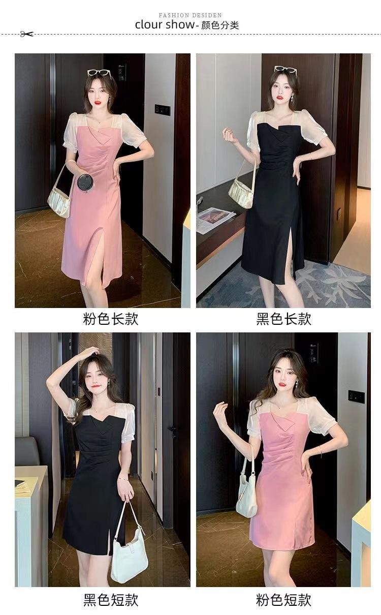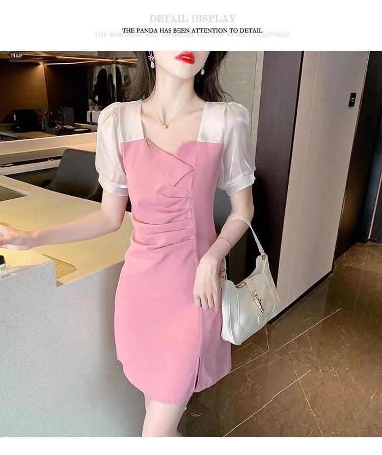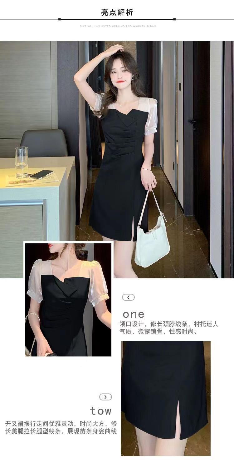 Vestido elegante de verano 2023 de estilo francés con escote en A, corte A, corte A, manga corta, estilo celebridad de internet, con costuras antiedad, plisado y abertura para mujer