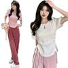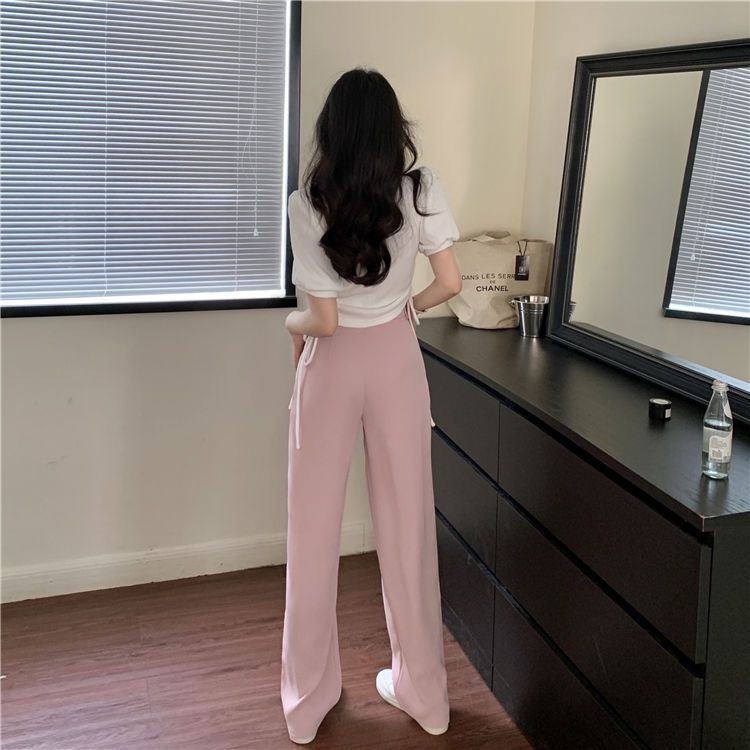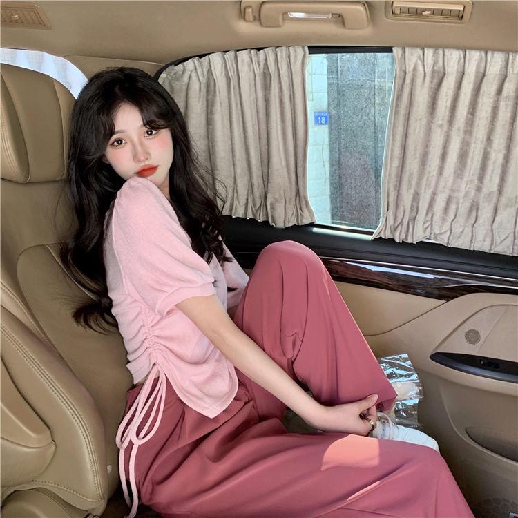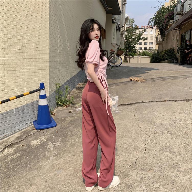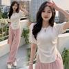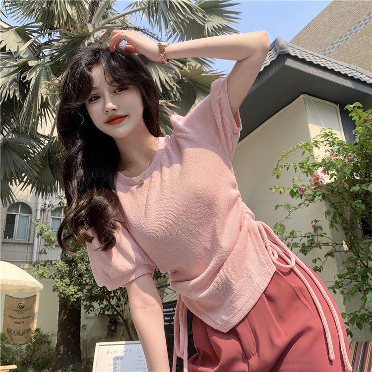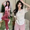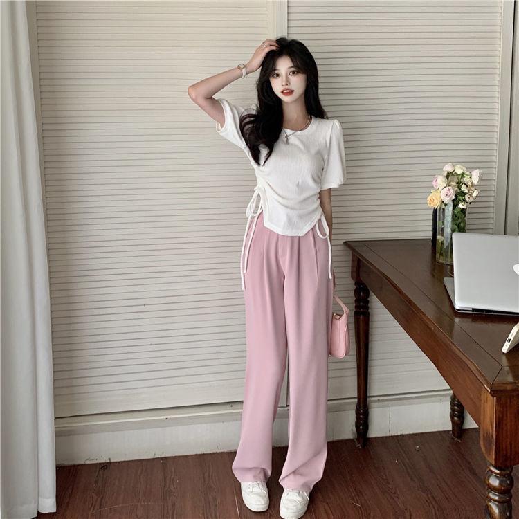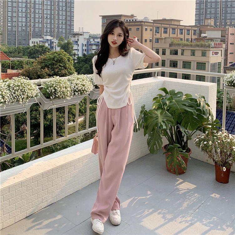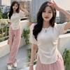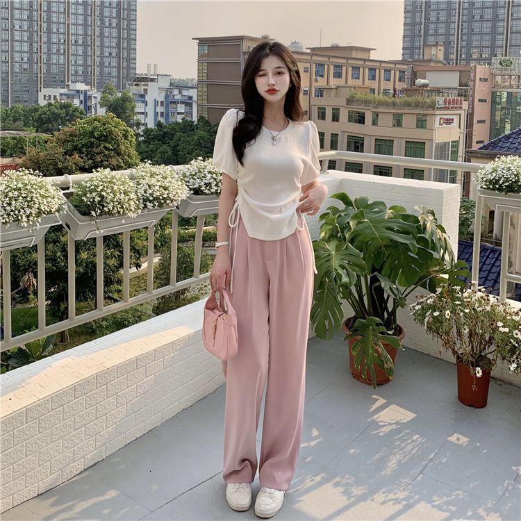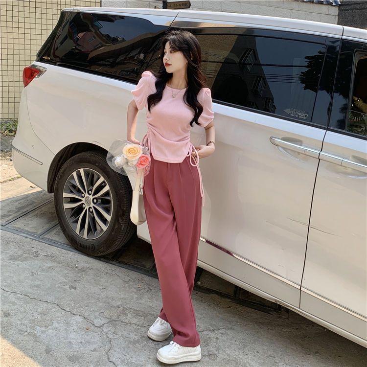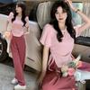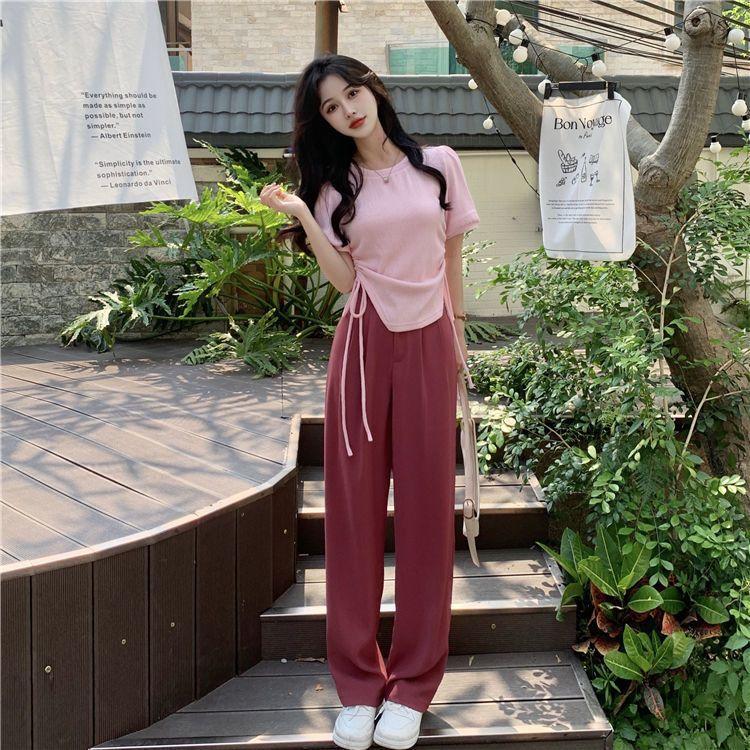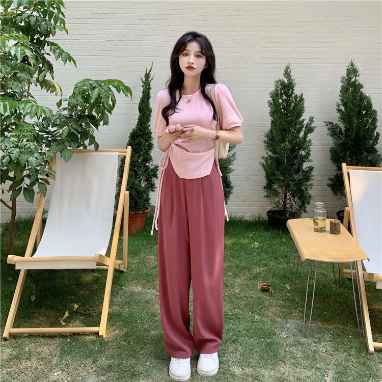 Estilo Americano Popular en Internet Verano Spice Girl Traje Casual Camiseta de Manga Corta con Cordón y Burbuja para Mujer Pantalones de Pierna Ancha para Mujer Conjunto de Moda de Dos Piezas