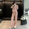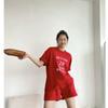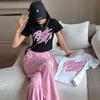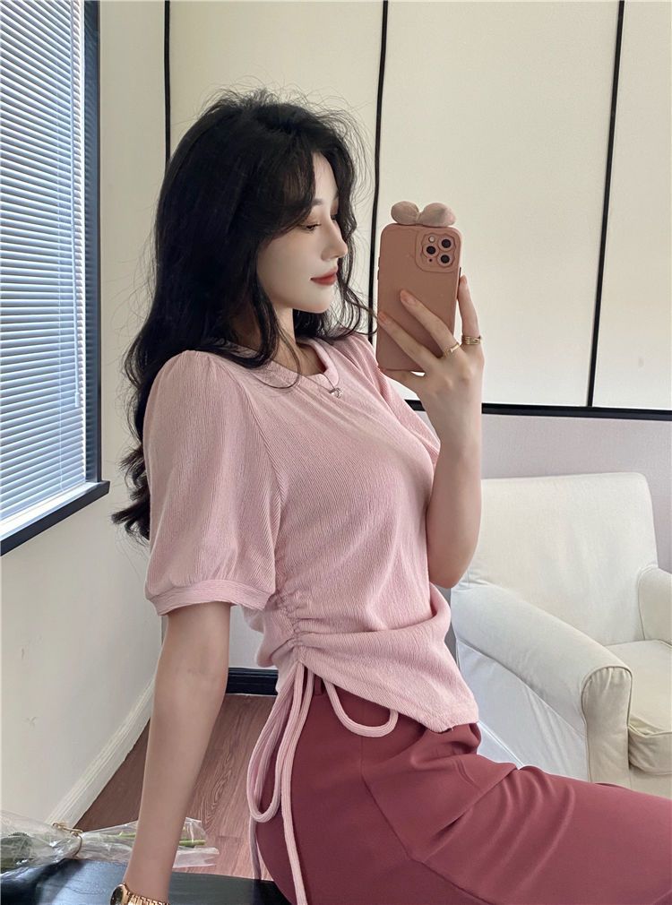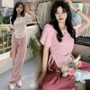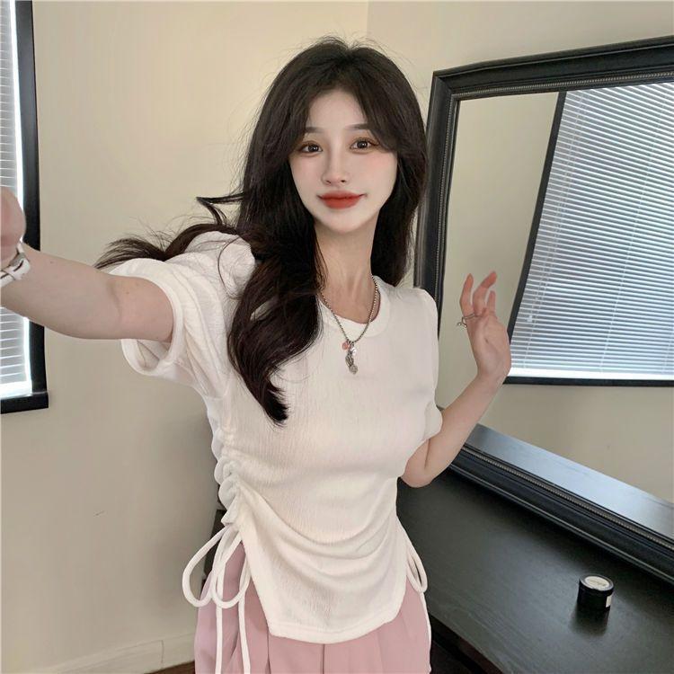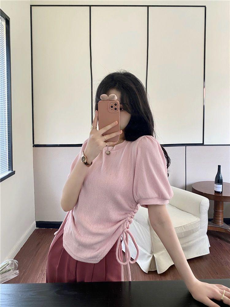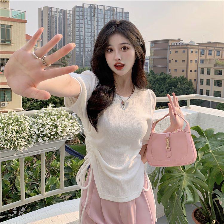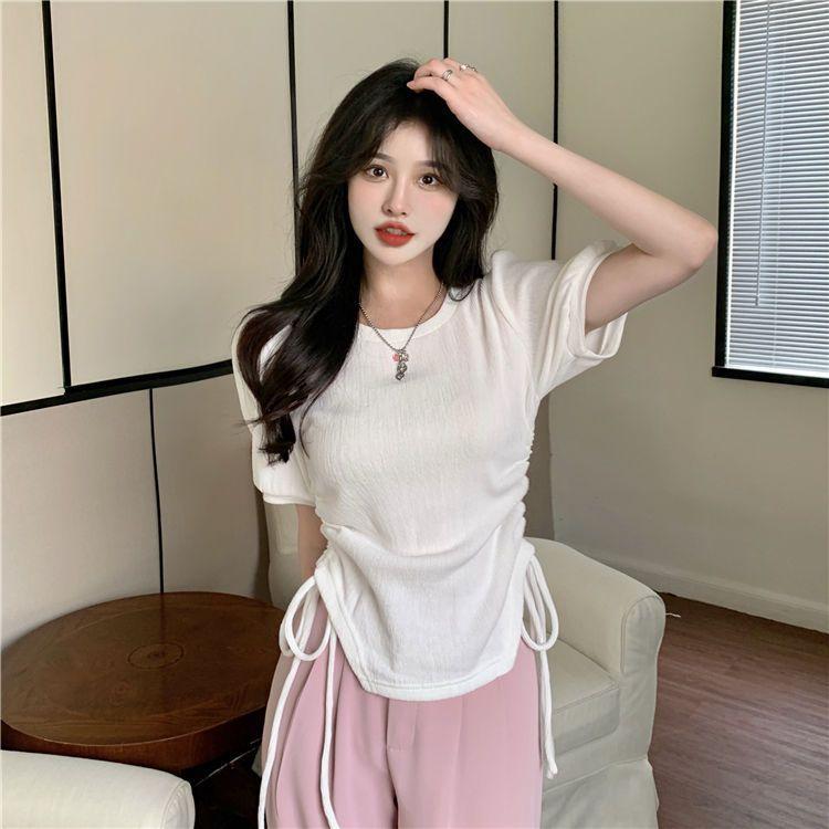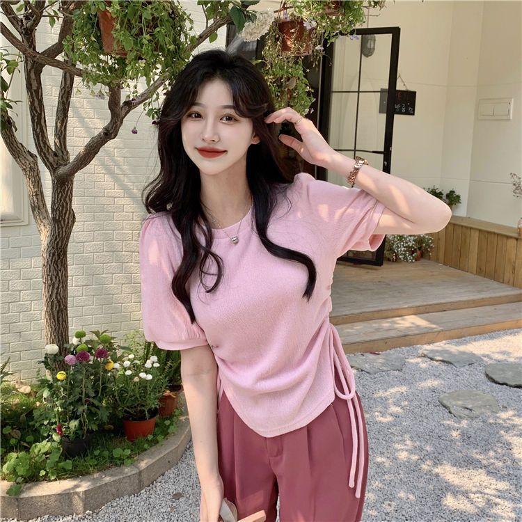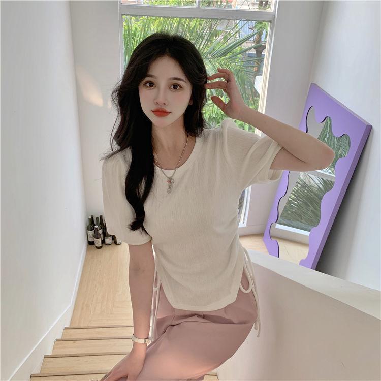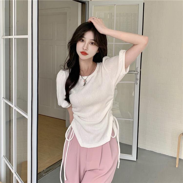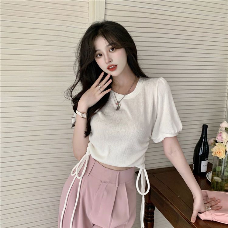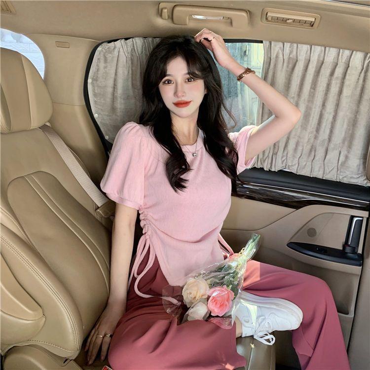 Estilo Americano Popular en Internet Verano Spice Girl Traje Casual Camiseta de Manga Corta con Cordón y Burbuja para Mujer Pantalones de Pierna Ancha para Mujer Conjunto de Moda de Dos Piezas