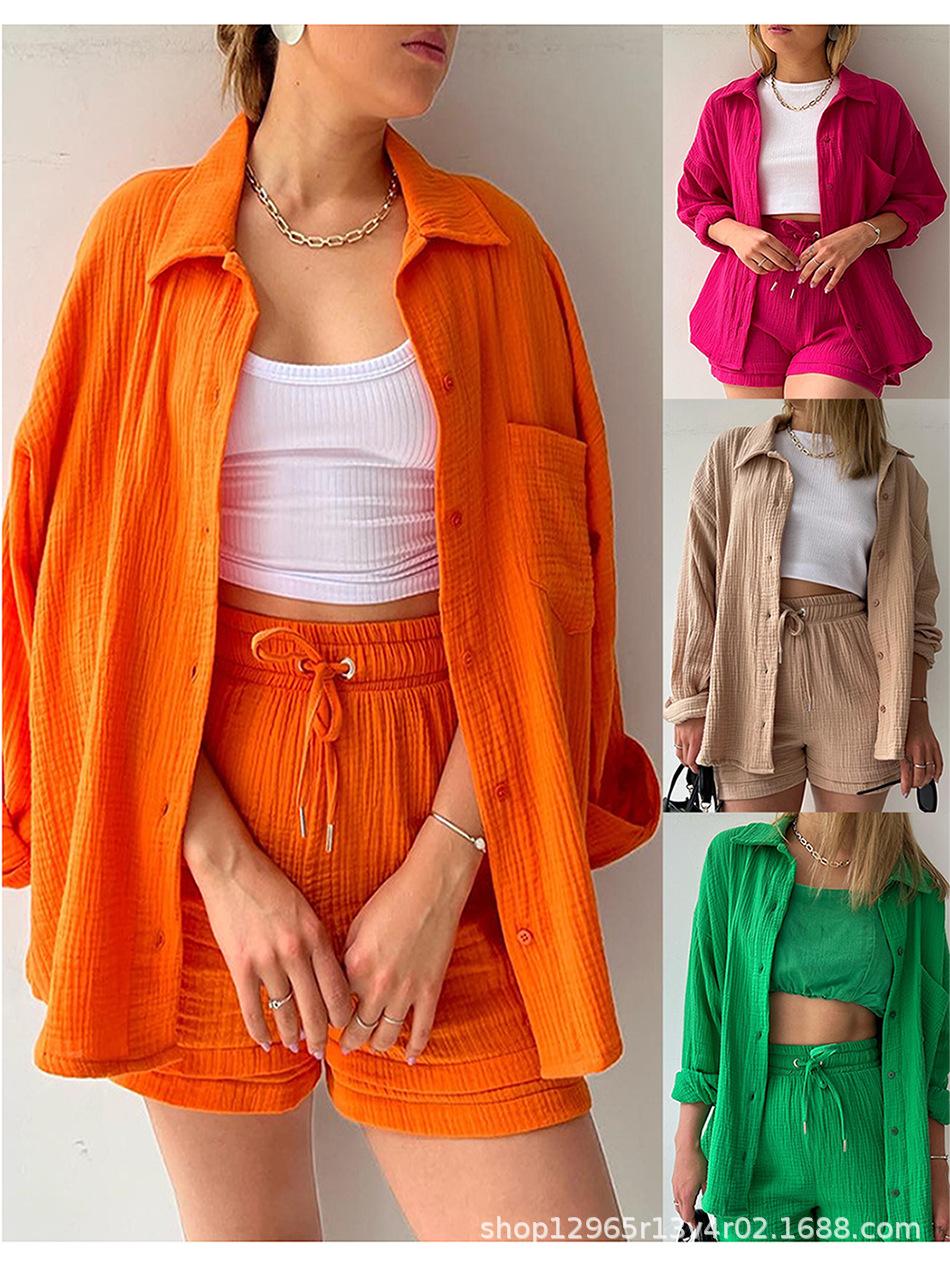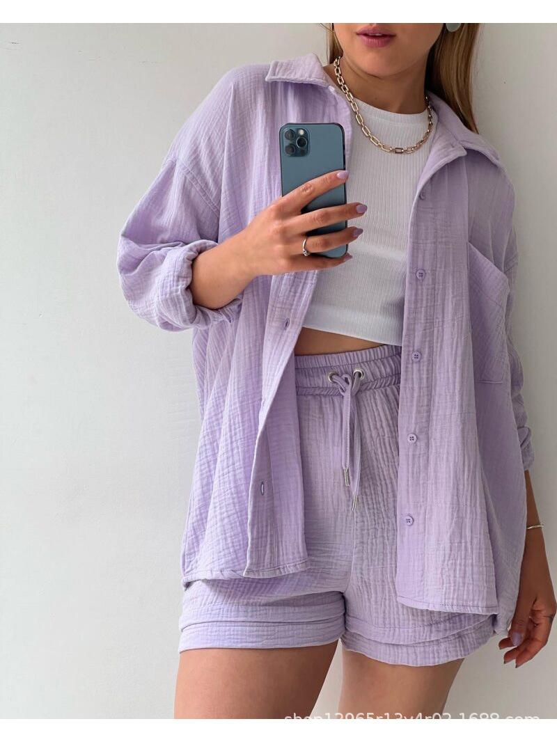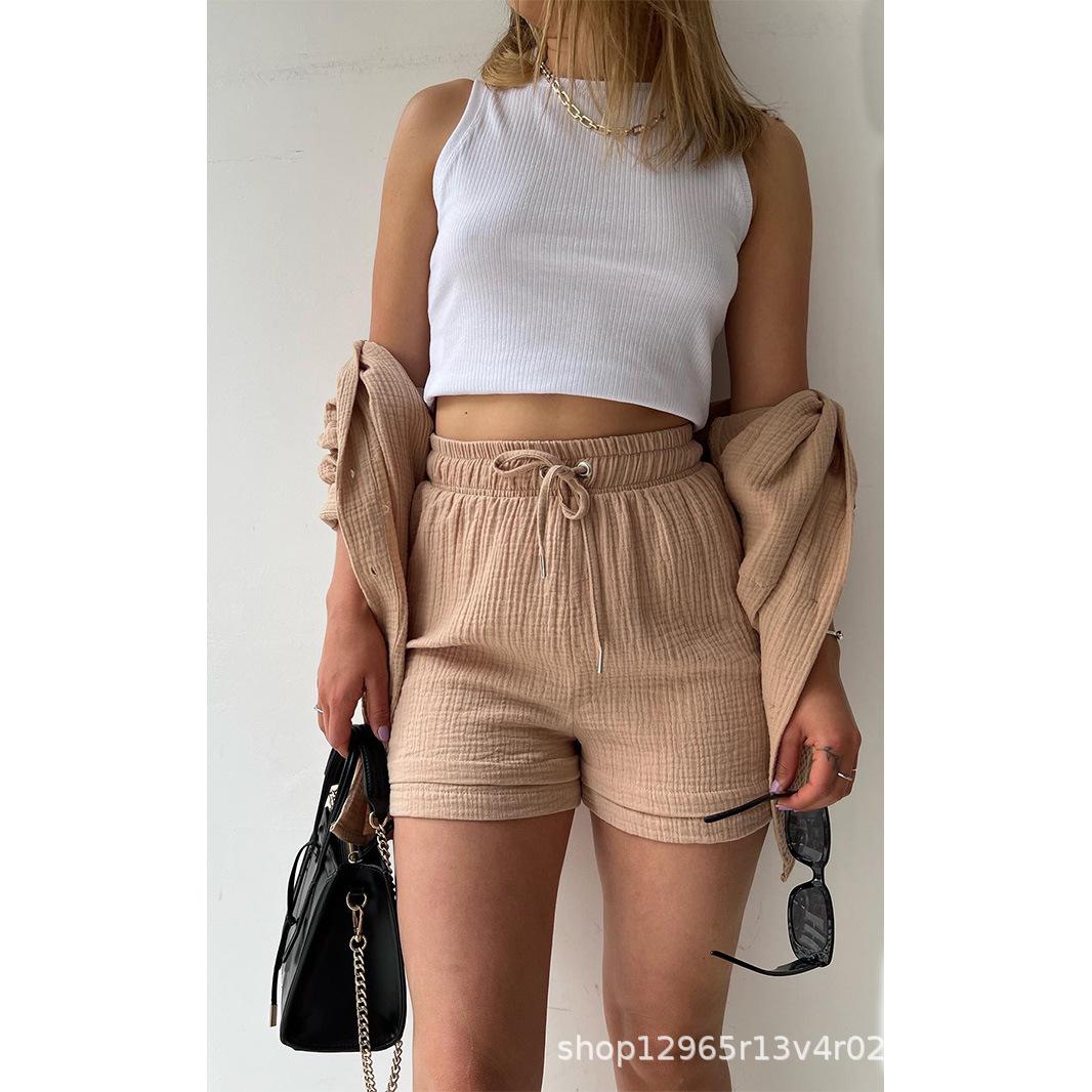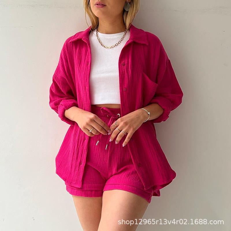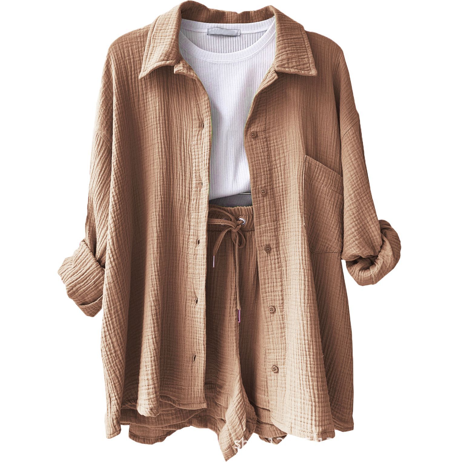 Nuevo traje casual de moda para mujer de dos piezas transfronterizo, camisa de algodón de manga larga con solapa de volantes y shorts con cordón
