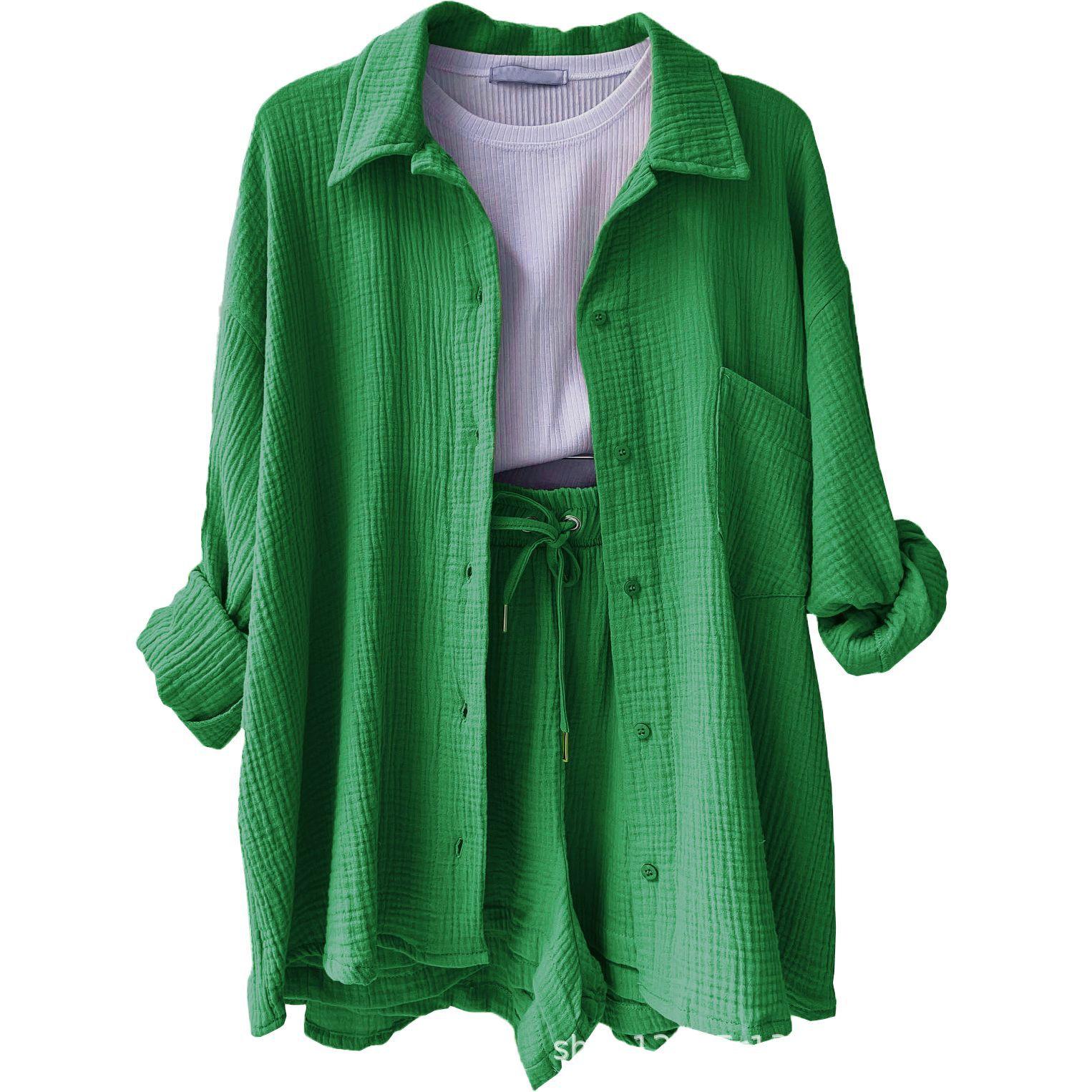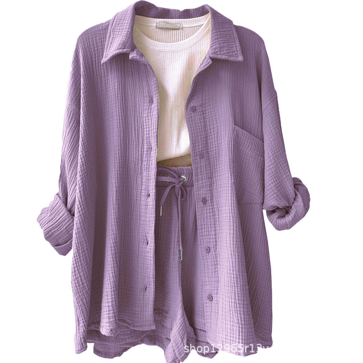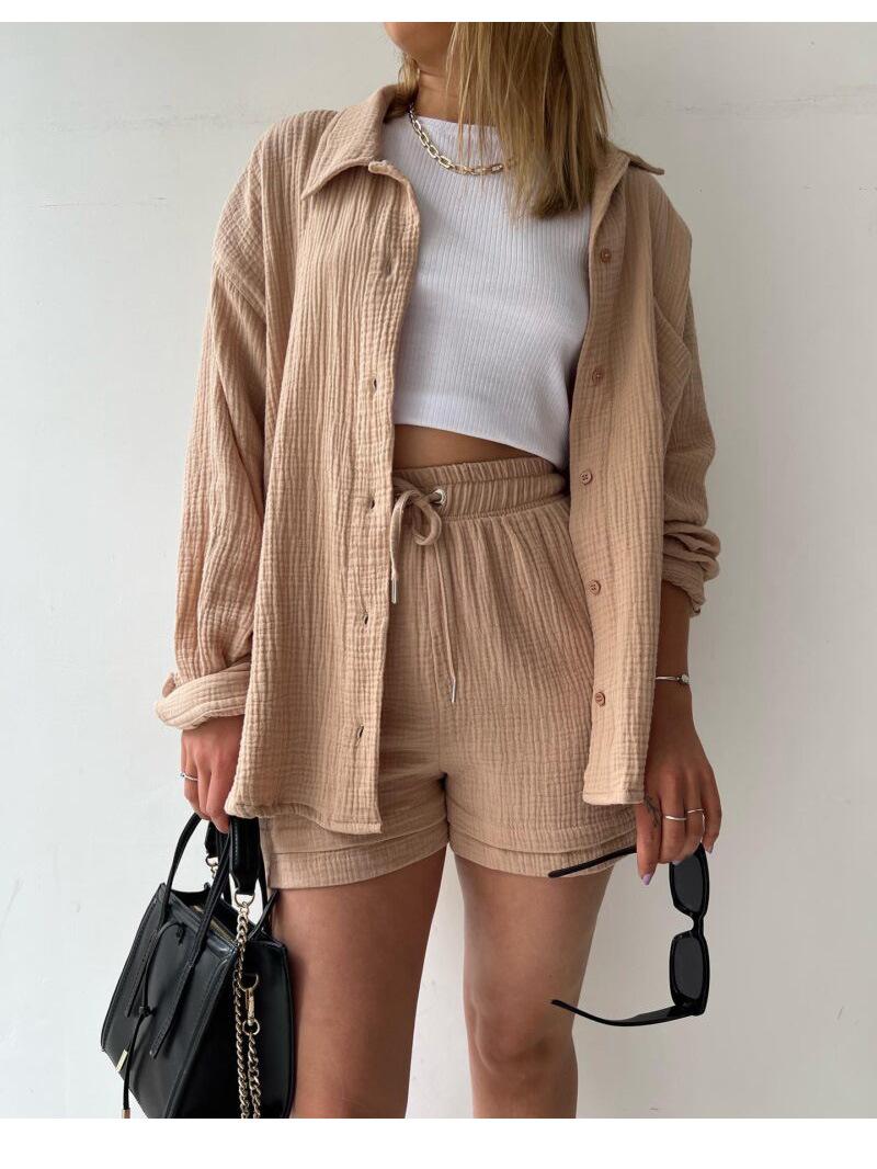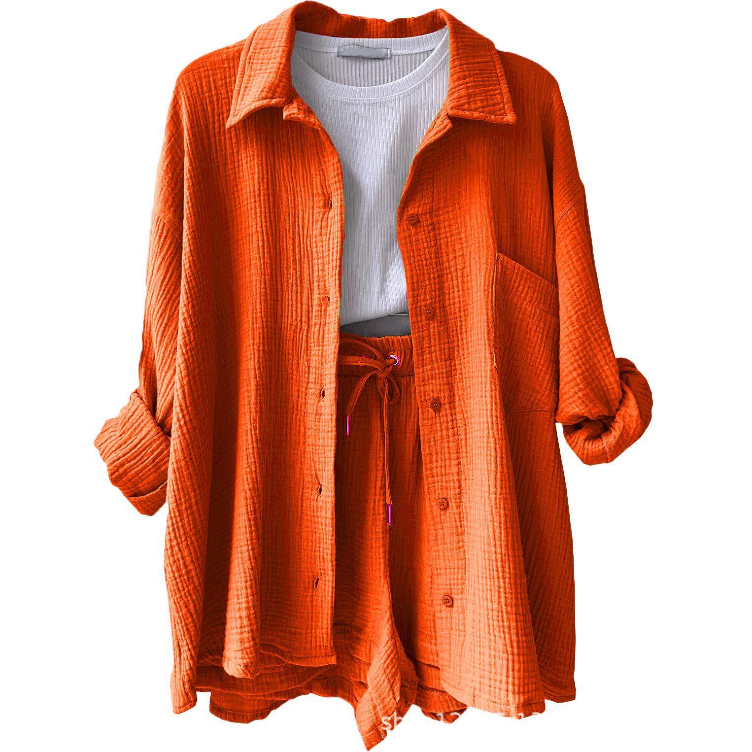 Nuevo traje casual de moda para mujer de dos piezas transfronterizo, camisa de algodón de manga larga con solapa de volantes y shorts con cordón