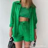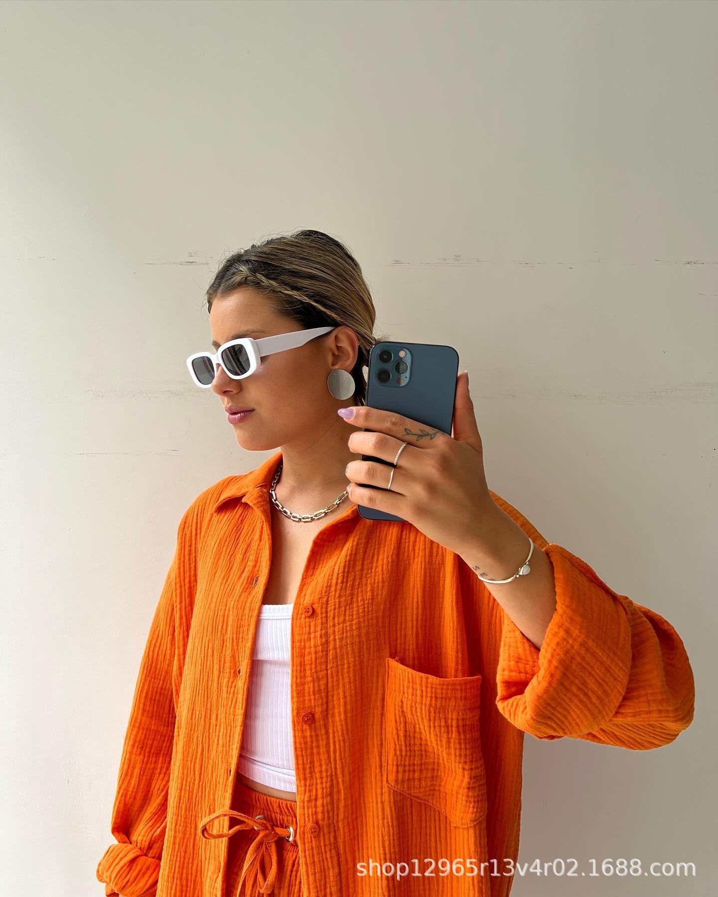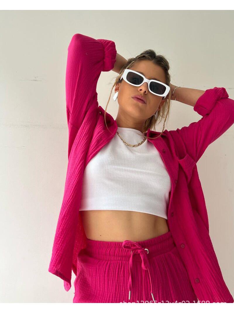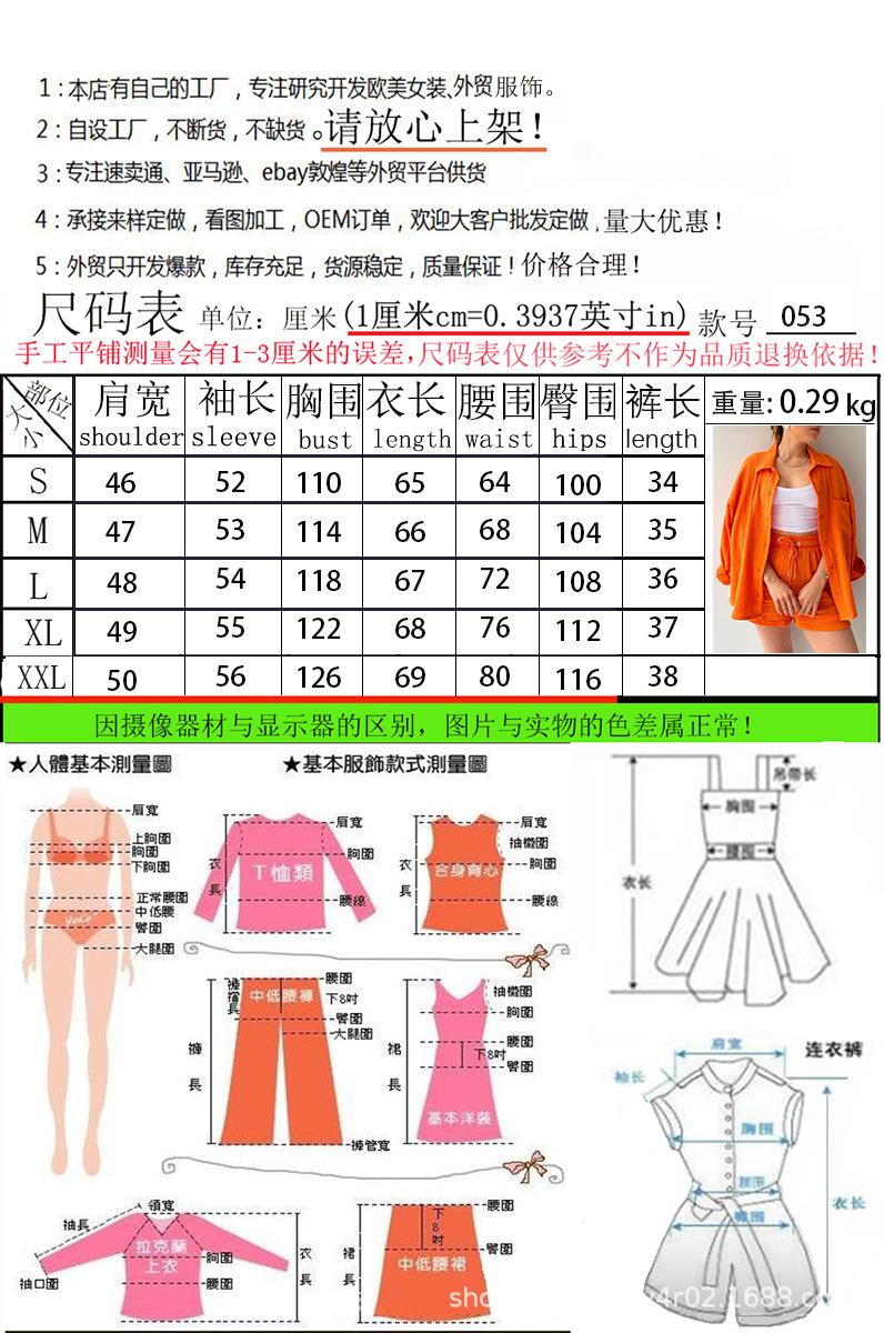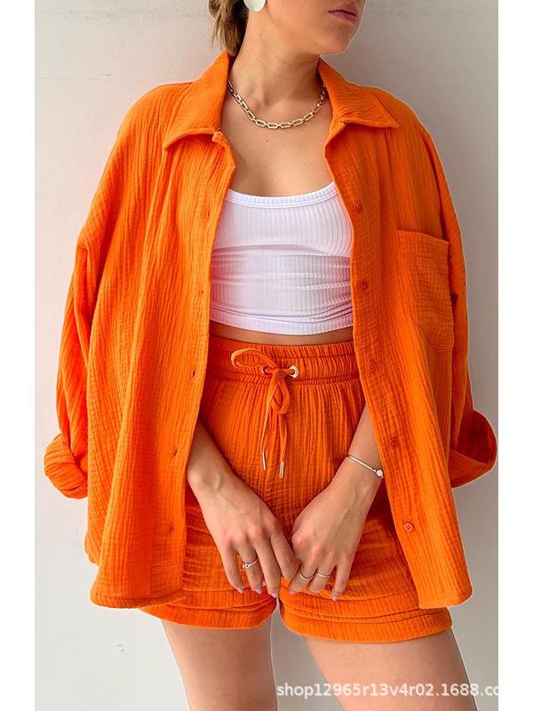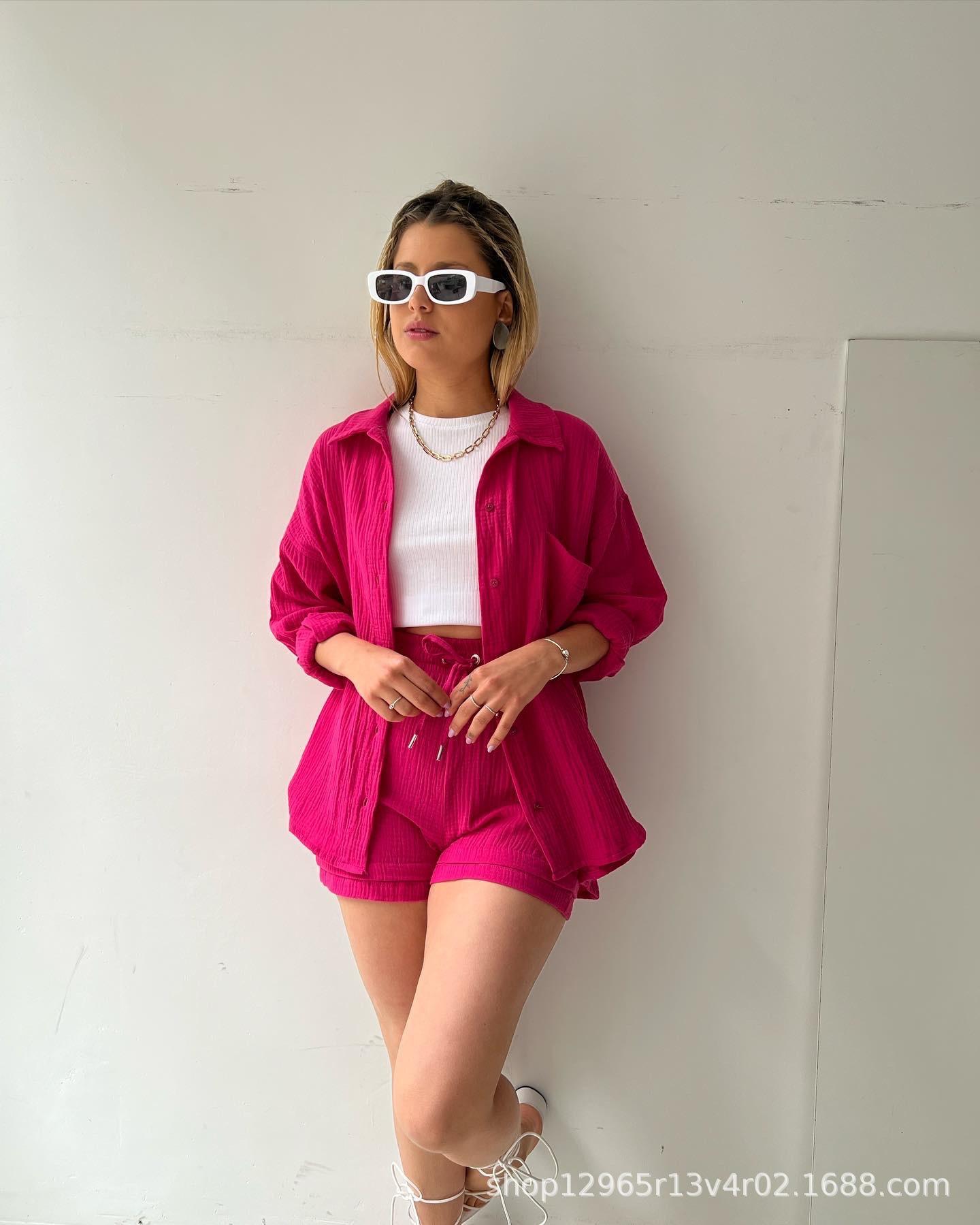 Nuevo traje casual de moda para mujer de dos piezas transfronterizo, camisa de algodón de manga larga con solapa de volantes y shorts con cordón