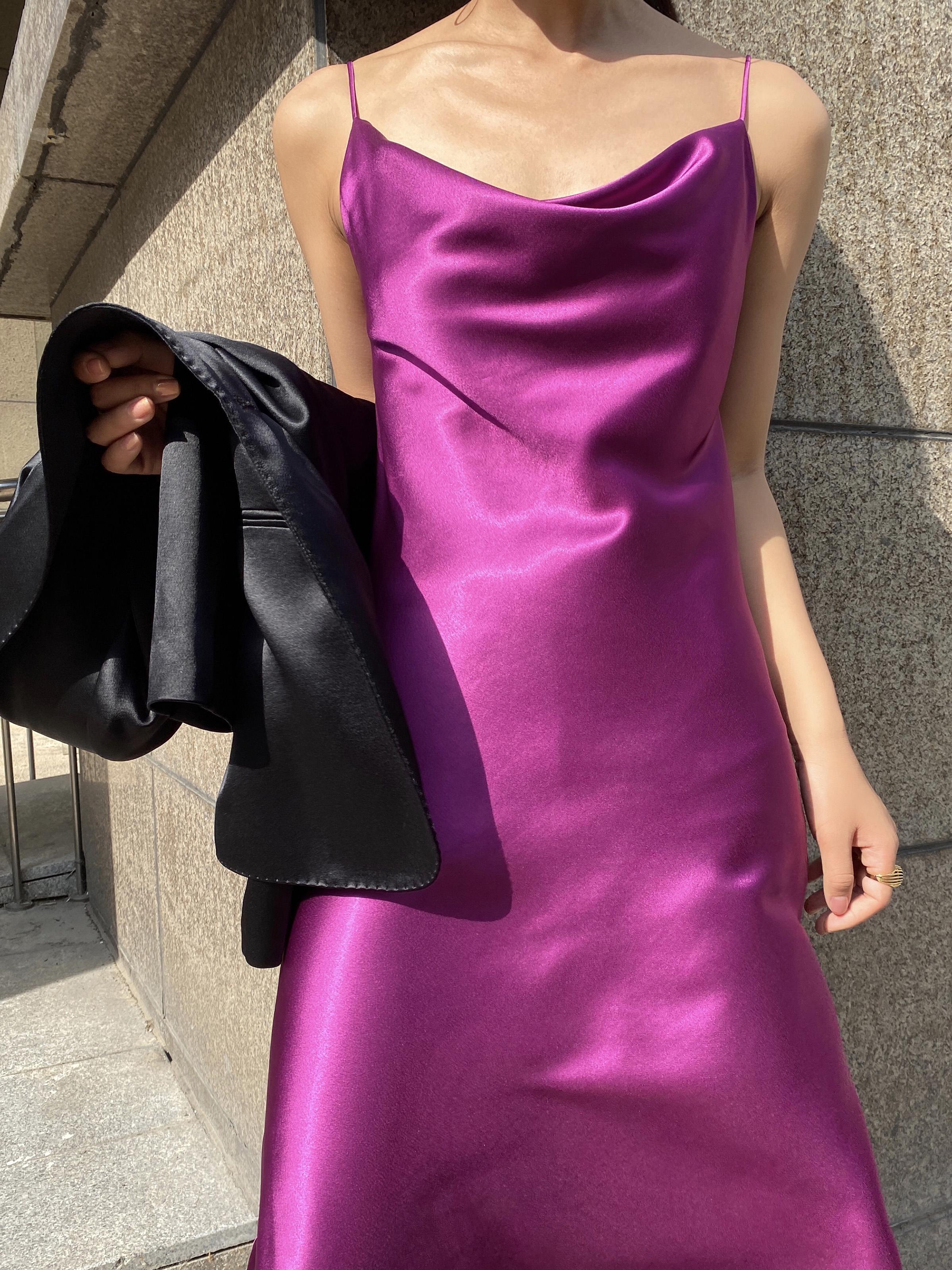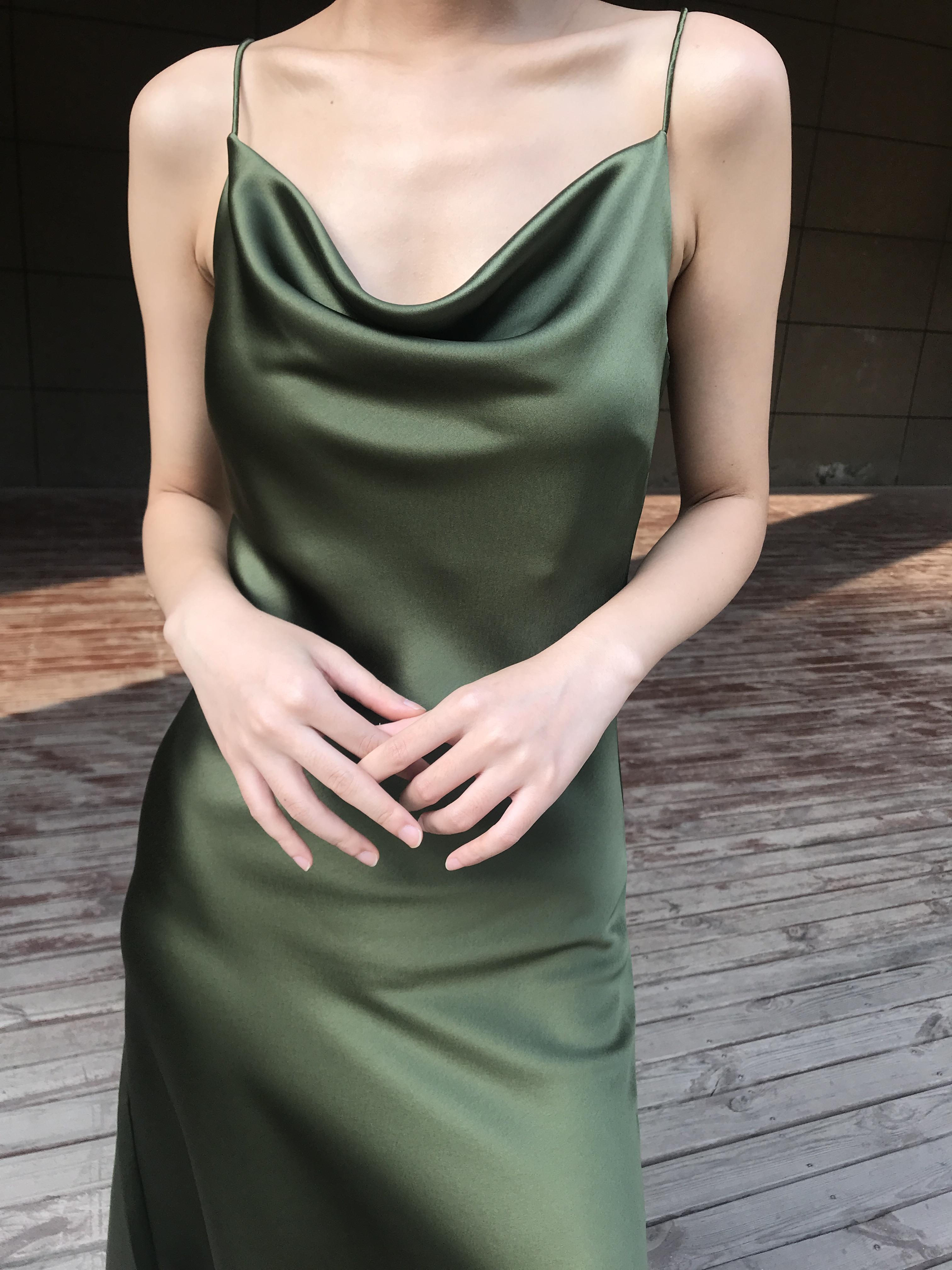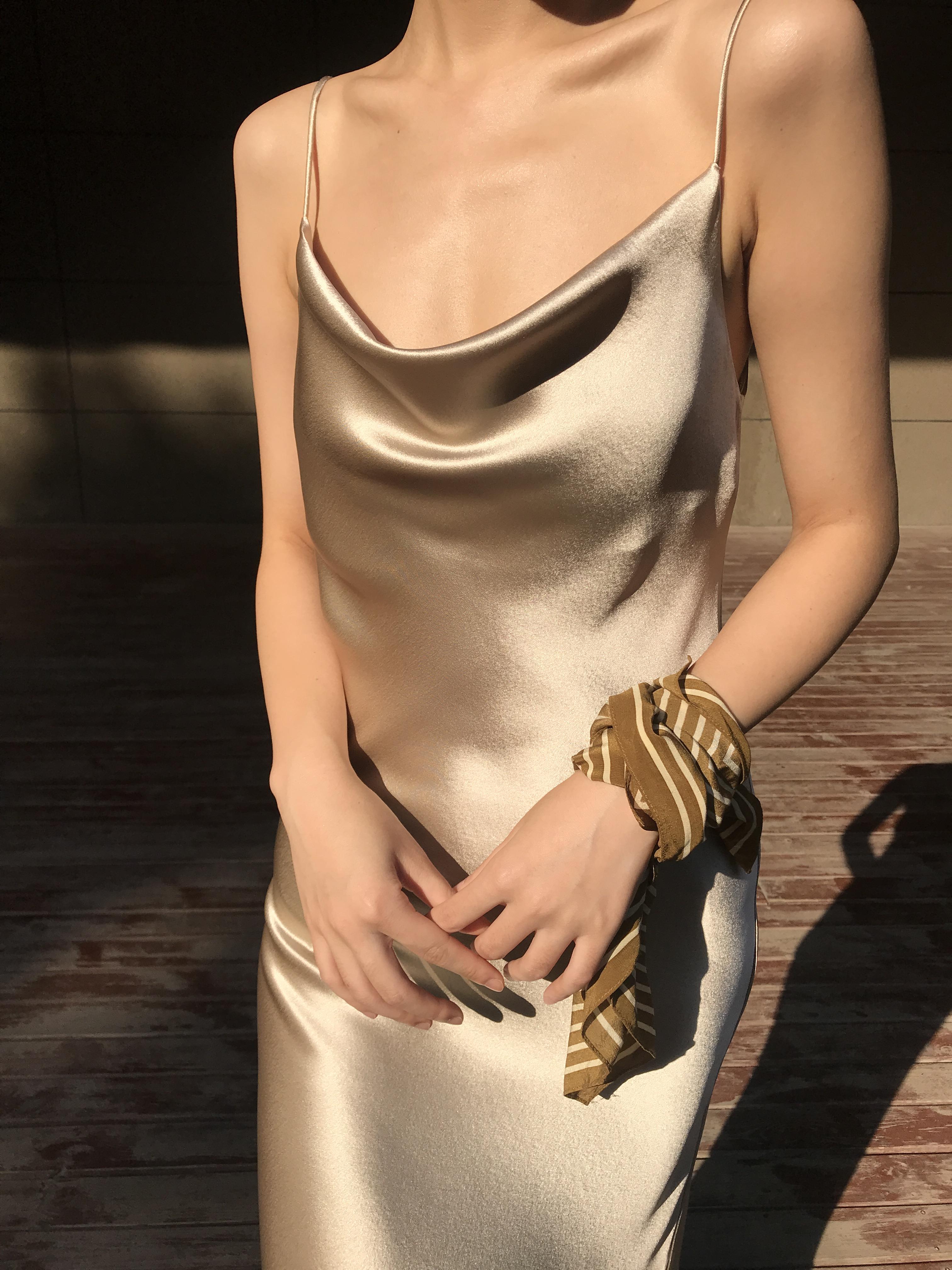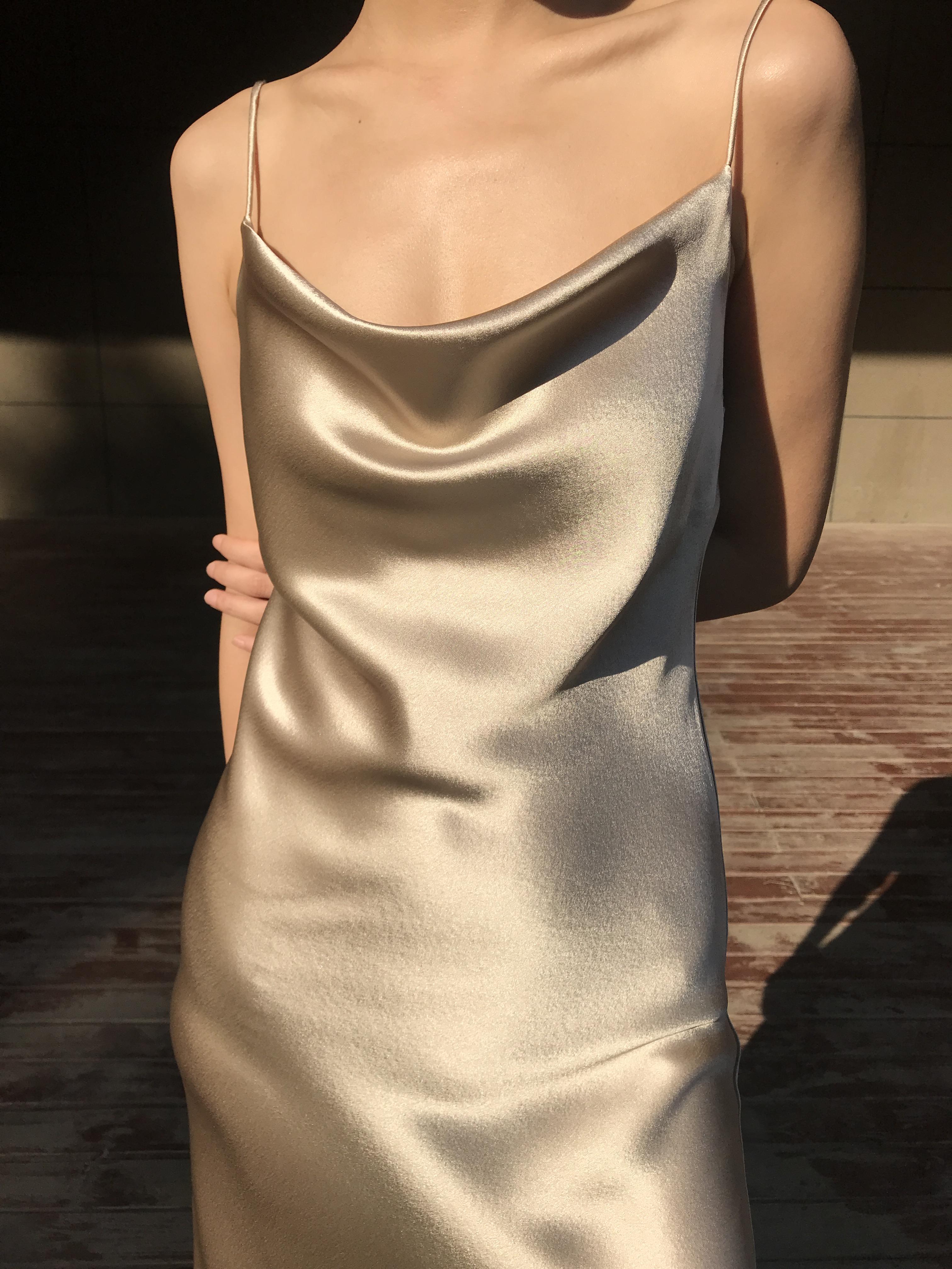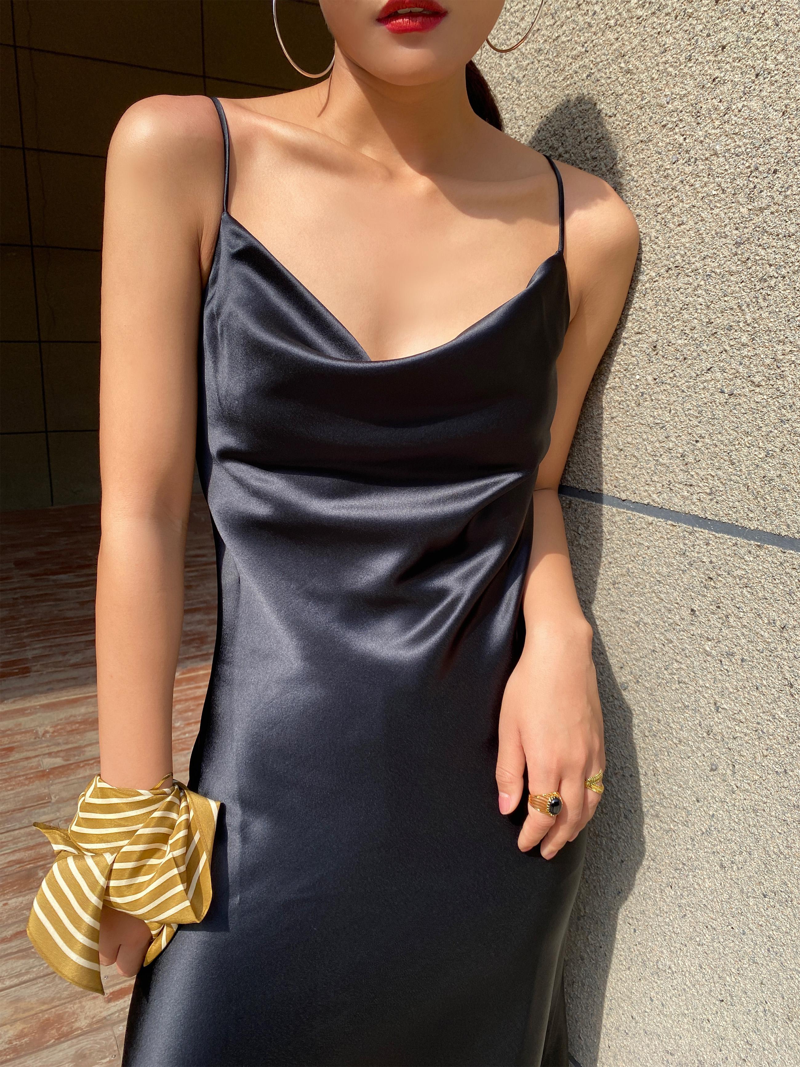 La combinación del escote caído y los tirantes finos es muy de alta gama.